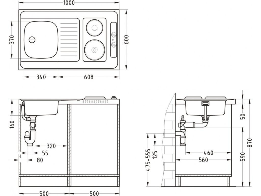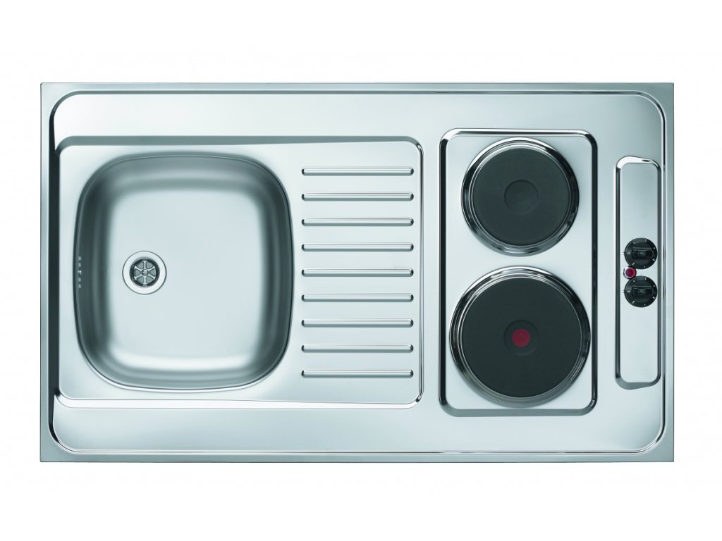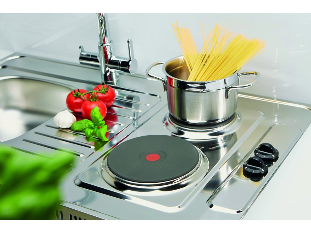 celoplošný nerezový drez s varnou elektrickou dvojplatničkou