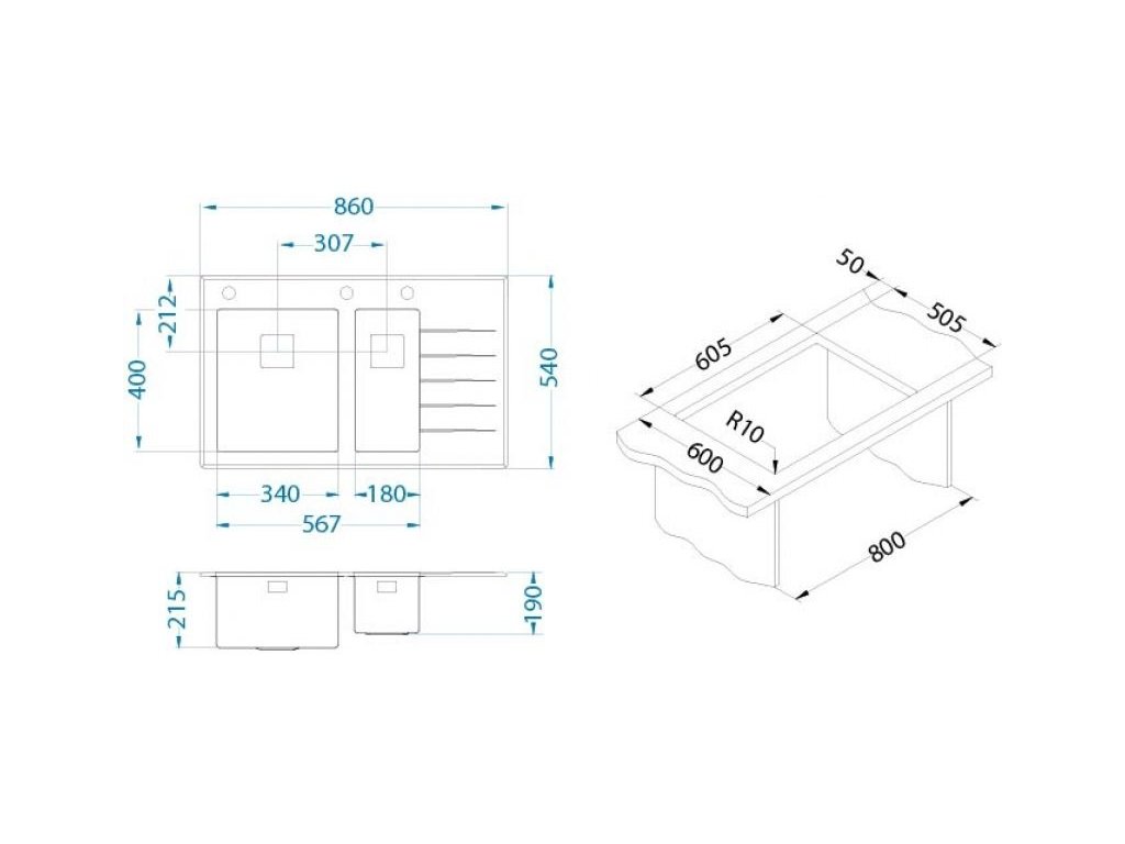 kuchynský sklenený drez s nerez vaničkami - pravý
