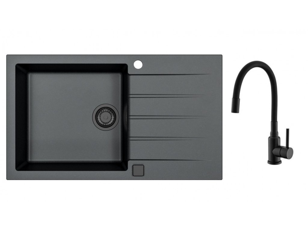 kuchynský SET : granitový čierny drez s čiernou batériou s flexi ramenom
