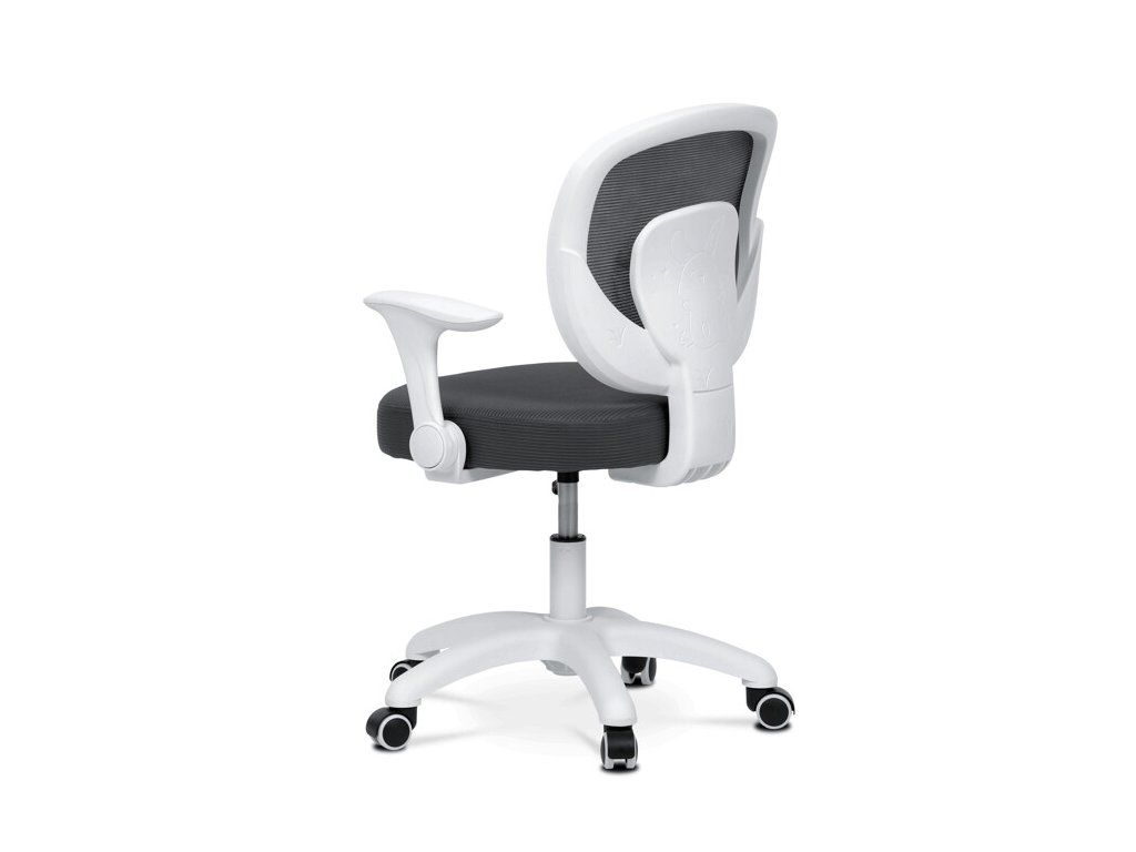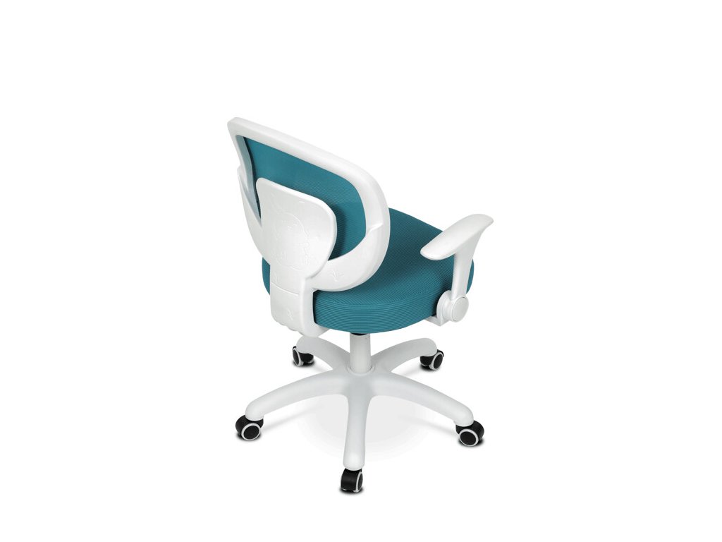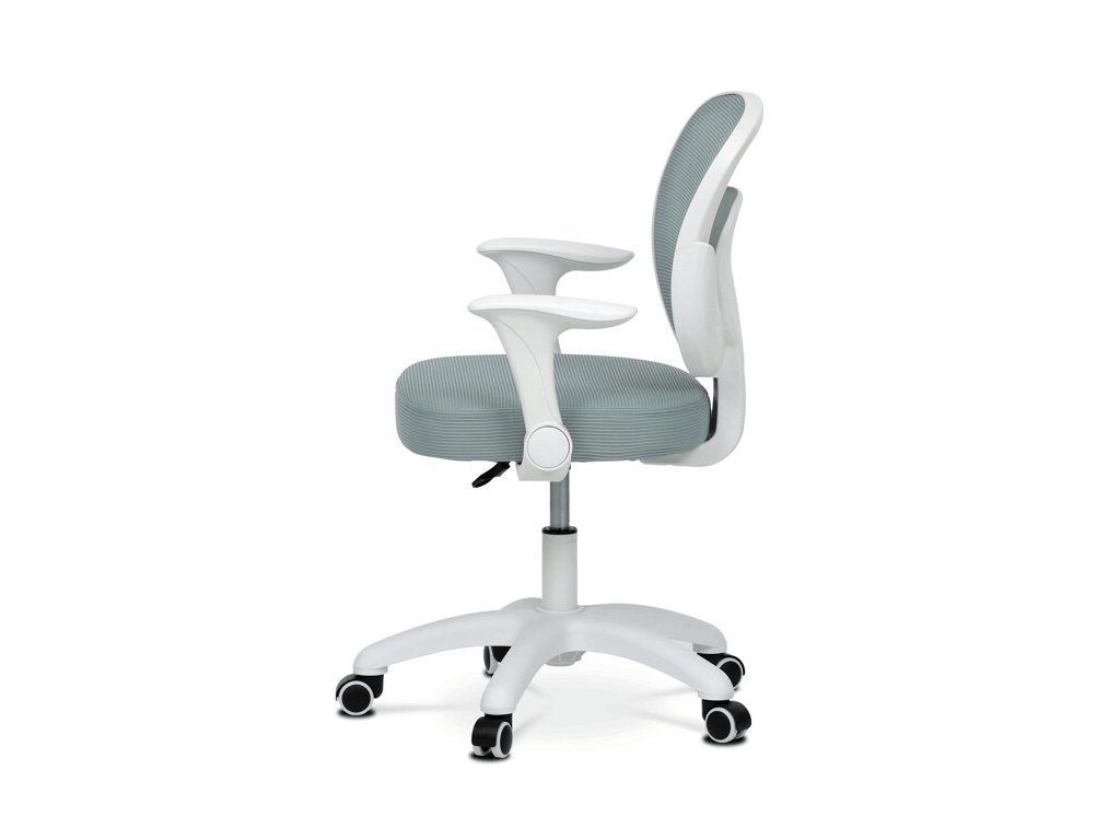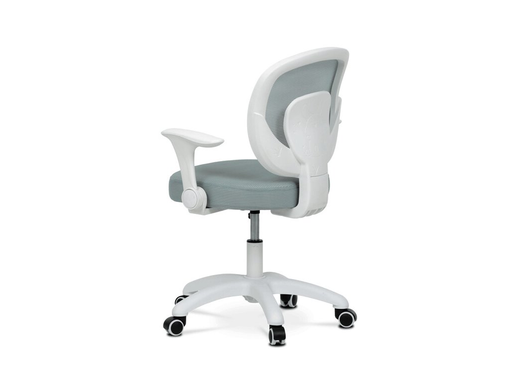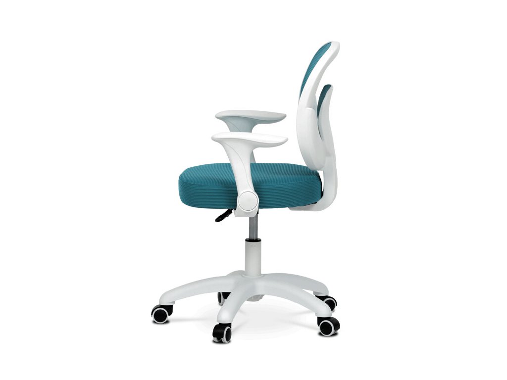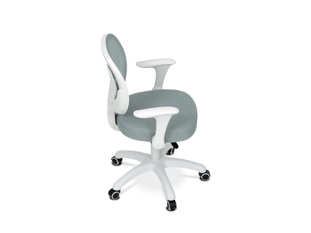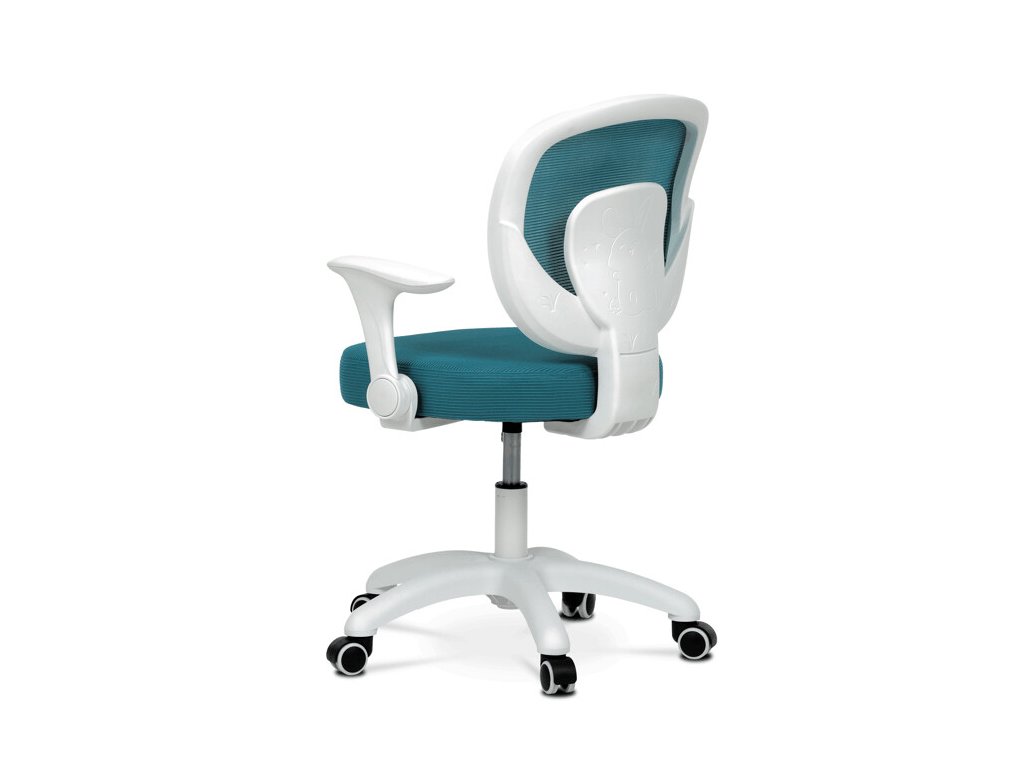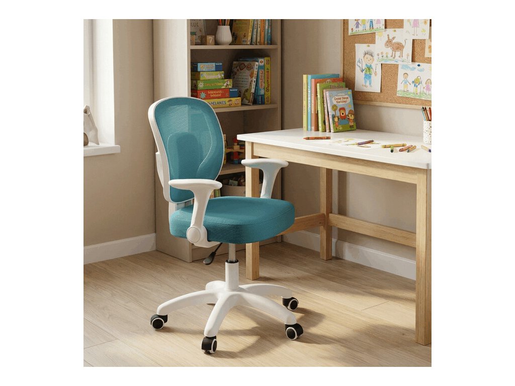 Detská stolička s modrým sieťovinovým poťahom ponúka priedušné a pohodlné sedenie vhodné pre mladších používateľov. Operadlo aj sedák sú potiahnuté jemnou sieťovinou, ktorá podporuje cirkuláciu vzduchu a prispieva k príjemnému pocitu počas dlhšieho sedenia. Odklápacie podrúčky z bieleho plastu umožňujú jednoduché prispôsobenie priestoru a lepšiu manipuláciu so stoličkou. Výškovo nastaviteľný mechanizmus umožňuje jednoduché prispôsobenie výšky sedáka podľa potreby dieťaťa. Stabilný plastový kríž je vybavený kolieskami určenými na tvrdé podlahy, čo zabezpečuje hladký pohyb a ochranu povrchu podlahy.