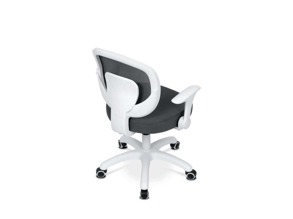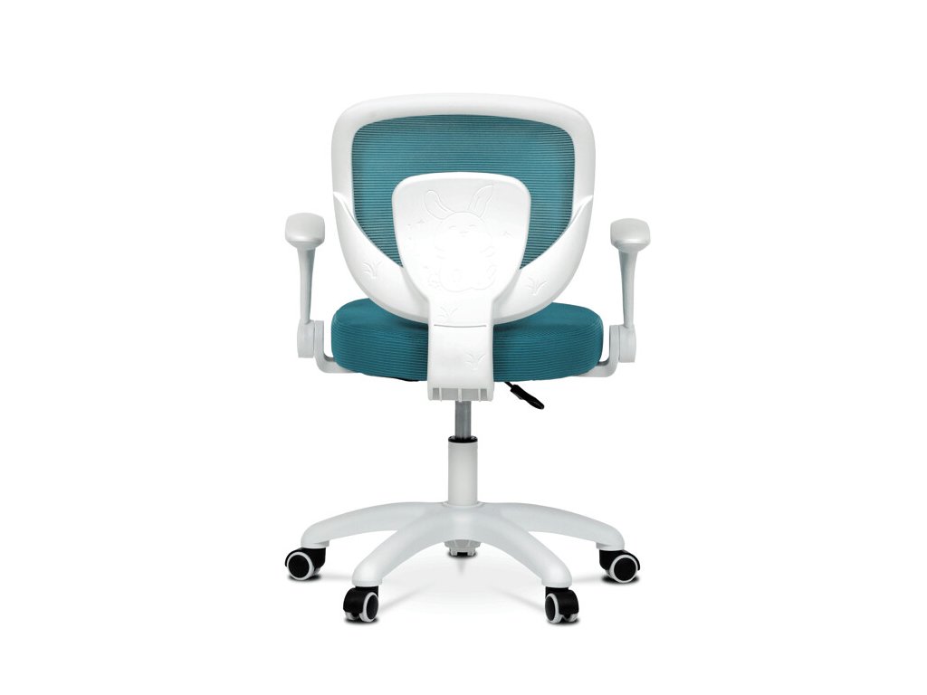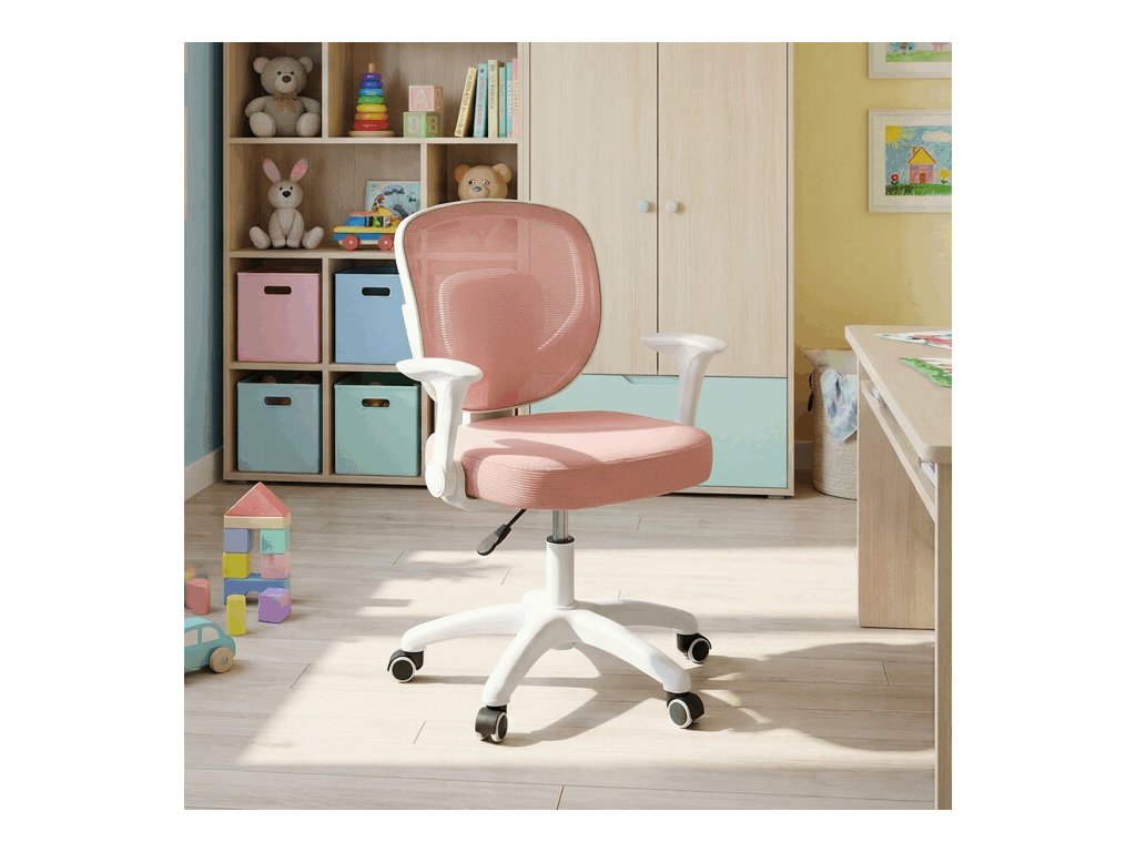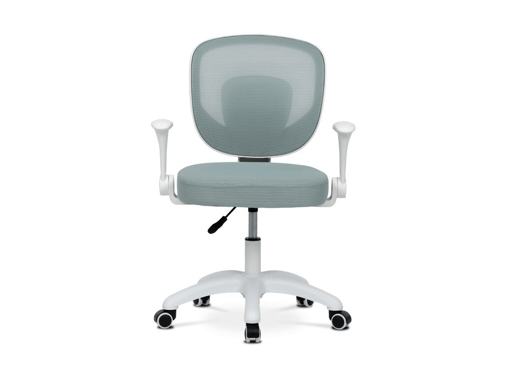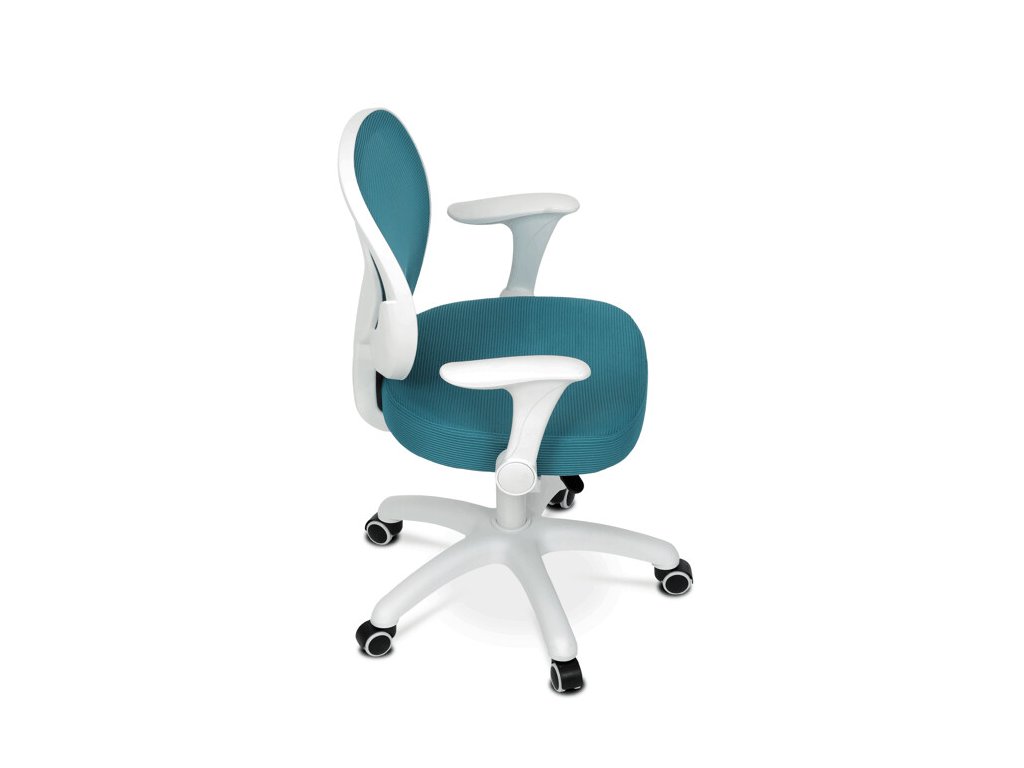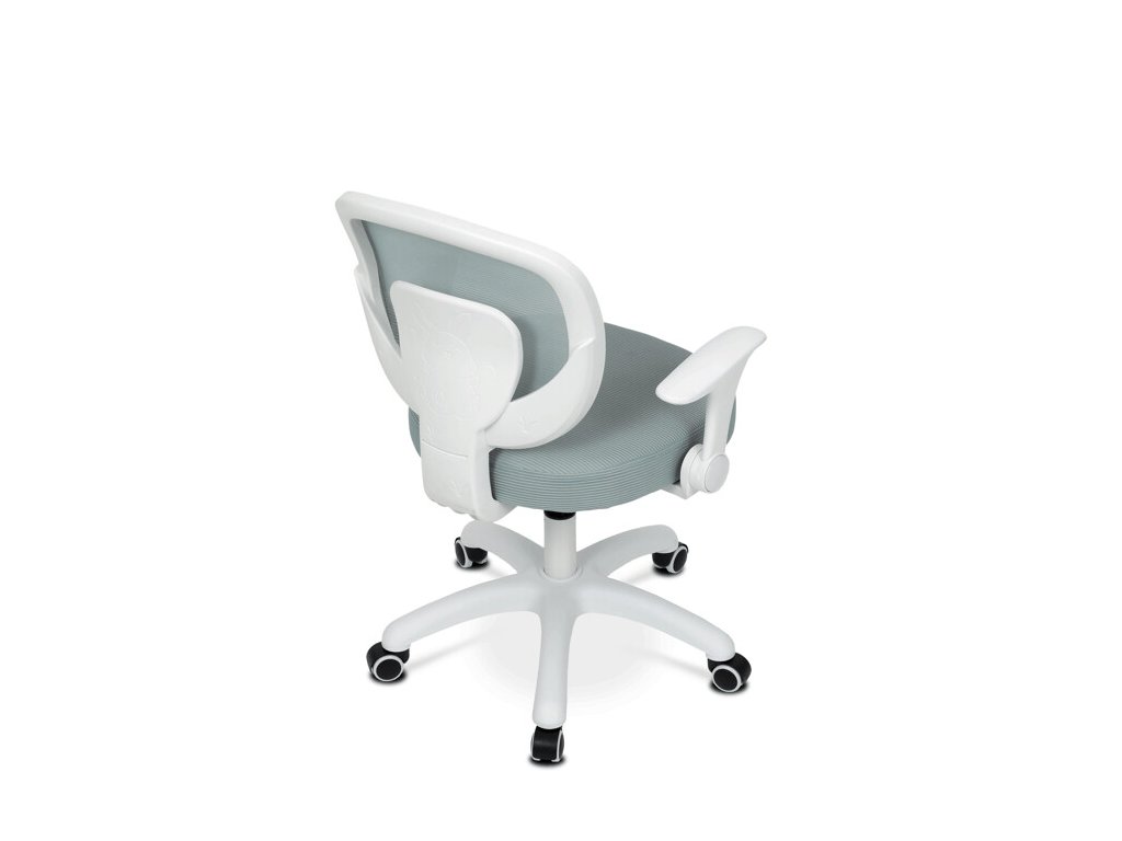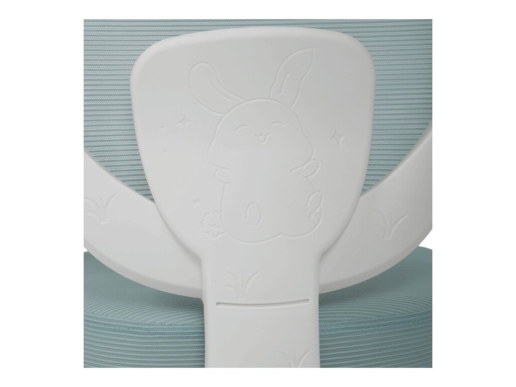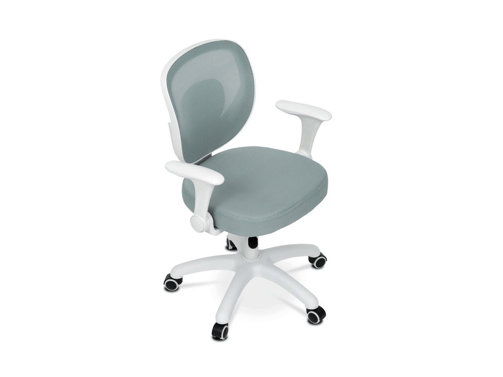 Detská stolička s modrým sieťovinovým poťahom ponúka priedušné a pohodlné sedenie vhodné pre mladších používateľov. Operadlo aj sedák sú potiahnuté jemnou sieťovinou, ktorá podporuje cirkuláciu vzduchu a prispieva k príjemnému pocitu počas dlhšieho sedenia. Odklápacie podrúčky z bieleho plastu umožňujú jednoduché prispôsobenie priestoru a lepšiu manipuláciu so stoličkou. Výškovo nastaviteľný mechanizmus umožňuje jednoduché prispôsobenie výšky sedáka podľa potreby dieťaťa. Stabilný plastový kríž je vybavený kolieskami určenými na tvrdé podlahy, čo zabezpečuje hladký pohyb a ochranu povrchu podlahy.