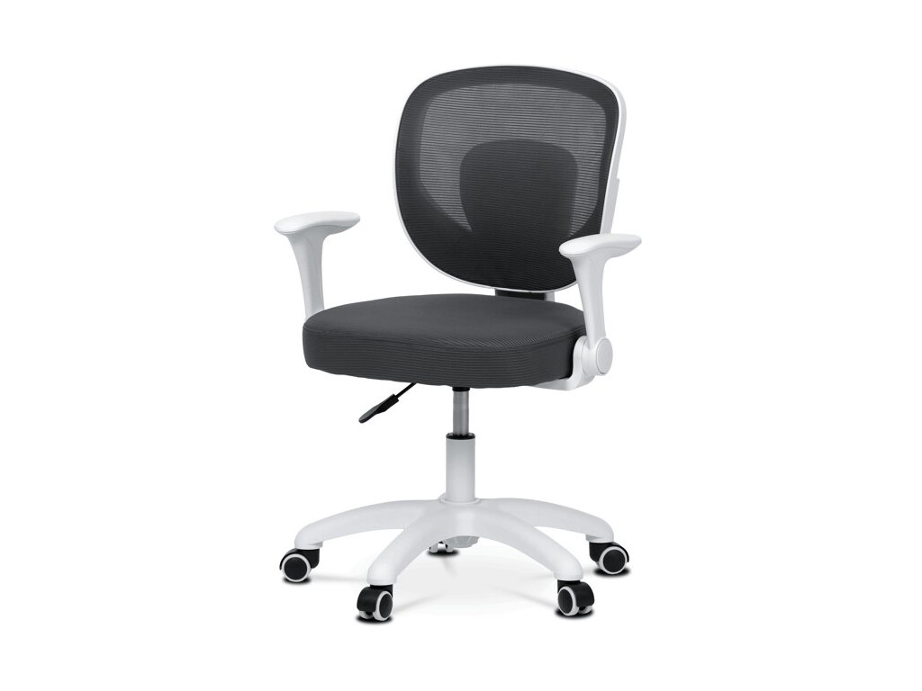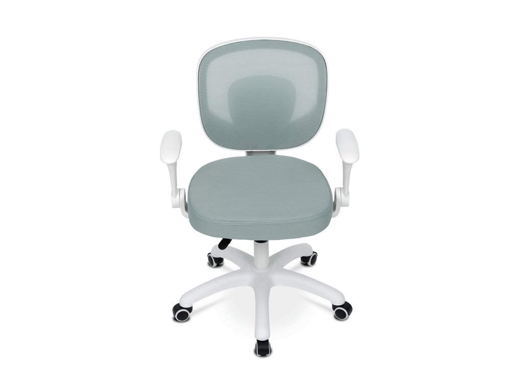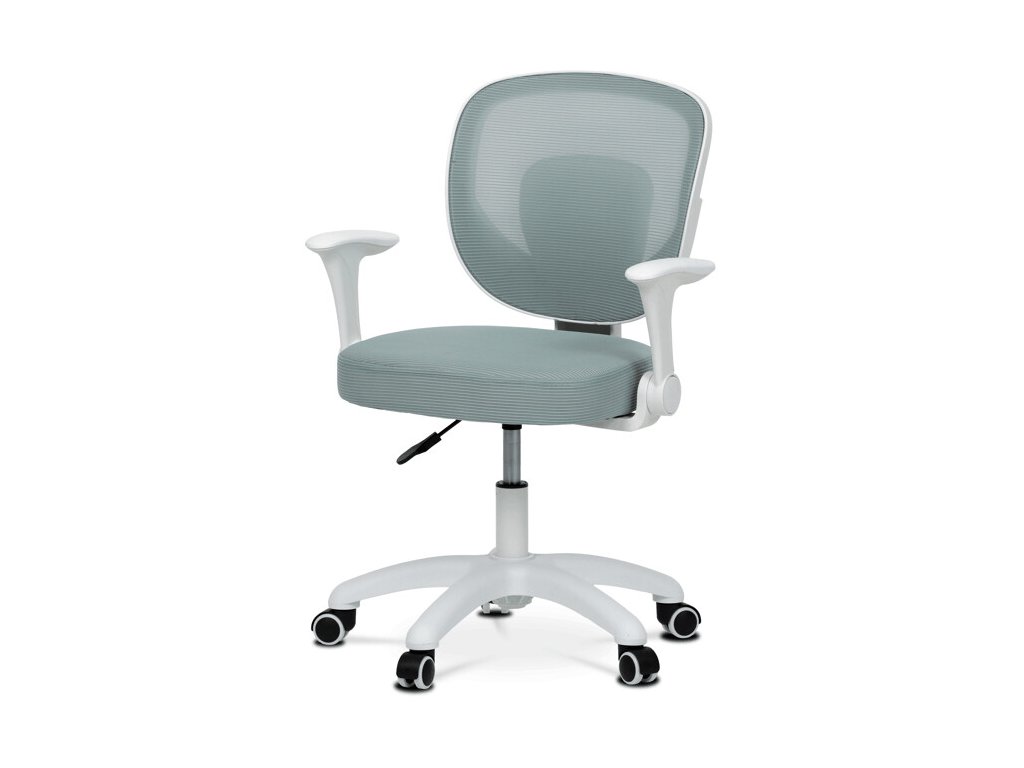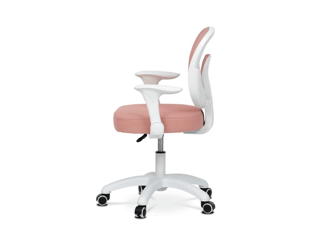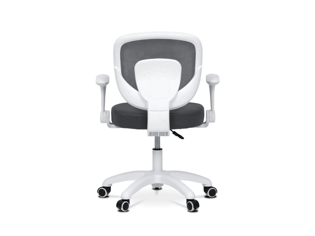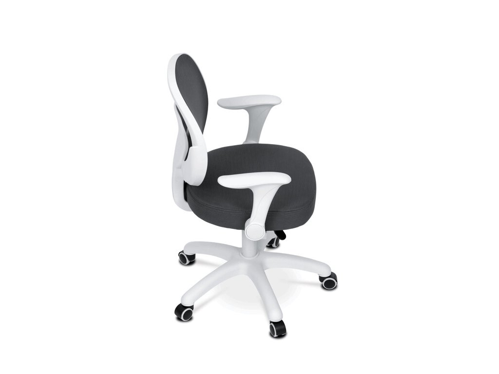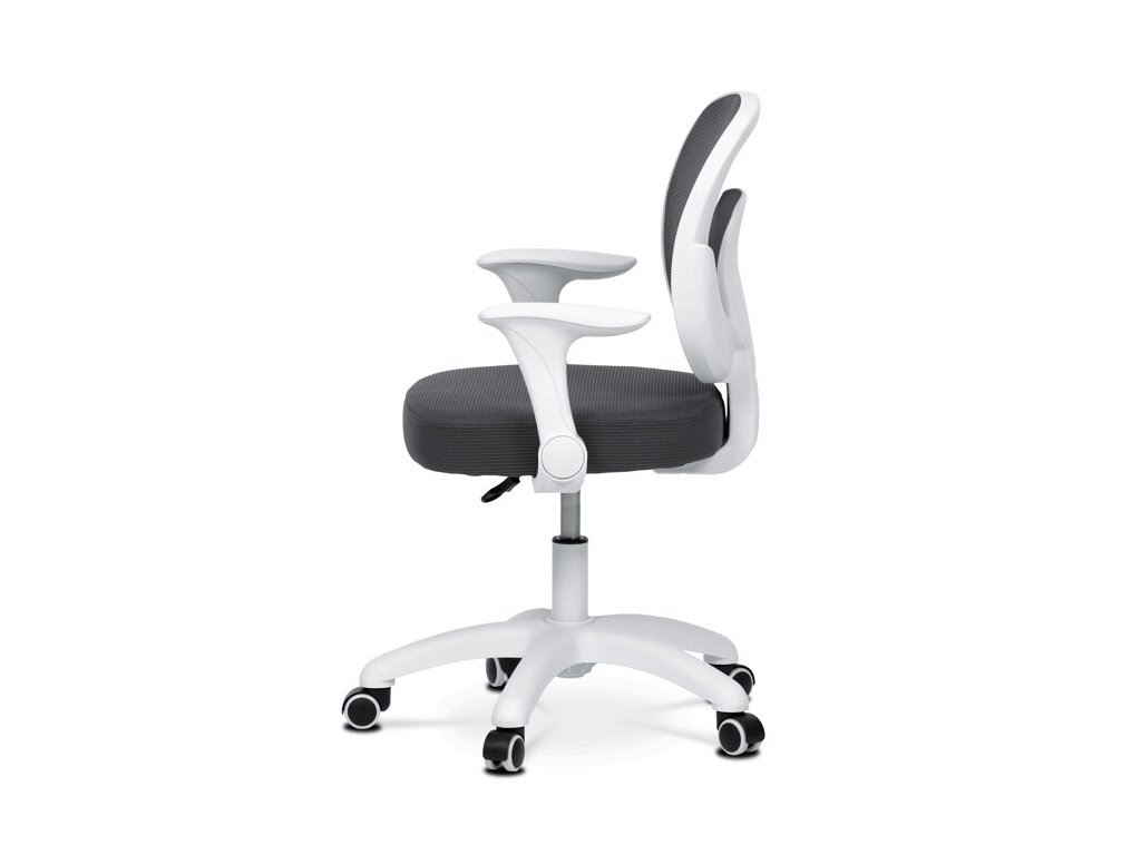 Detská stolička s modrým sieťovinovým poťahom ponúka priedušné a pohodlné sedenie vhodné pre mladších používateľov. Operadlo aj sedák sú potiahnuté jemnou sieťovinou, ktorá podporuje cirkuláciu vzduchu a prispieva k príjemnému pocitu počas dlhšieho sedenia. Odklápacie podrúčky z bieleho plastu umožňujú jednoduché prispôsobenie priestoru a lepšiu manipuláciu so stoličkou. Výškovo nastaviteľný mechanizmus umožňuje jednoduché prispôsobenie výšky sedáka podľa potreby dieťaťa. Stabilný plastový kríž je vybavený kolieskami určenými na tvrdé podlahy, čo zabezpečuje hladký pohyb a ochranu povrchu podlahy.