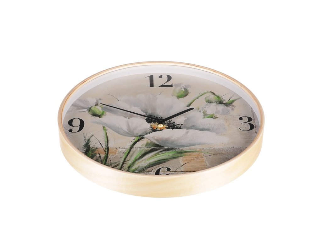 BONTEC Hodiny nástenné - pr. 40 cm, MDF a drevený rám, kvitnúci mak
