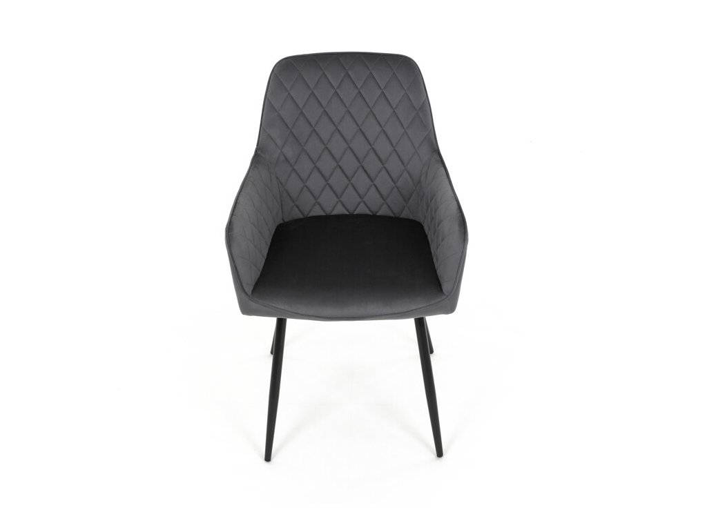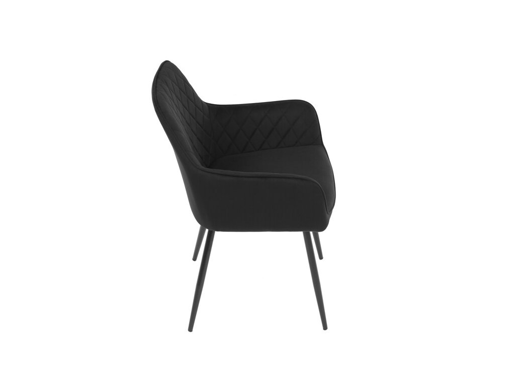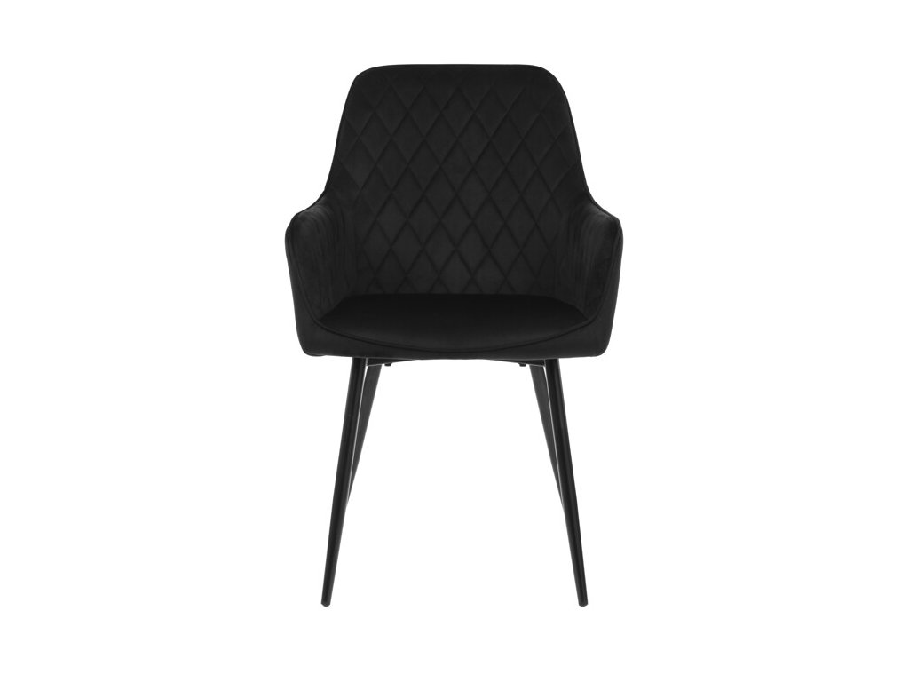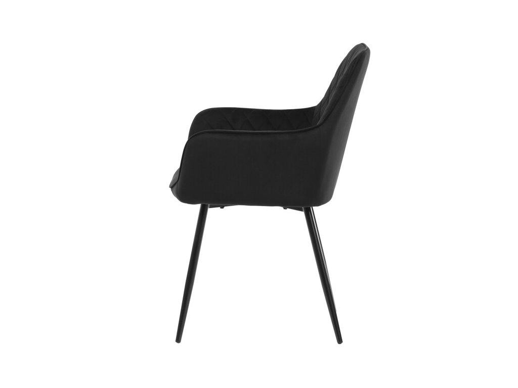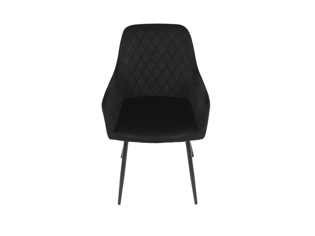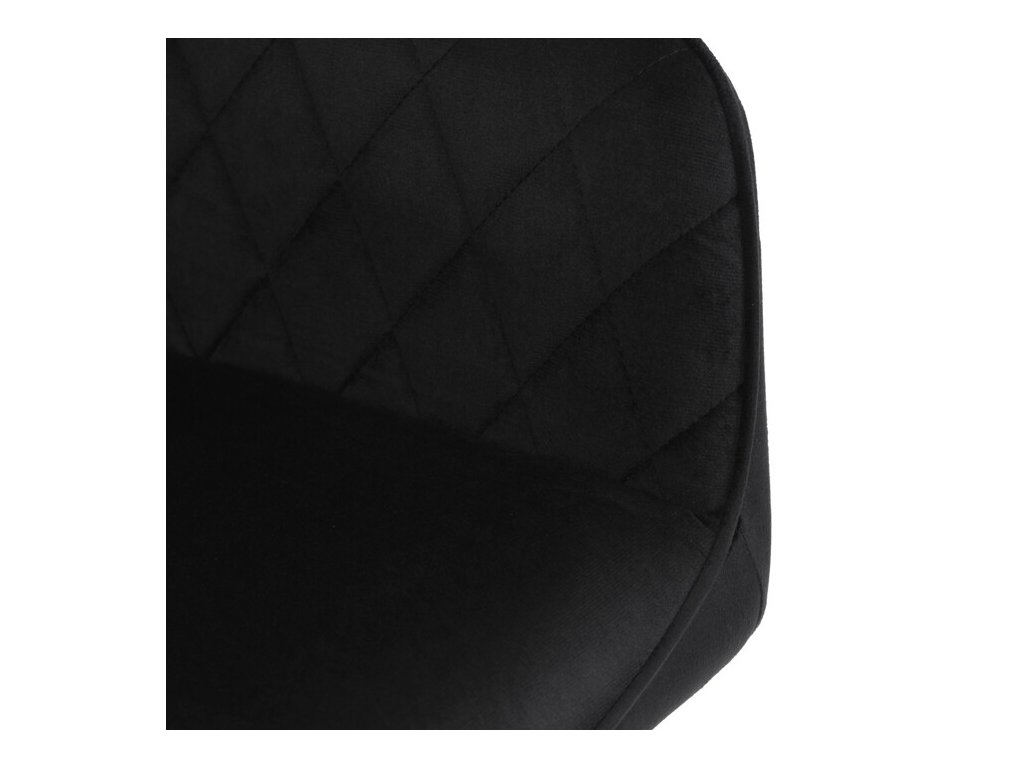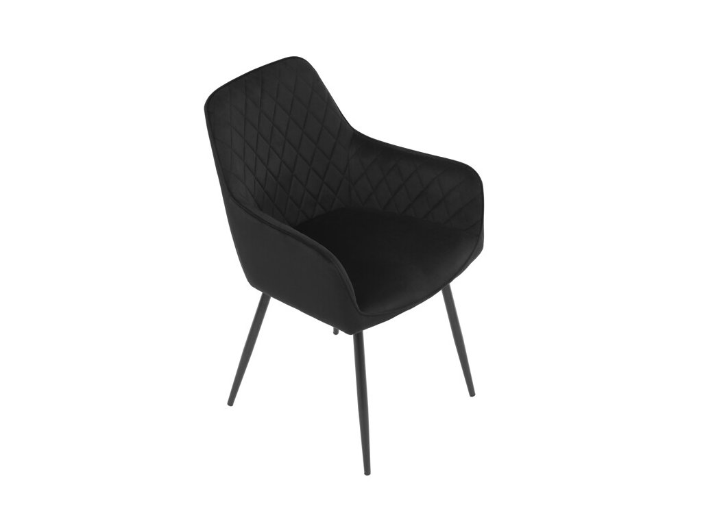 Jedálenská stolička s čiernym zamatovým poťahom ponúka pohodlné sedenie vďaka mäkkému čalúneniu a ergonomicky tvarovaným podrúčkam. Čalúnenie je doplnené dizajnovým prešitím v kosoštvorcovom vzore, ktoré zvýrazňuje jej moderný vzhľad. Pevné kovové nohy v čiernom matnom prevedení zabezpečujú stabilitu a dlhú životnosť stoličky. Zamatová látka je príjemná na dotyk a ľahko sa udržiava, čo ju predurčuje na použitie v jedálňach aj iných obytných priestoroch. Stolička nie je otočná, čo prispieva k jej jednoduchej a pevnej konštrukcii.