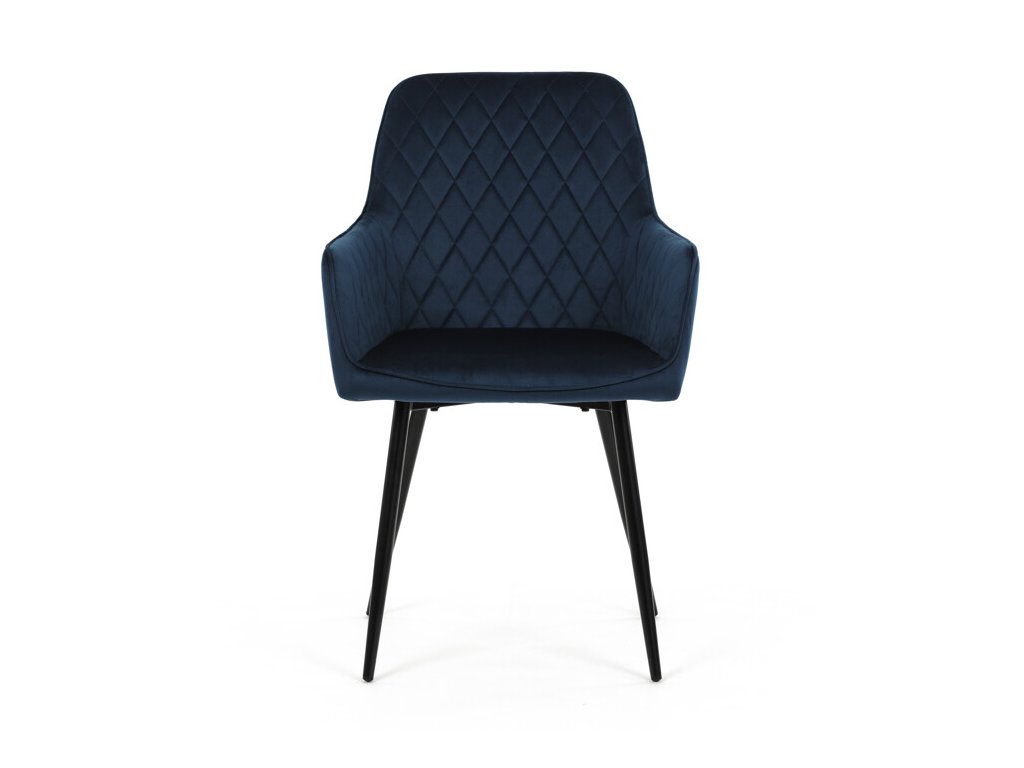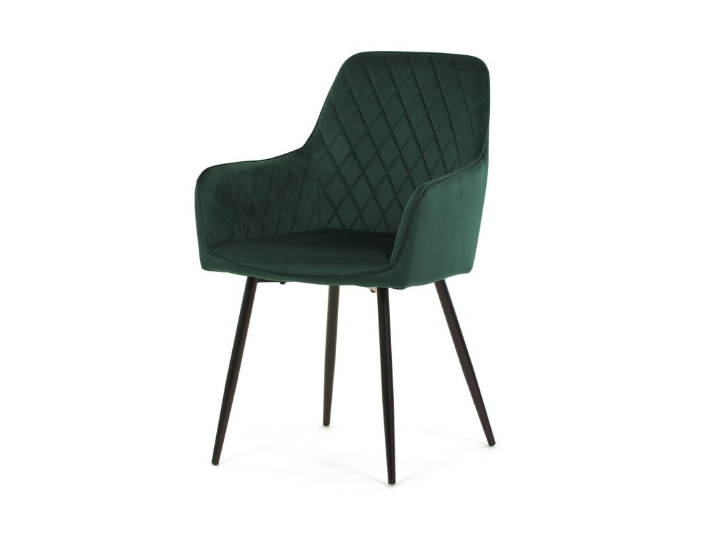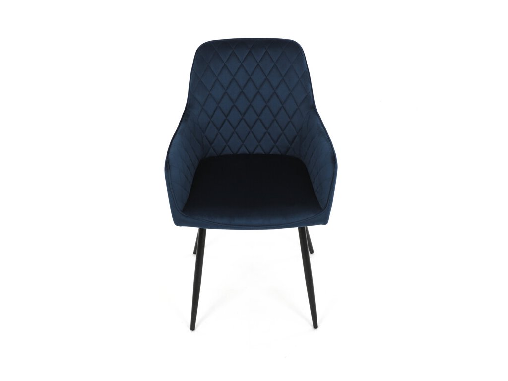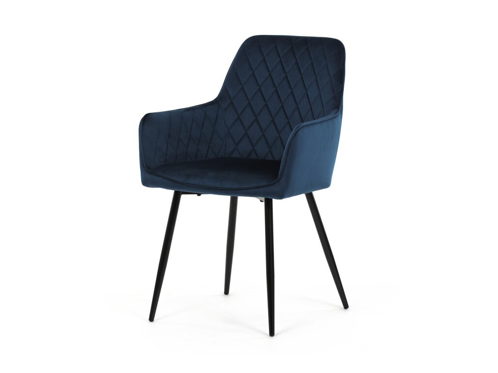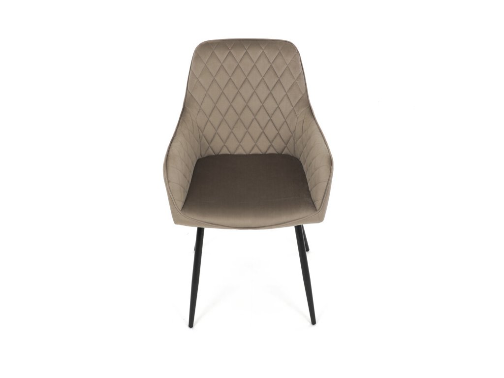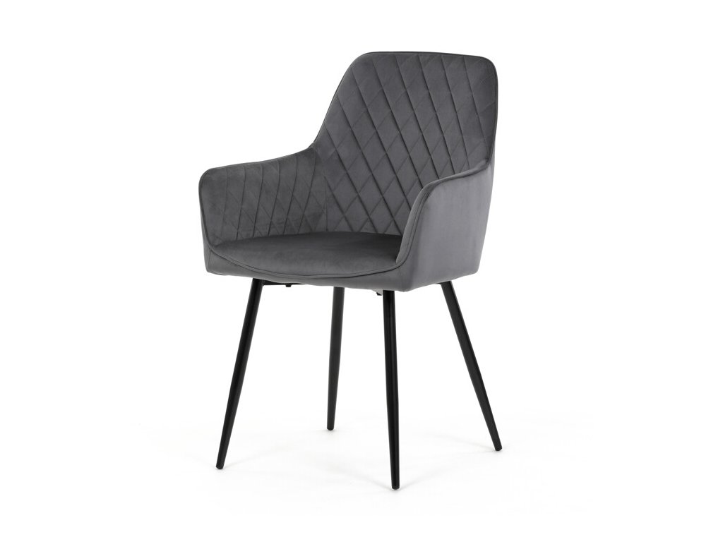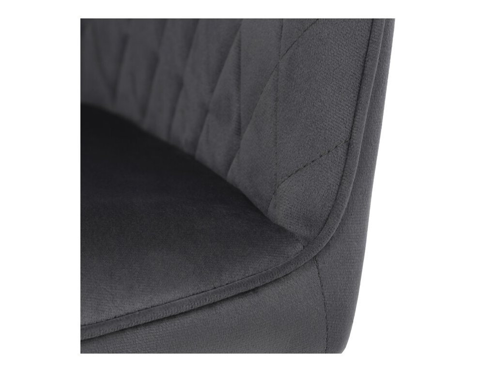 Jedálenská stolička s čiernym zamatovým poťahom ponúka pohodlné sedenie vďaka mäkkému čalúneniu a ergonomicky tvarovaným podrúčkam. Čalúnenie je doplnené dizajnovým prešitím v kosoštvorcovom vzore, ktoré zvýrazňuje jej moderný vzhľad. Pevné kovové nohy v čiernom matnom prevedení zabezpečujú stabilitu a dlhú životnosť stoličky. Zamatová látka je príjemná na dotyk a ľahko sa udržiava, čo ju predurčuje na použitie v jedálňach aj iných obytných priestoroch. Stolička nie je otočná, čo prispieva k jej jednoduchej a pevnej konštrukcii.