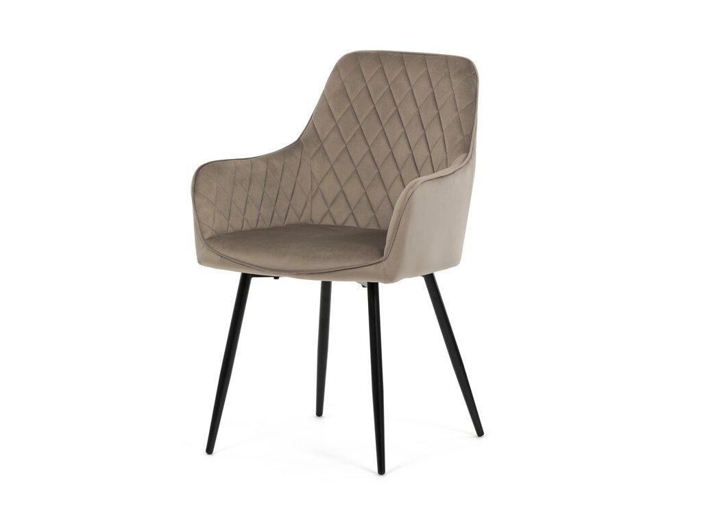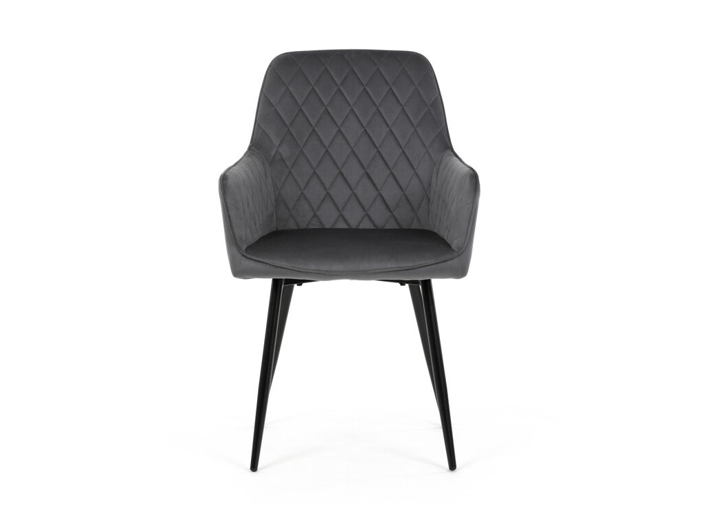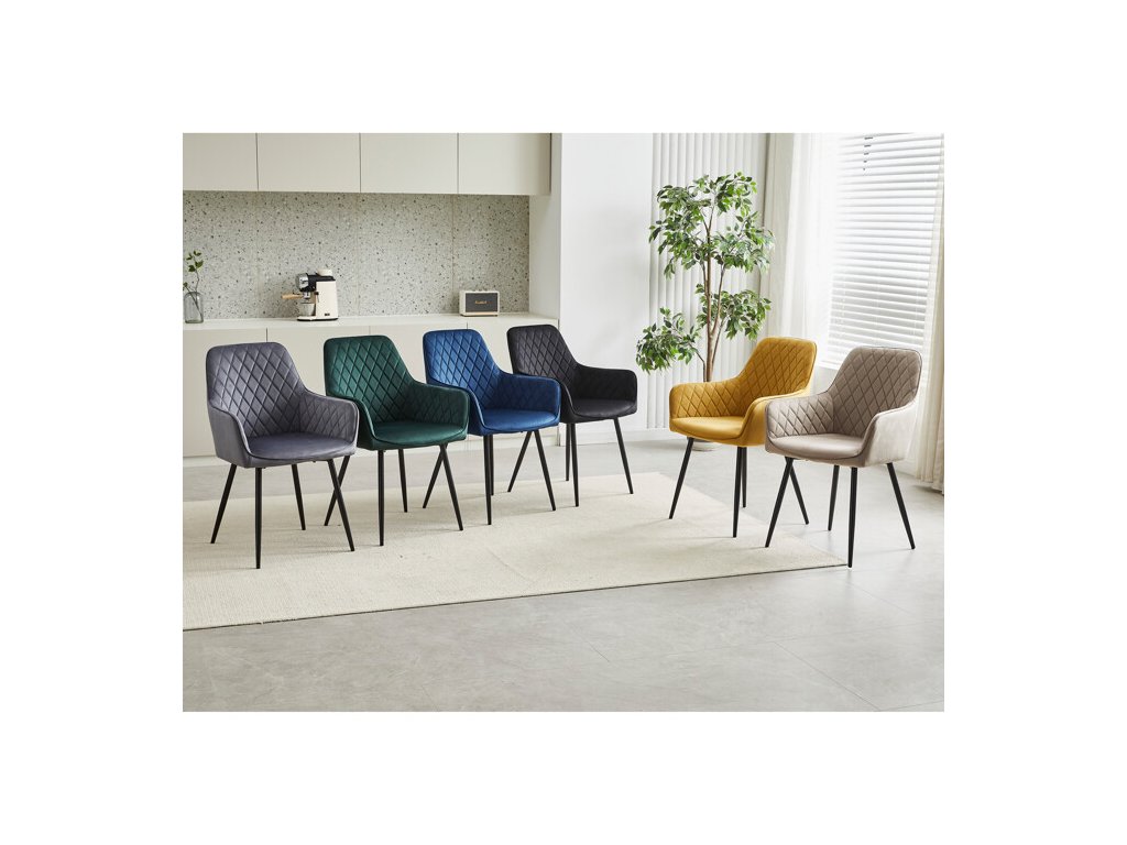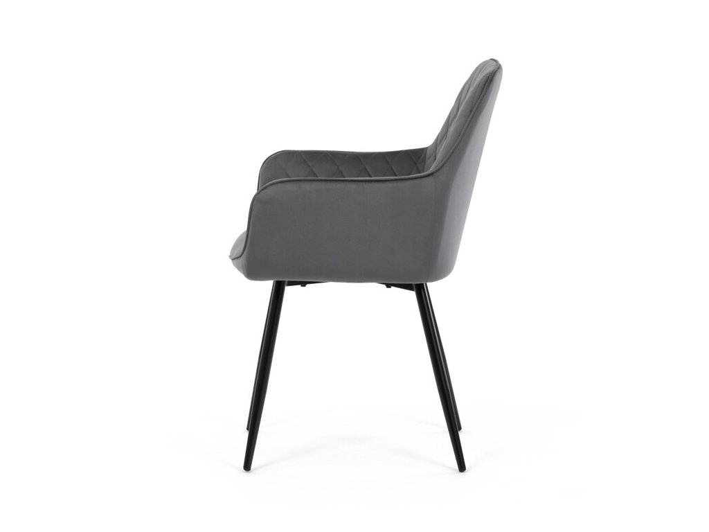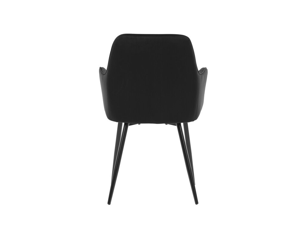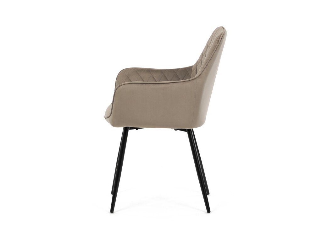 Jedálenská stolička s čiernym zamatovým poťahom ponúka pohodlné sedenie vďaka mäkkému čalúneniu a ergonomicky tvarovaným podrúčkam. Čalúnenie je doplnené dizajnovým prešitím v kosoštvorcovom vzore, ktoré zvýrazňuje jej moderný vzhľad. Pevné kovové nohy v čiernom matnom prevedení zabezpečujú stabilitu a dlhú životnosť stoličky. Zamatová látka je príjemná na dotyk a ľahko sa udržiava, čo ju predurčuje na použitie v jedálňach aj iných obytných priestoroch. Stolička nie je otočná, čo prispieva k jej jednoduchej a pevnej konštrukcii.