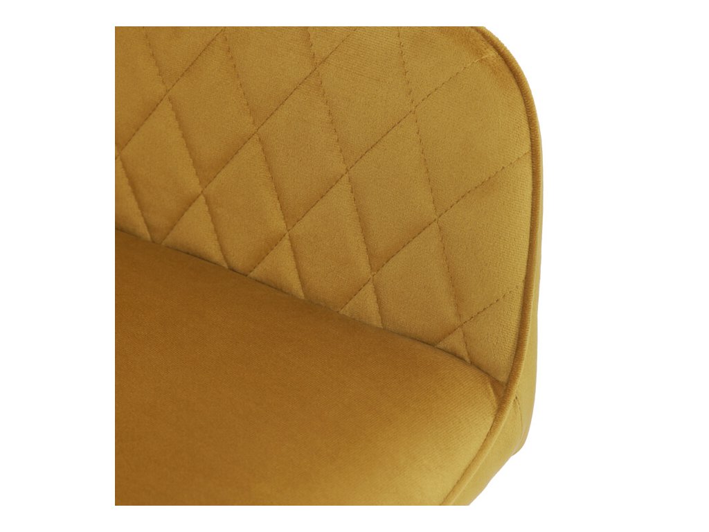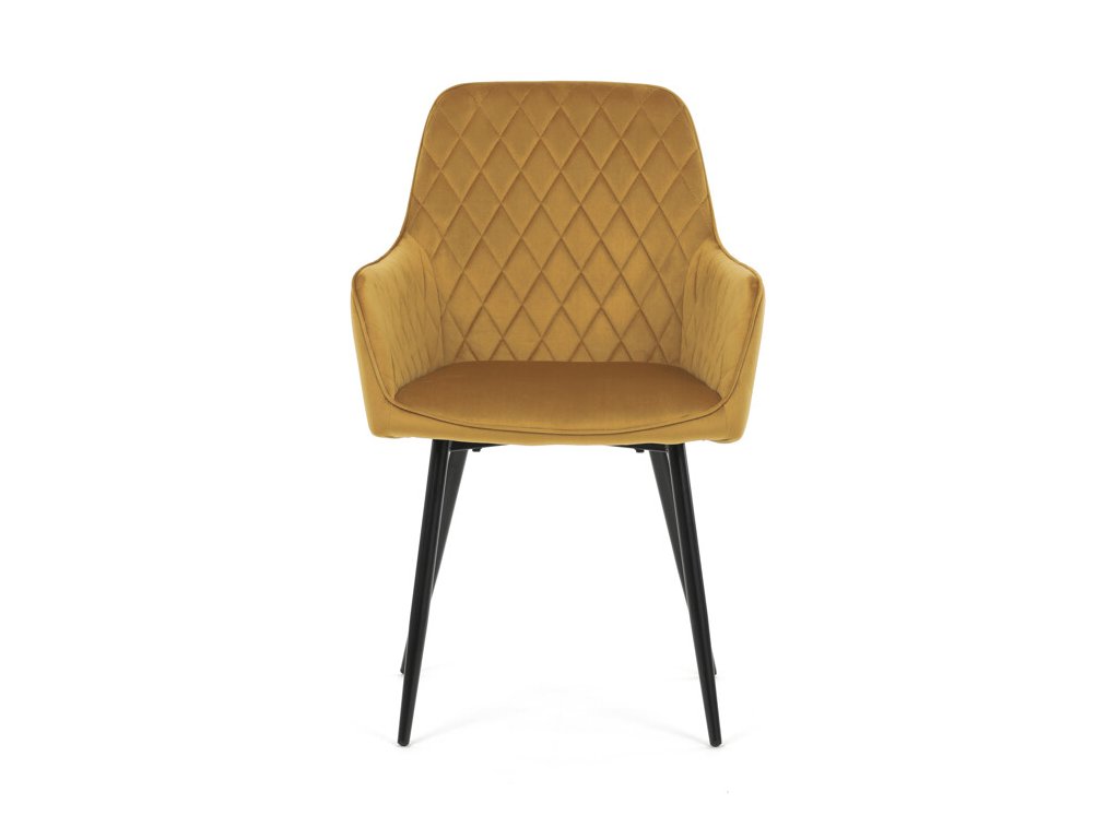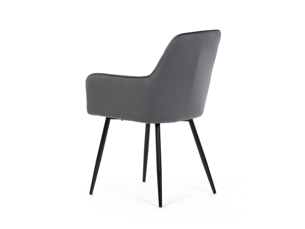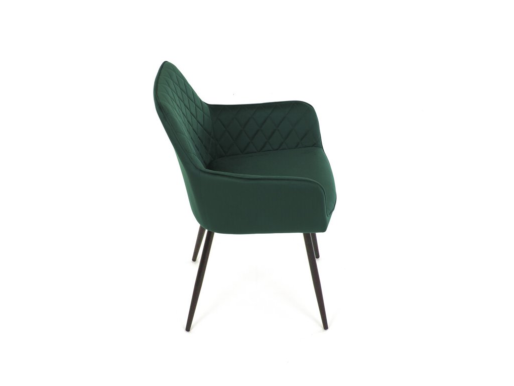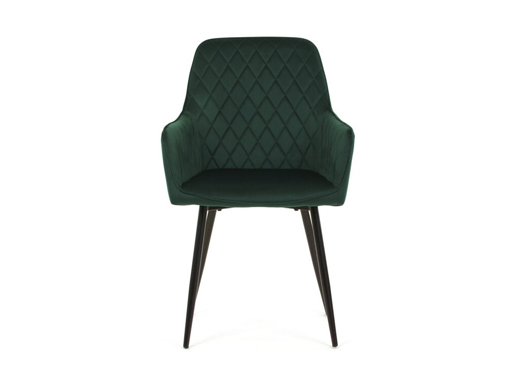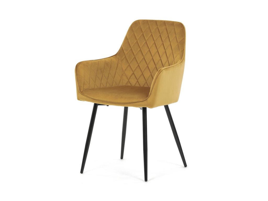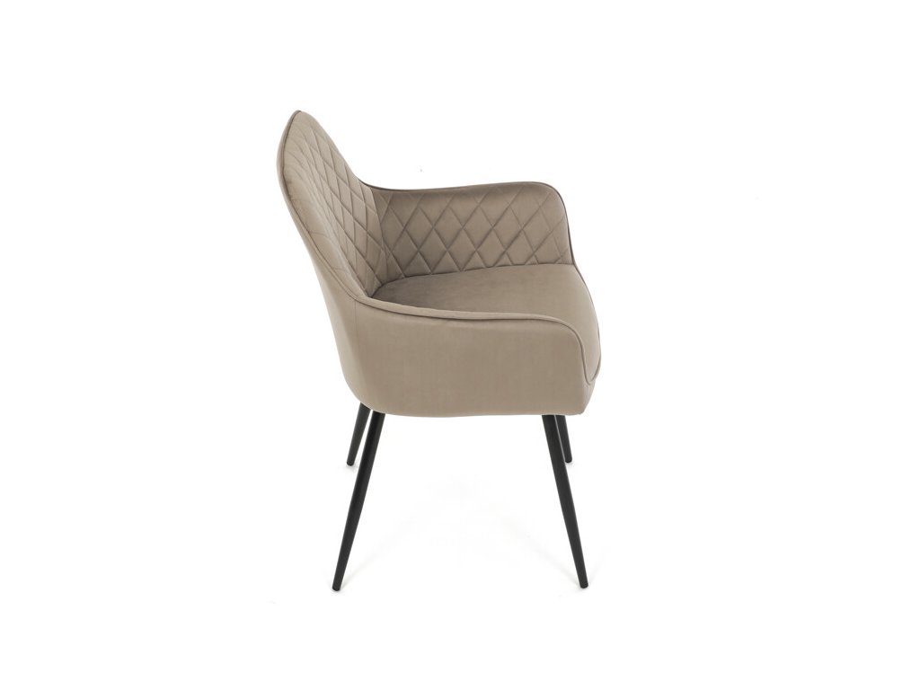 Jedálenská stolička s čiernym zamatovým poťahom ponúka pohodlné sedenie vďaka mäkkému čalúneniu a ergonomicky tvarovaným podrúčkam. Čalúnenie je doplnené dizajnovým prešitím v kosoštvorcovom vzore, ktoré zvýrazňuje jej moderný vzhľad. Pevné kovové nohy v čiernom matnom prevedení zabezpečujú stabilitu a dlhú životnosť stoličky. Zamatová látka je príjemná na dotyk a ľahko sa udržiava, čo ju predurčuje na použitie v jedálňach aj iných obytných priestoroch. Stolička nie je otočná, čo prispieva k jej jednoduchej a pevnej konštrukcii.