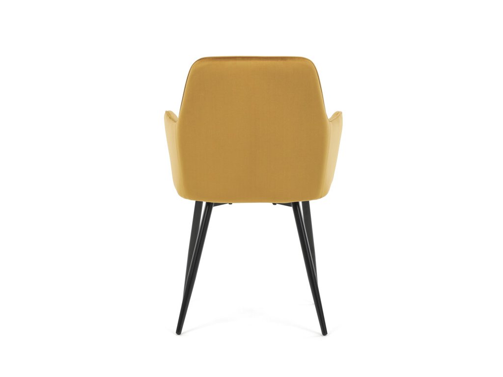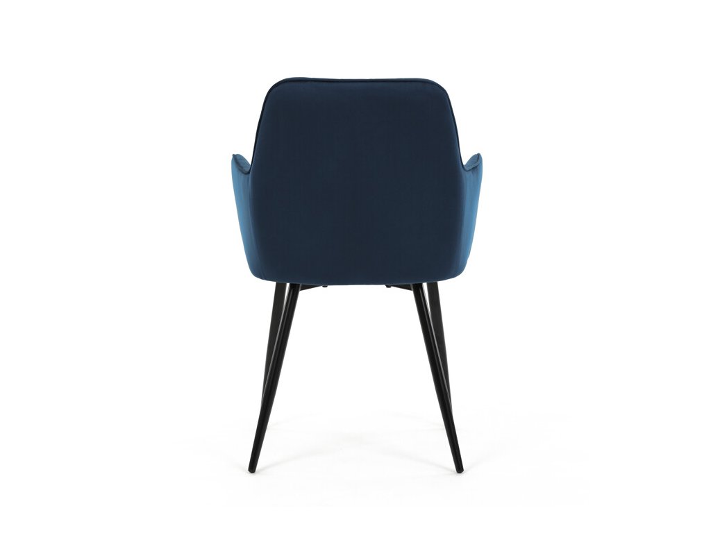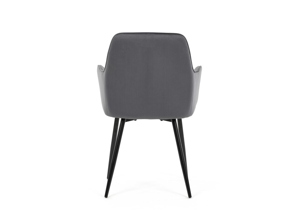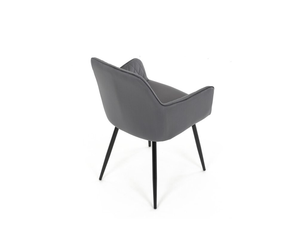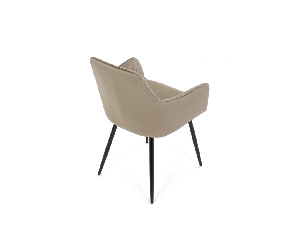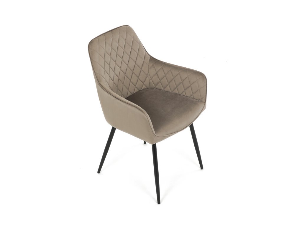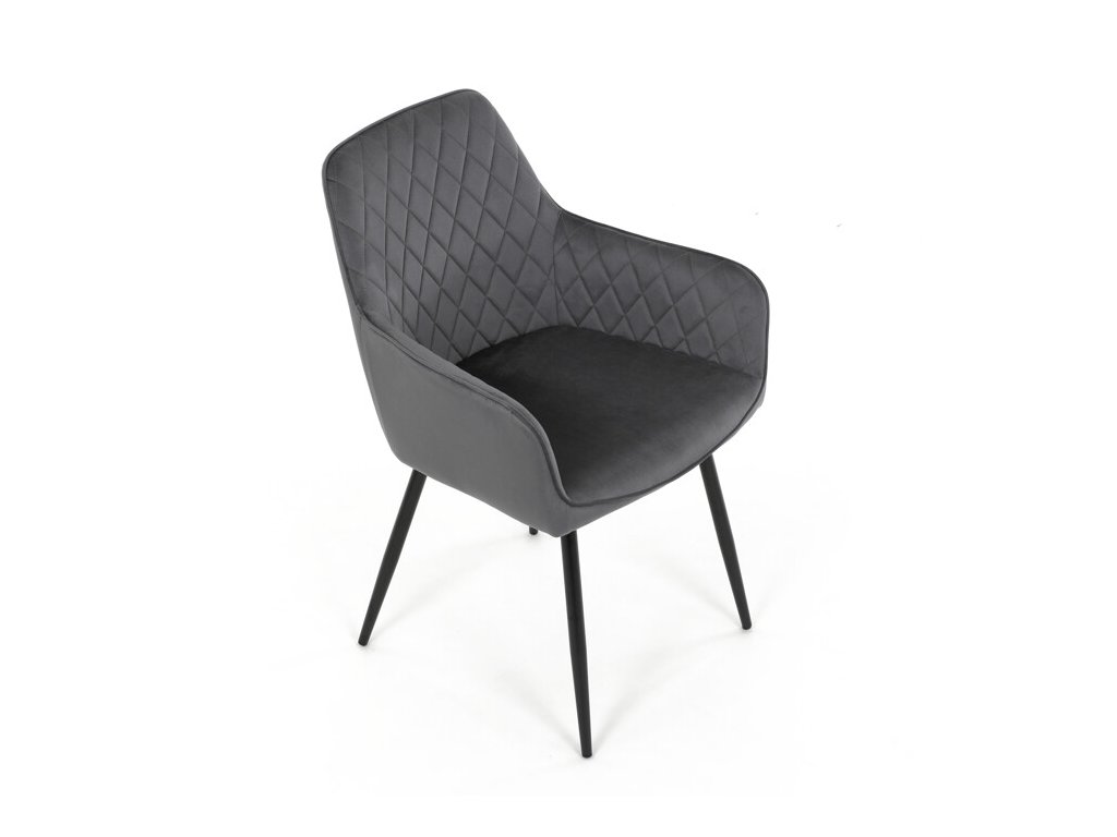 Jedálenská stolička s čiernym zamatovým poťahom ponúka pohodlné sedenie vďaka mäkkému čalúneniu a ergonomicky tvarovaným podrúčkam. Čalúnenie je doplnené dizajnovým prešitím v kosoštvorcovom vzore, ktoré zvýrazňuje jej moderný vzhľad. Pevné kovové nohy v čiernom matnom prevedení zabezpečujú stabilitu a dlhú životnosť stoličky. Zamatová látka je príjemná na dotyk a ľahko sa udržiava, čo ju predurčuje na použitie v jedálňach aj iných obytných priestoroch. Stolička nie je otočná, čo prispieva k jej jednoduchej a pevnej konštrukcii.