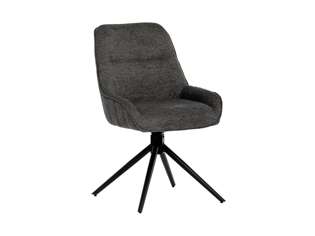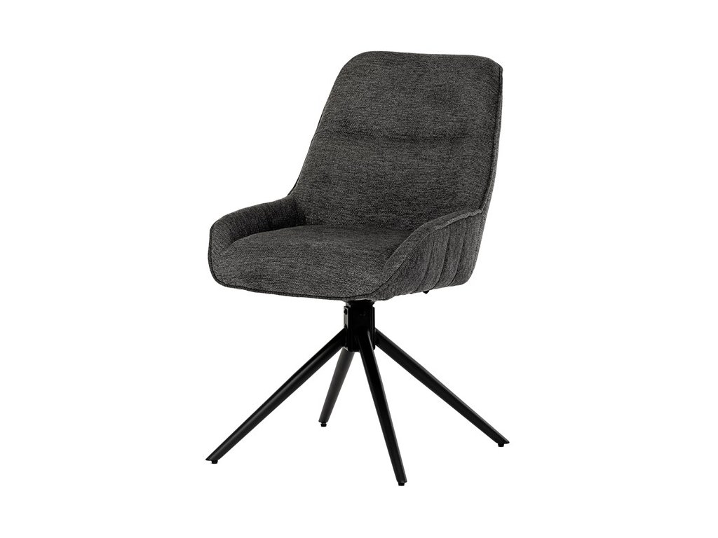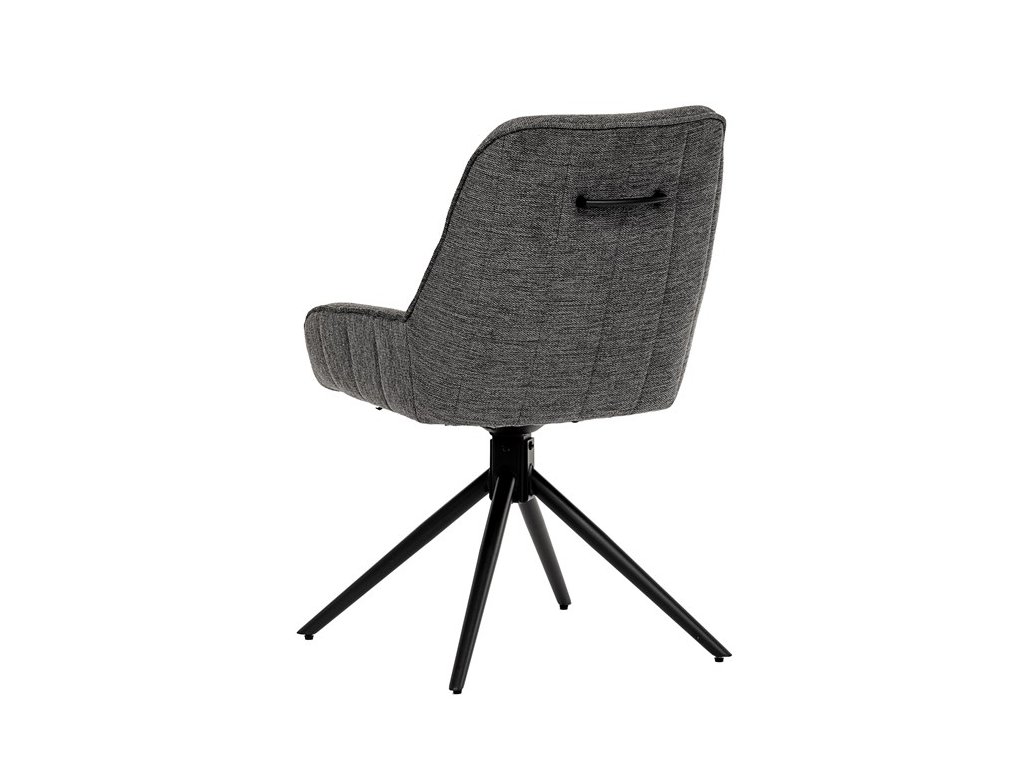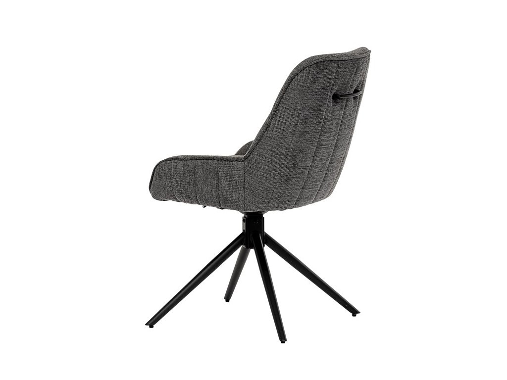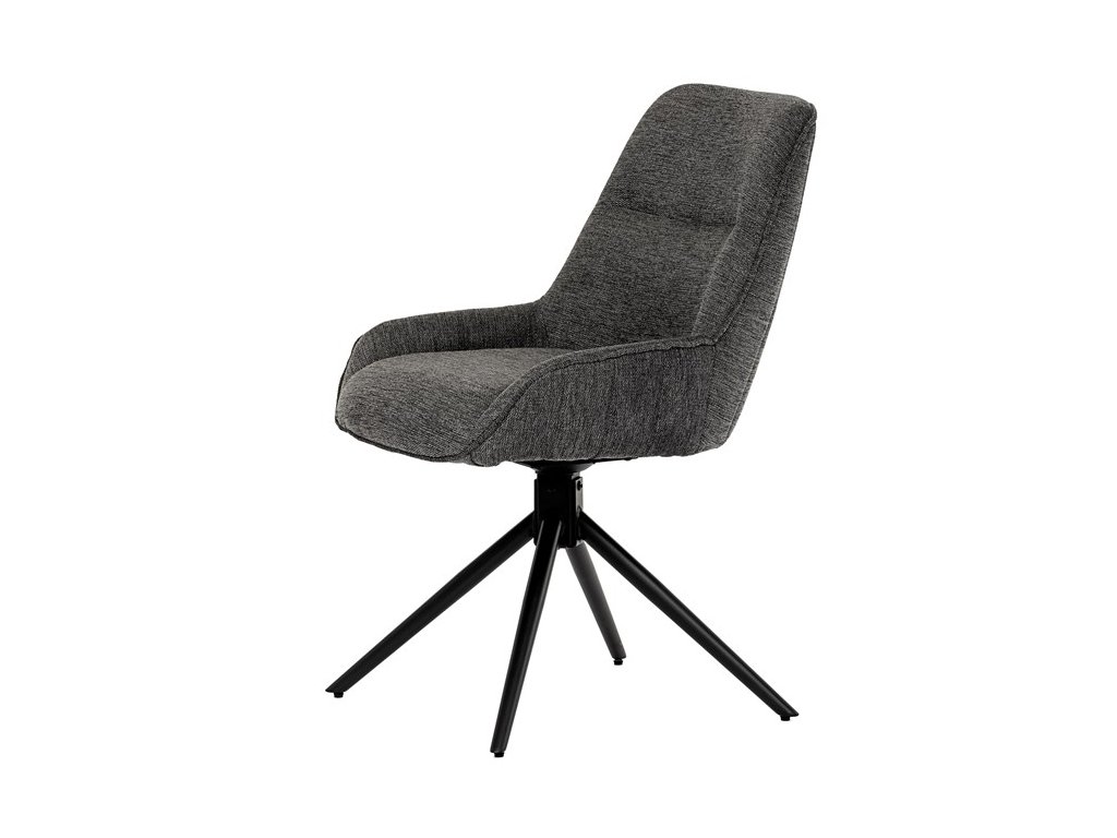 Moderná jedálenská stolička v šedej farbe s efektným prešitím chrbtovej aj prednej časti operadla. Prešitie je v brve poťahového materiálu. Zadná časť operadla je opatrená vkusným madlom pre ľahšiu manipuláciu. Štyri kovové nohy v matnom práškovom nástreku vychádzajú z centrálneho bodu v strede sedadla. Sedák je otočný P90 ° L 90 ° s vratným mechanizmom - funkcia reset.