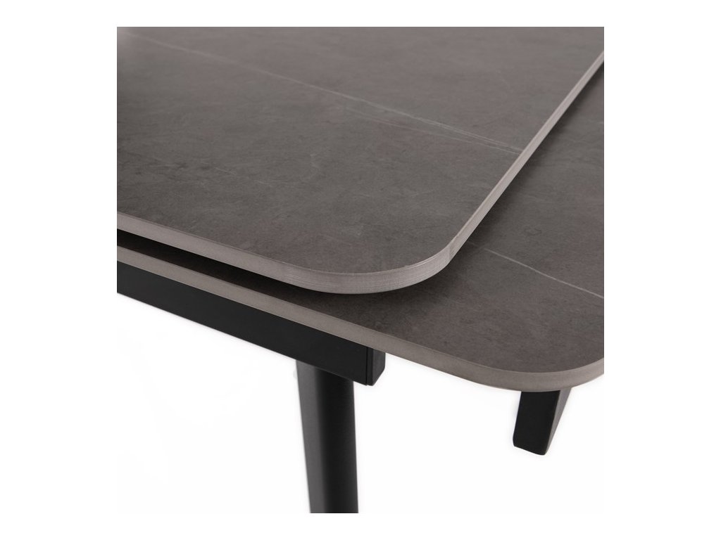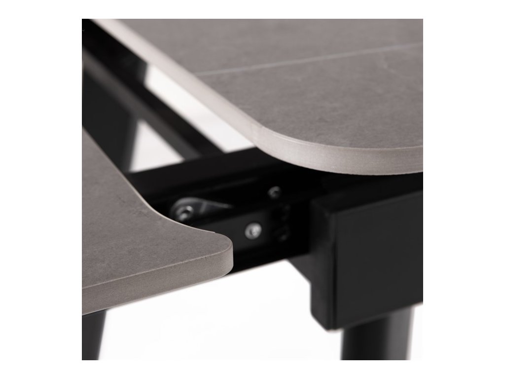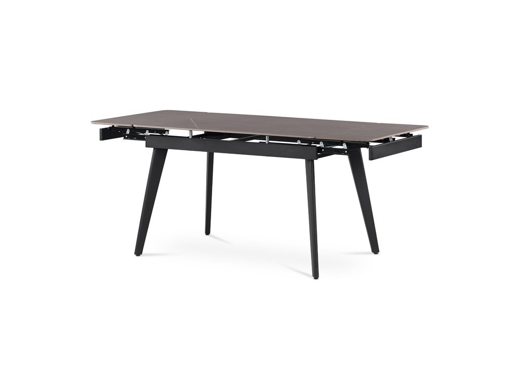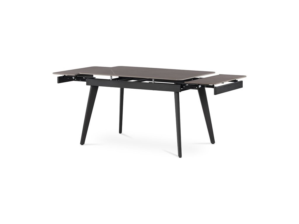 Jedálenský stôl s rozkladacou funkciou ponúka praktické riešenie pre flexibilné usporiadanie priestoru. Doska je vyrobená zo slinutej keramiky v šedom mramorovom dekore s matným povrchom, ktorý je odolný voči poškriabaniu a ľahko sa udržiava. Stabilné kovové nohy v čiernom matnom laku zabezpečujú pevnú oporu a dlhú životnosť. Rozkladací mechanizmus umožňuje predĺženie stola o dve prídavné dosky, čím sa zväčší pracovná plocha z 120 na 180 cm pri zachovaní šírky 80 cm. Vďaka kombinácii kvalitných materiálov a funkčnému dizajnu je stôl vhodný do moderných interiérov aj na každodenné použitie.