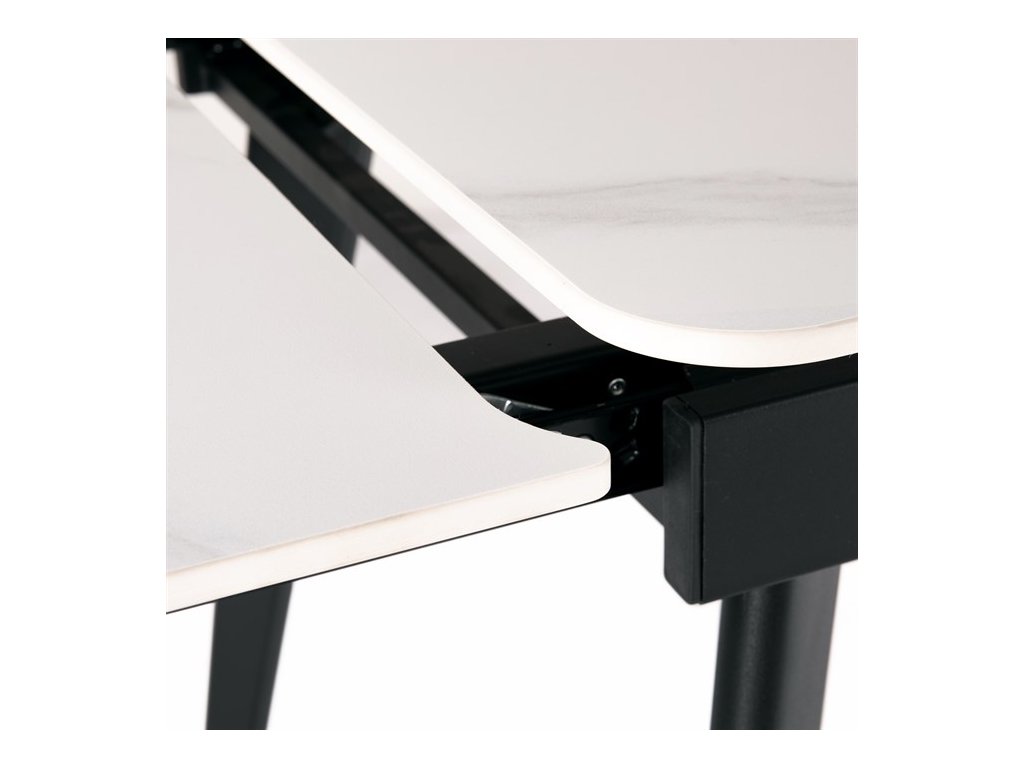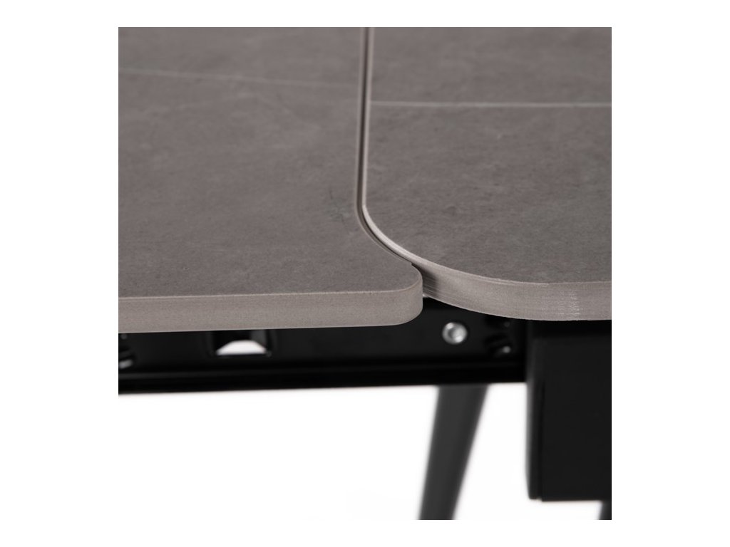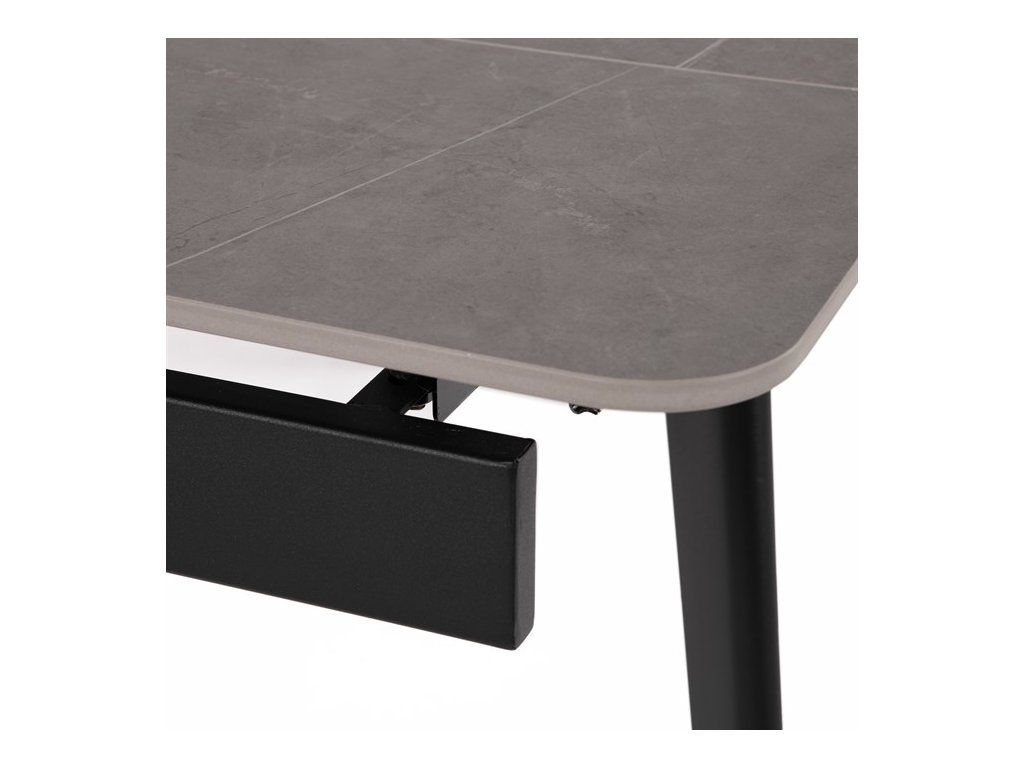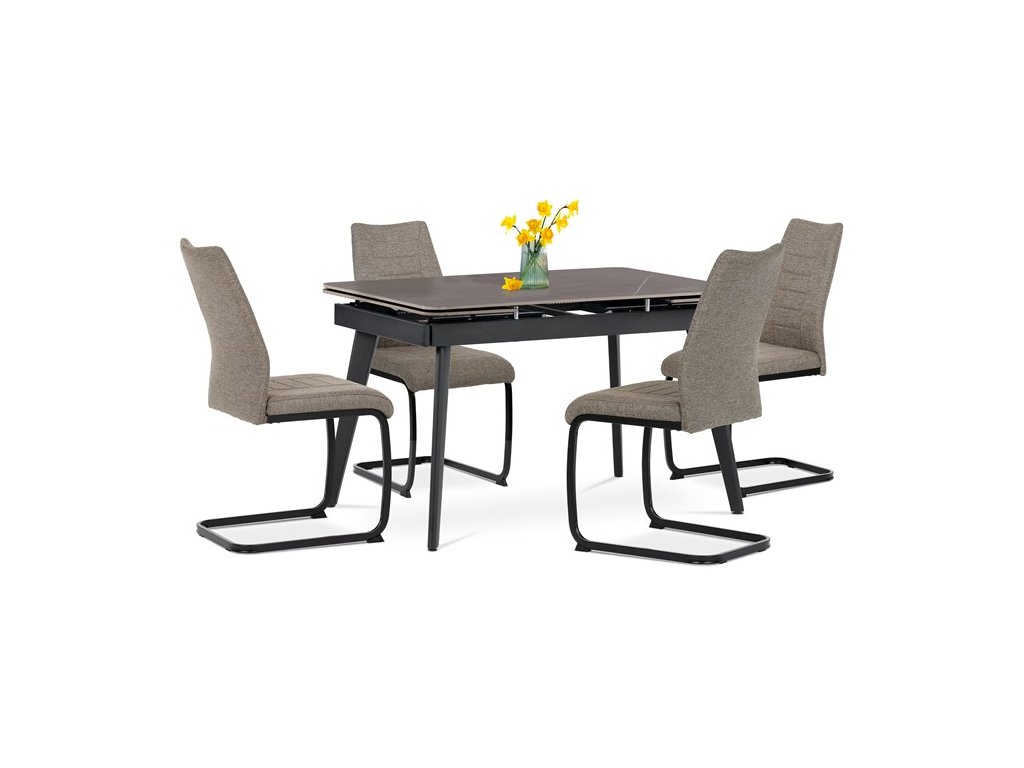 Jedálenský stôl s rozkladacou funkciou ponúka praktické riešenie pre flexibilné usporiadanie priestoru. Doska je vyrobená zo slinutej keramiky v šedom mramorovom dekore s matným povrchom, ktorý je odolný voči poškriabaniu a ľahko sa udržiava. Stabilné kovové nohy v čiernom matnom laku zabezpečujú pevnú oporu a dlhú životnosť. Rozkladací mechanizmus umožňuje predĺženie stola o dve prídavné dosky, čím sa zväčší pracovná plocha z 120 na 180 cm pri zachovaní šírky 80 cm. Vďaka kombinácii kvalitných materiálov a funkčnému dizajnu je stôl vhodný do moderných interiérov aj na každodenné použitie.