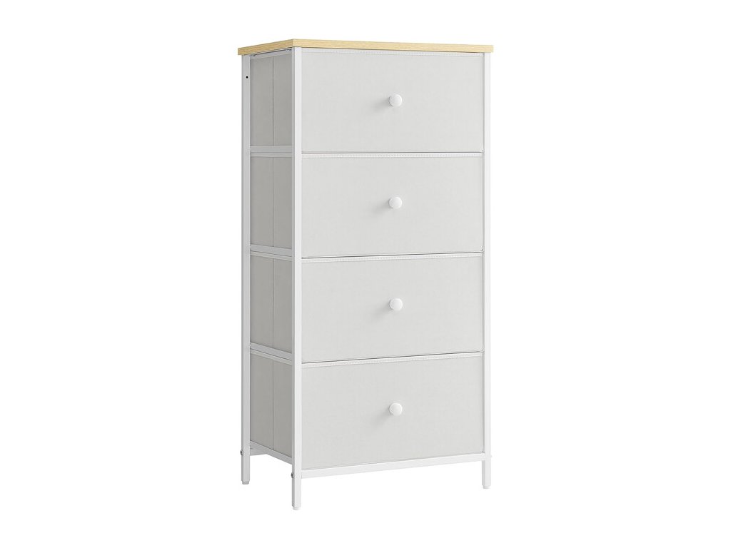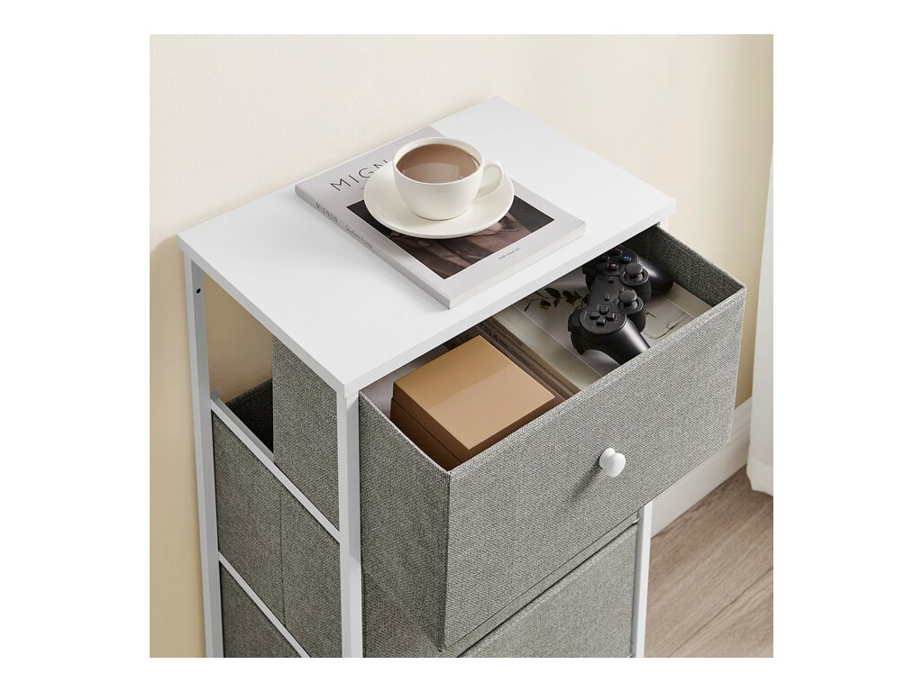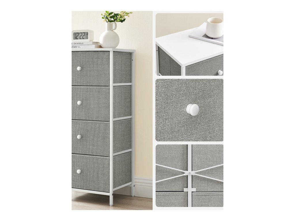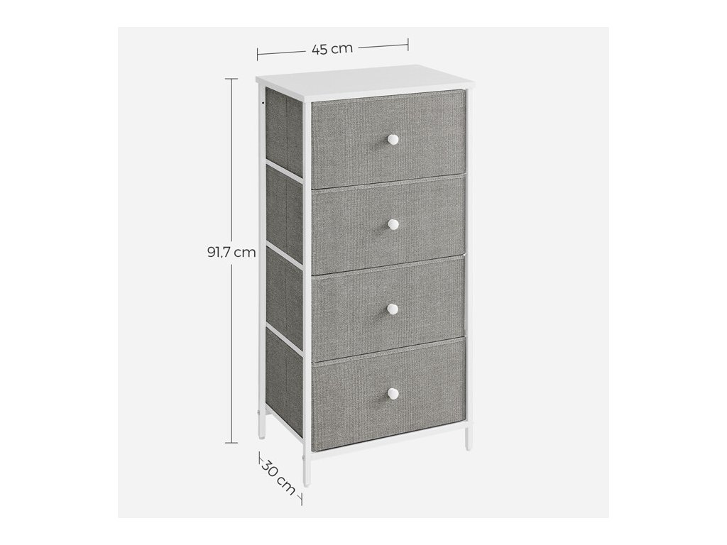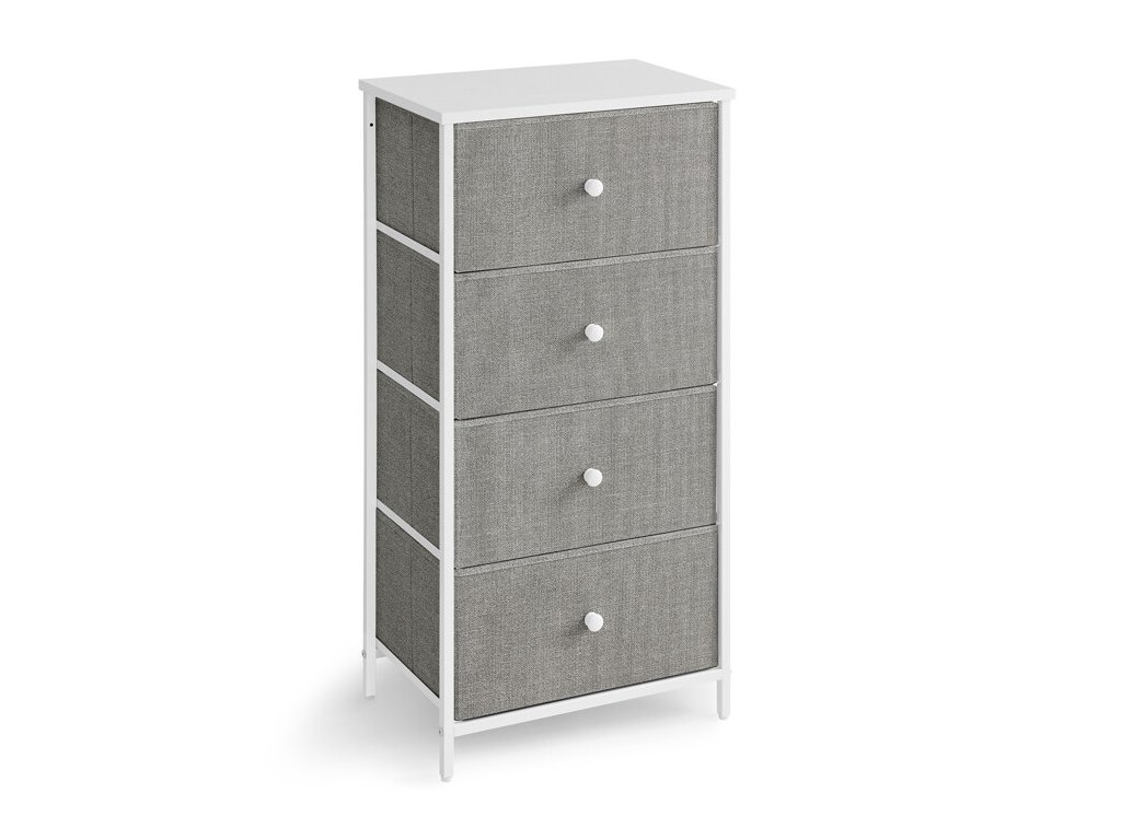 Komoda s rozmermi 45x30x92 cm kombinuje pevnú MDF dosku s matnou povrchovou úpravou v bielej farbe a stabilnú kovovú konštrukciu nôh. Štyri priestranné zásuvky z netkanej textílie v sivom odtieni poskytujú praktický úložný priestor pre rôzne drobnosti a zároveň uľahčujú organizáciu. Jednoduchý dizajn s decentnými bielymi úchytkami ladí s moderným aj škandinávskym štýlom interiéru. Komoda je navrhnutá tak, aby bola ľahká a zároveň dostatočne pevná pre každodenné použitie. Vďaka kompaktným rozmerom sa hodí do menších priestorov, kde je potrebné efektívne využiť miesto.