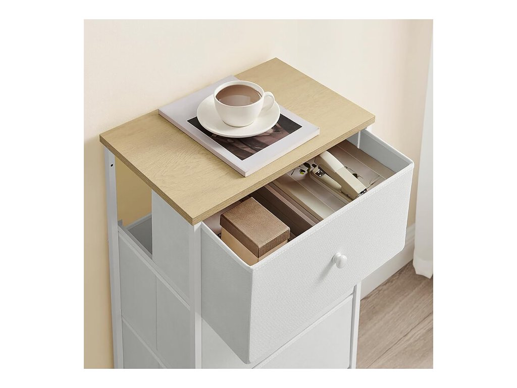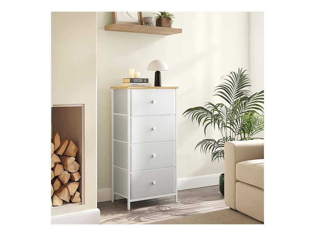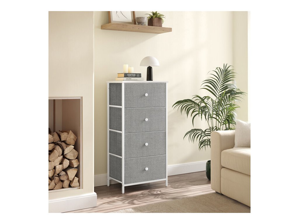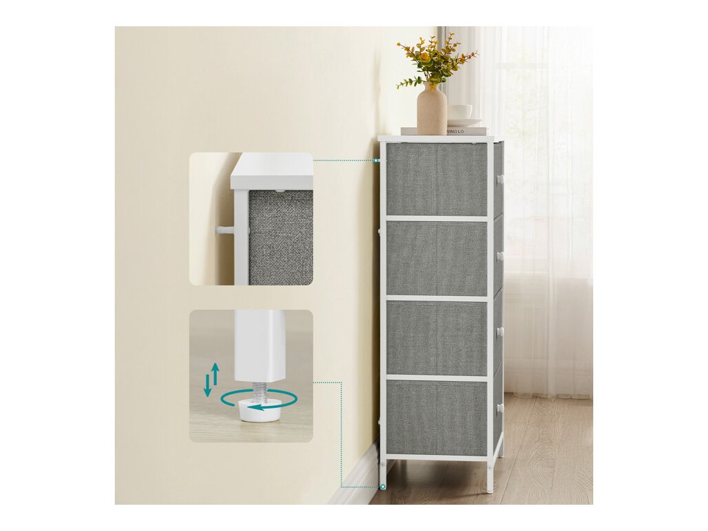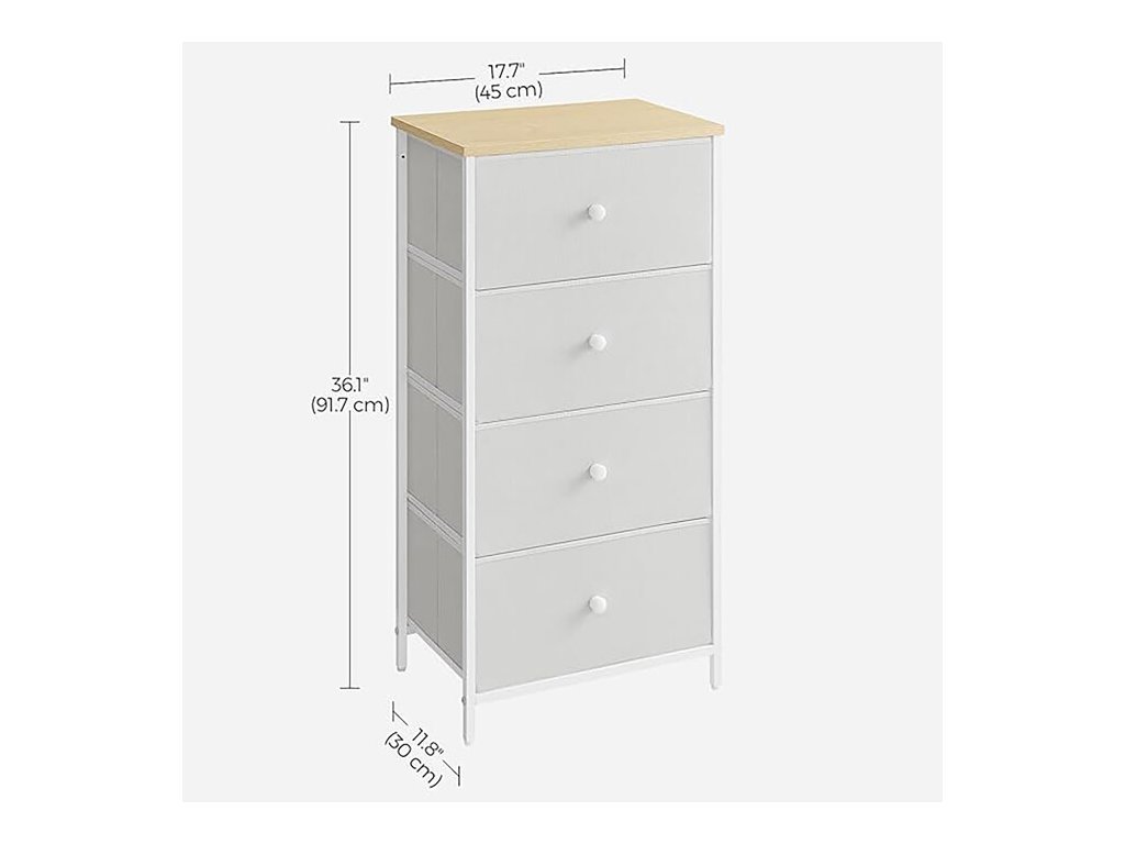 Komoda s rozmermi 45x30x92 cm kombinuje pevnú MDF dosku s matnou povrchovou úpravou v bielej farbe a stabilnú kovovú konštrukciu nôh. Štyri priestranné zásuvky z netkanej textílie v sivom odtieni poskytujú praktický úložný priestor pre rôzne drobnosti a zároveň uľahčujú organizáciu. Jednoduchý dizajn s decentnými bielymi úchytkami ladí s moderným aj škandinávskym štýlom interiéru. Komoda je navrhnutá tak, aby bola ľahká a zároveň dostatočne pevná pre každodenné použitie. Vďaka kompaktným rozmerom sa hodí do menších priestorov, kde je potrebné efektívne využiť miesto.