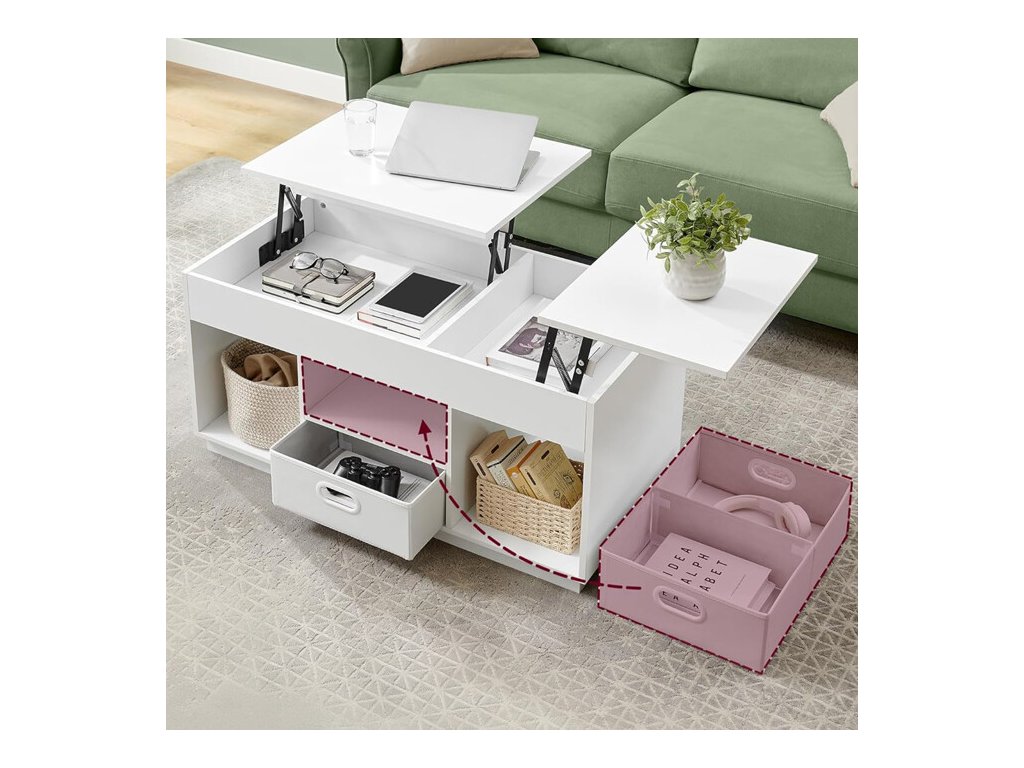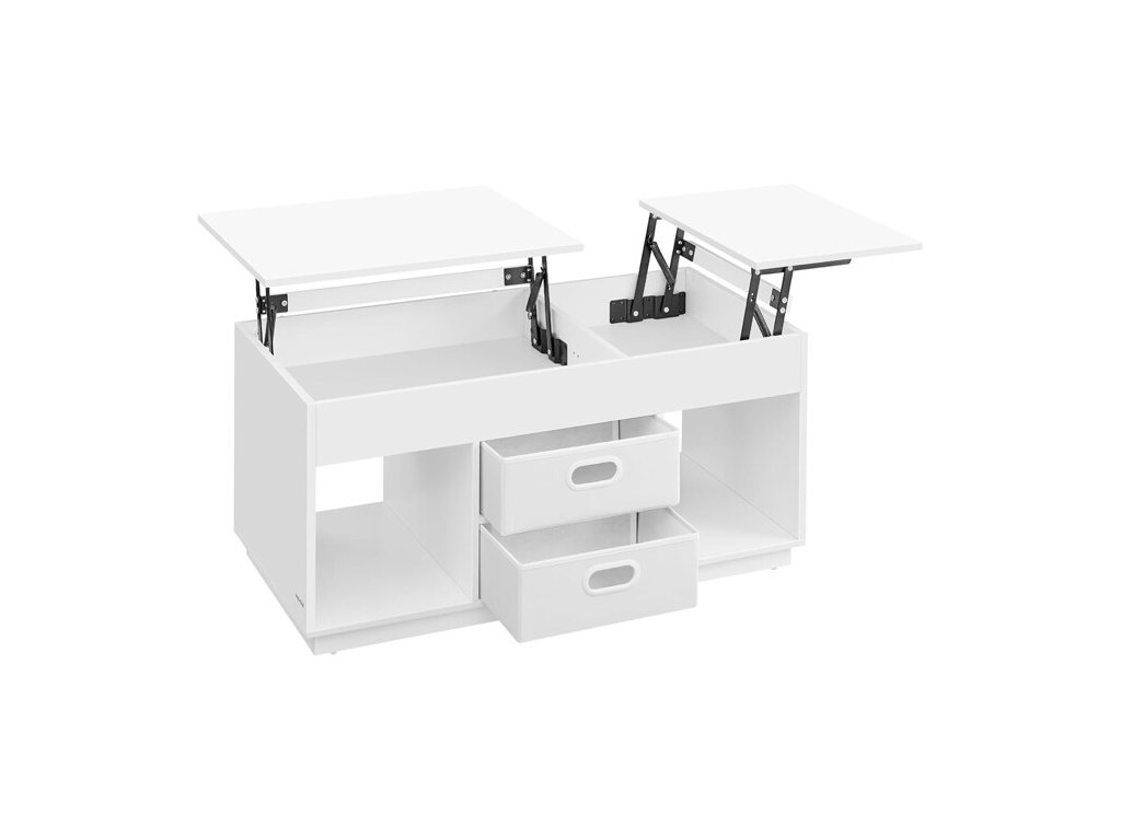 Konferenčný stolík v bielej farbe kombinuje MDF dosku s drevotrieskovým korpusom a pevnými oceľovými prvkami, ktoré zabezpečujú stabilitu a dlhú životnosť. Stolík ponúka praktický úložný priestor vďaka dvom výklopným doskámi, ktoré umožňujú jednoduchý prístup k vnútornému priestoru na uloženie drobností. Dve zásuvky v strede poskytujú ďalšie miesto na organizáciu, zatiaľ čo otvorené police na bokoch rozširujú možnosti uskladnenia. Výška stolíka je nastaviteľná v rozmedzí 48,5 až 62 cm, čo umožňuje prispôsobenie podľa potreby. Kompaktné rozmery 100 × 50 cm zabezpečujú vhodnosť do moderných obývacích izieb aj kancelárií.