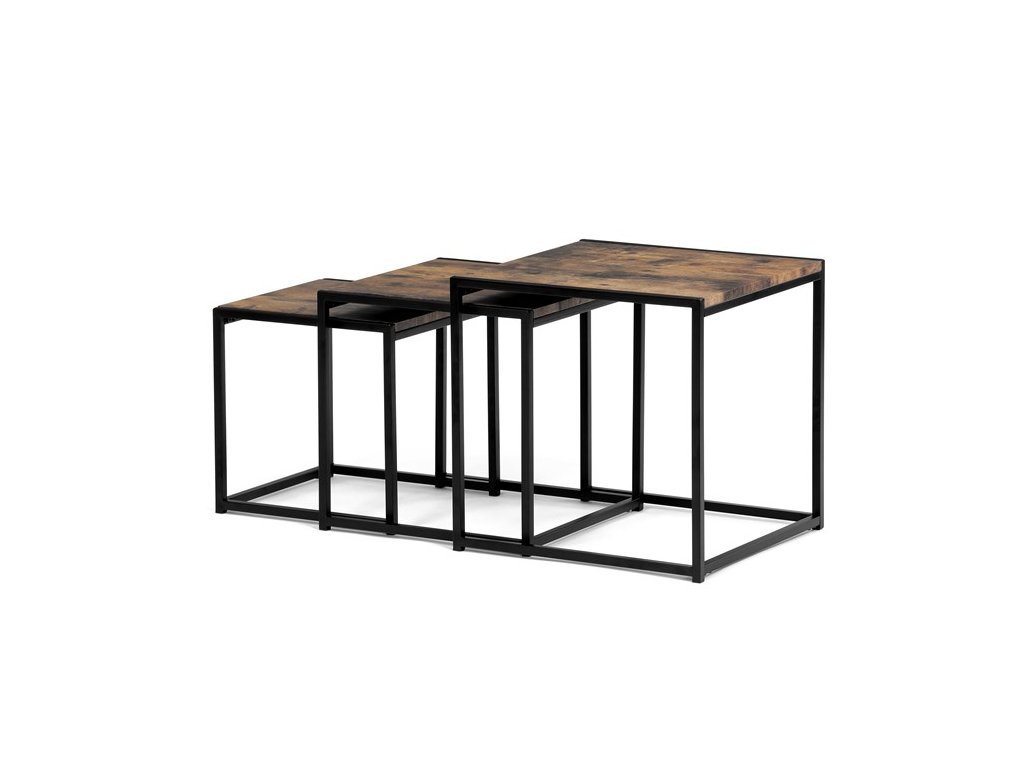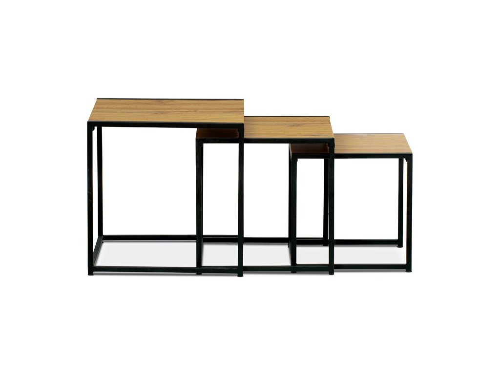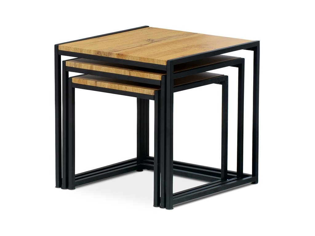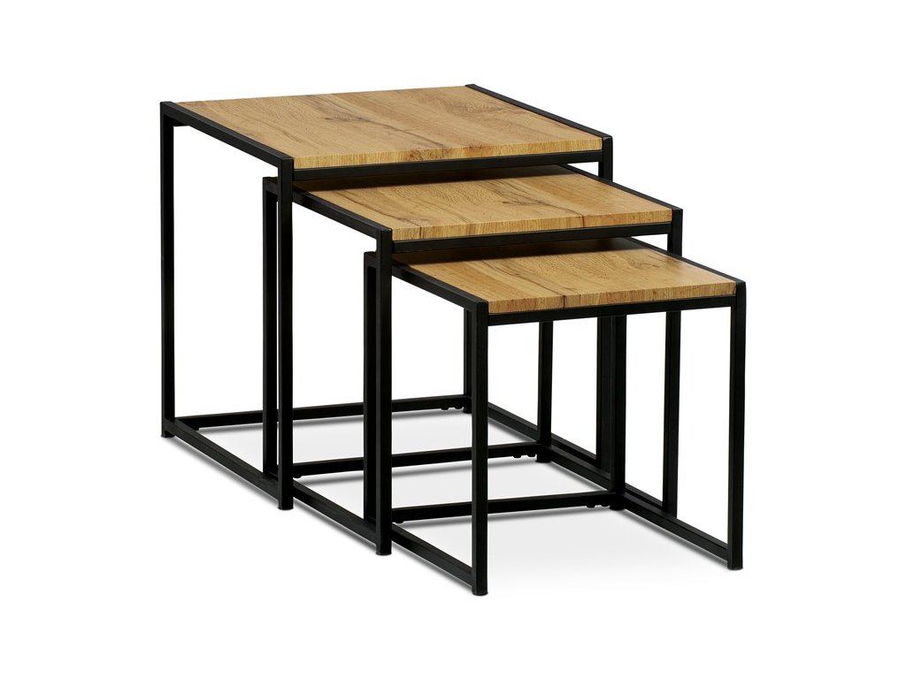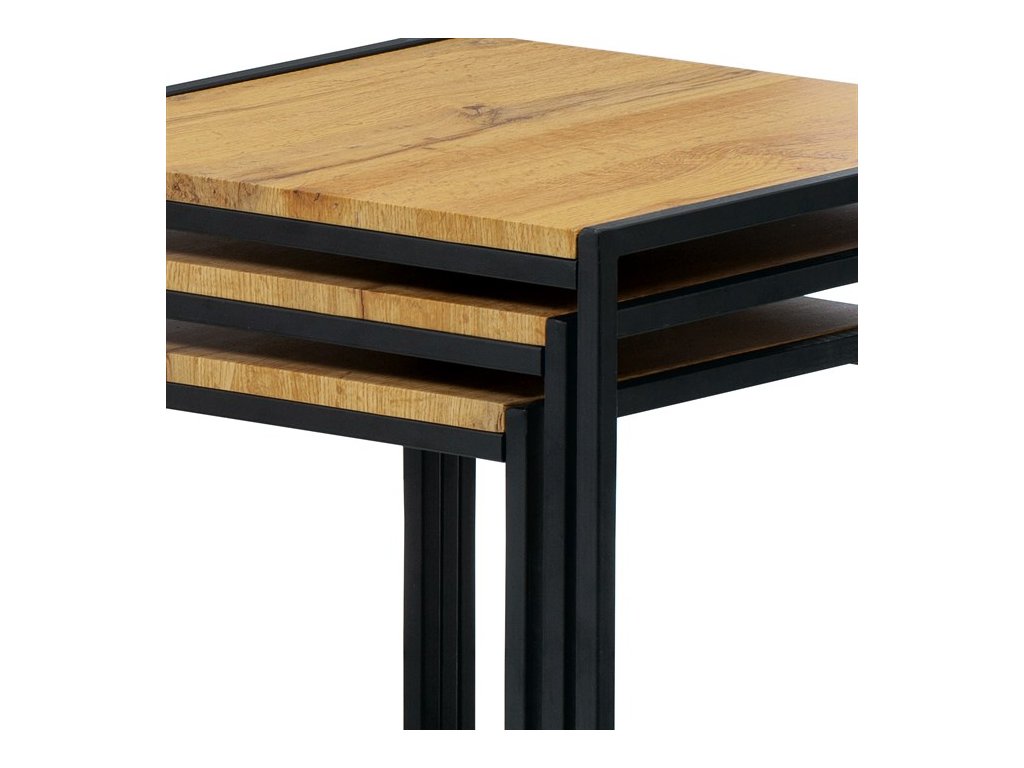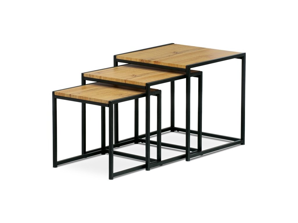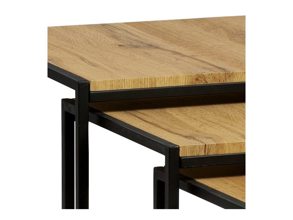 Set troch odkladacích stolíkov AF-3003 OAK kombinuje pevnú MDF dosku s dekoratívnym povrchom v odtieni divokého dubu a stabilnú kovovú podnož v čiernom laku. Stolíky sú navrhnuté tak, aby sa dali elegantne zasunúť jeden pod druhý, čo šetrí miesto a umožňuje variabilné využitie v interiéri. Minimalistický dizajn s tenkými kovovými rámami podčiarkuje moderný industriálny štýl a prírodný dekor dosiek prináša do priestoru teplý a prirodzený vzhľad. Každý stolík je vhodný na odkladanie drobných predmetov, kvetín alebo ako doplnok k sedacej súprave. Rozmery jednotlivých stolíkov umožňujú jednoduchú manipuláciu a ich kvalitné spracovanie zaručuje dlhú životnosť.