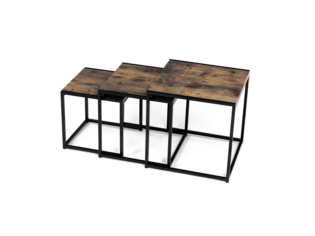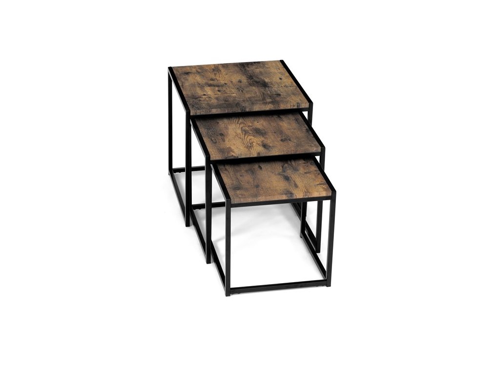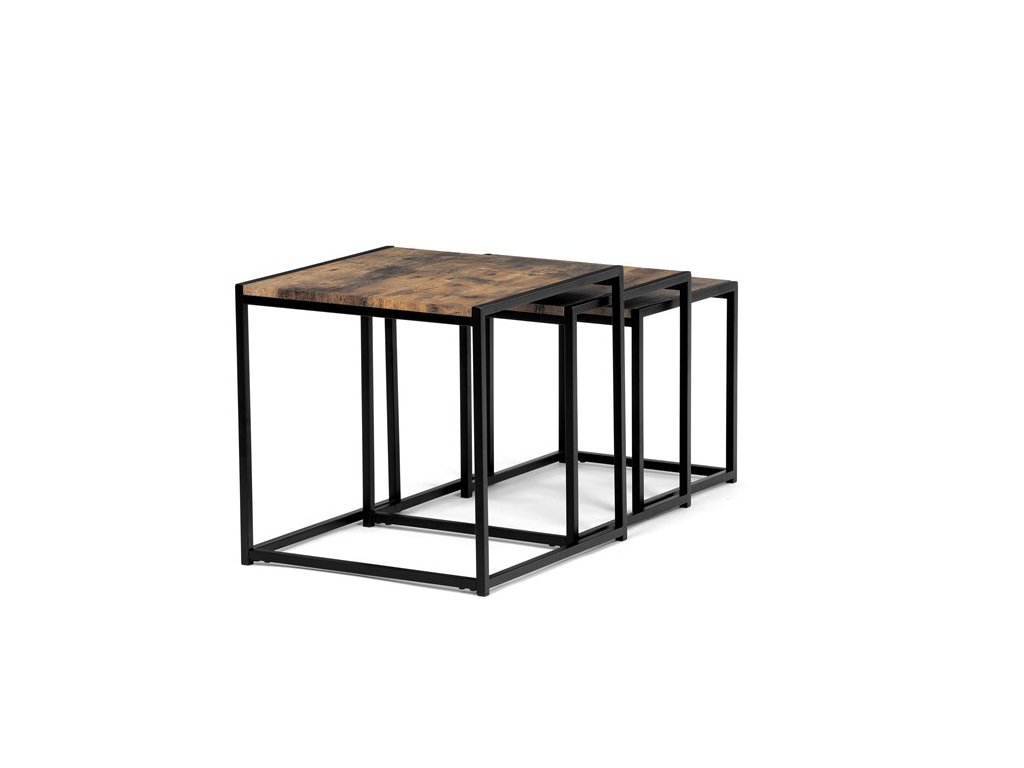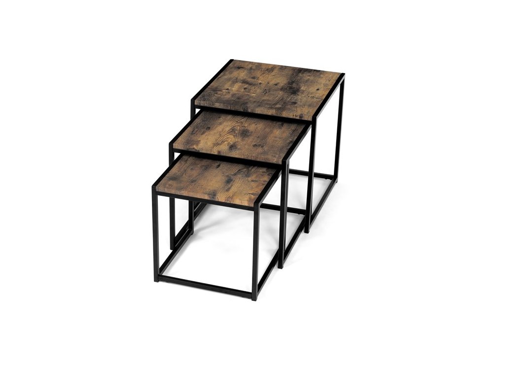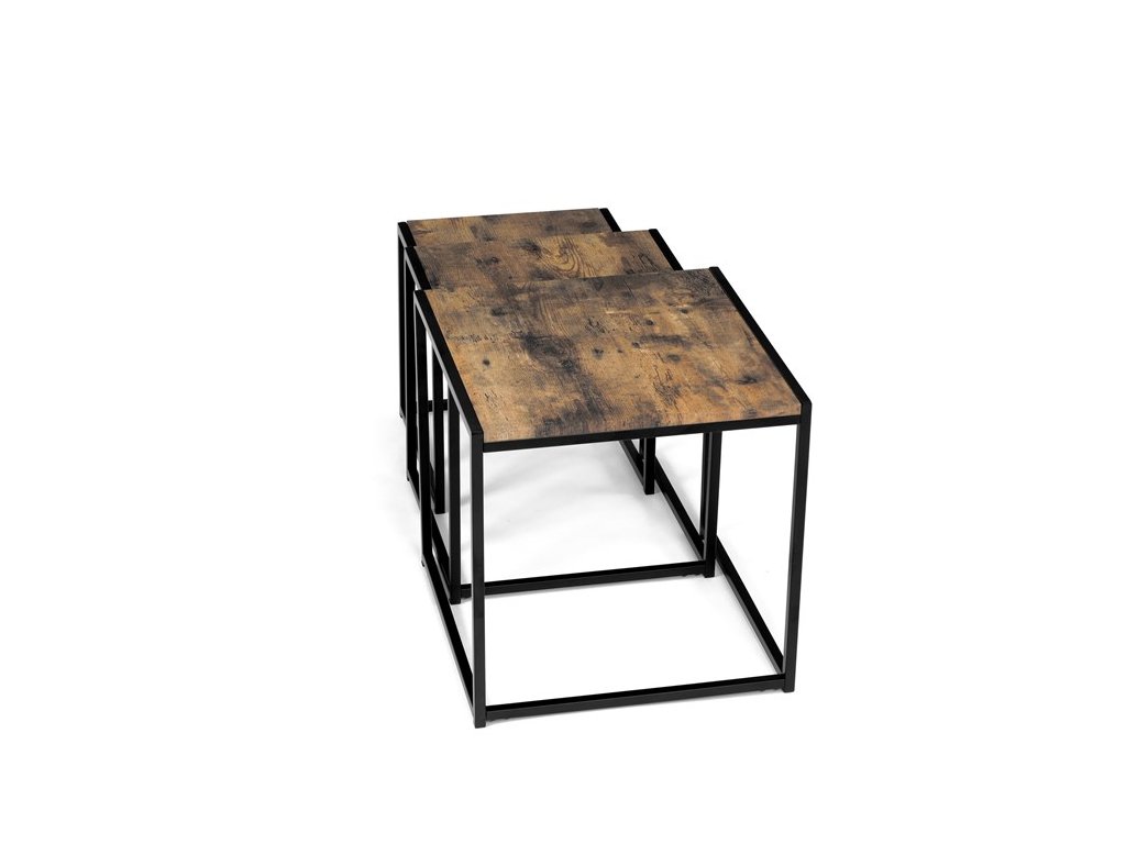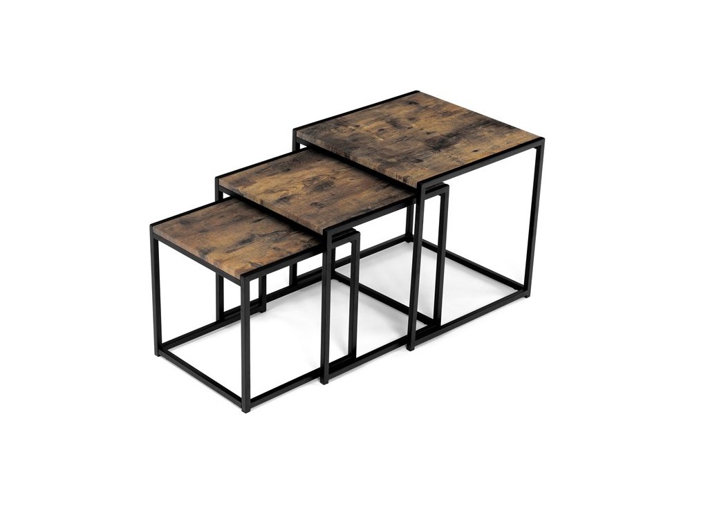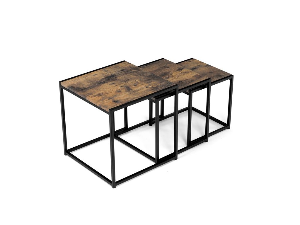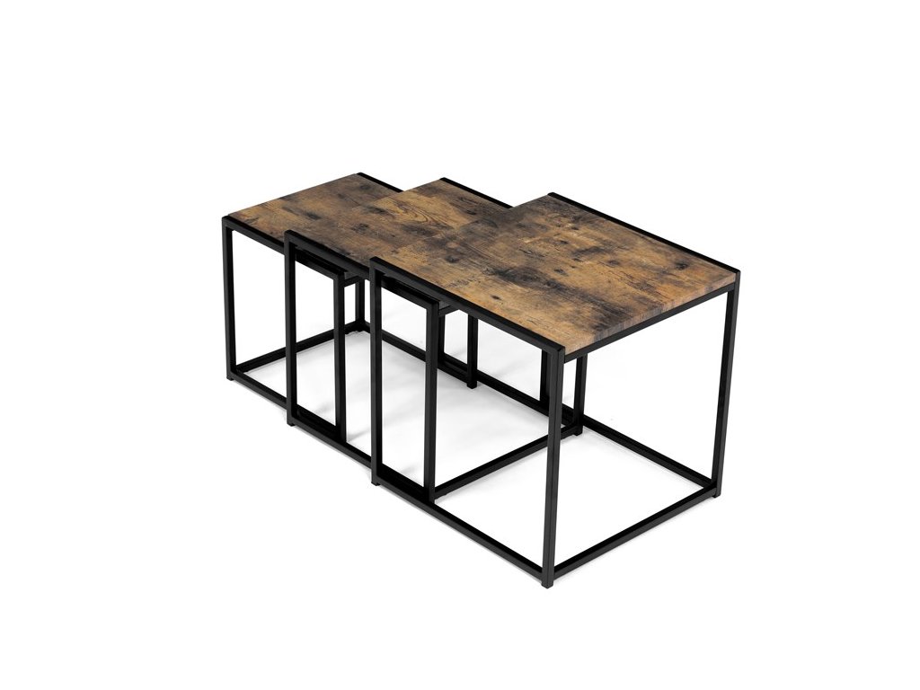 Set troch odkladacích stolíkov AF-3003 OAK kombinuje pevnú MDF dosku s dekoratívnym povrchom v odtieni divokého dubu a stabilnú kovovú podnož v čiernom laku. Stolíky sú navrhnuté tak, aby sa dali elegantne zasunúť jeden pod druhý, čo šetrí miesto a umožňuje variabilné využitie v interiéri. Minimalistický dizajn s tenkými kovovými rámami podčiarkuje moderný industriálny štýl a prírodný dekor dosiek prináša do priestoru teplý a prirodzený vzhľad. Každý stolík je vhodný na odkladanie drobných predmetov, kvetín alebo ako doplnok k sedacej súprave. Rozmery jednotlivých stolíkov umožňujú jednoduchú manipuláciu a ich kvalitné spracovanie zaručuje dlhú životnosť.