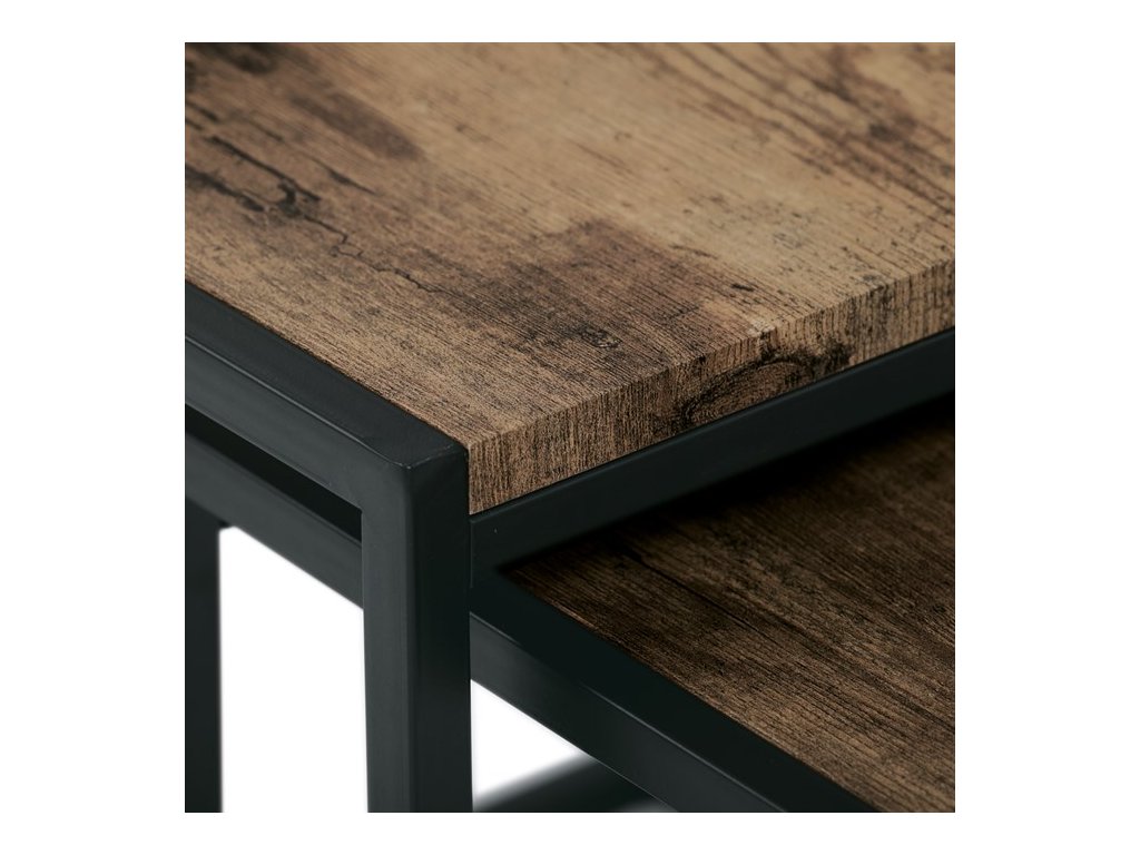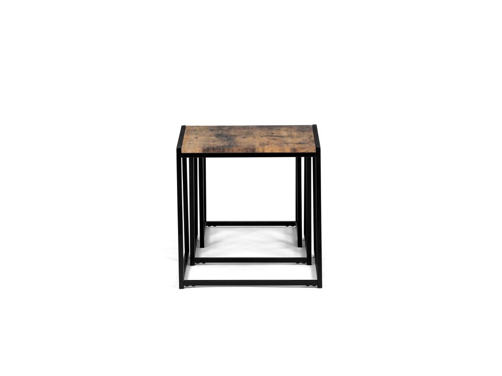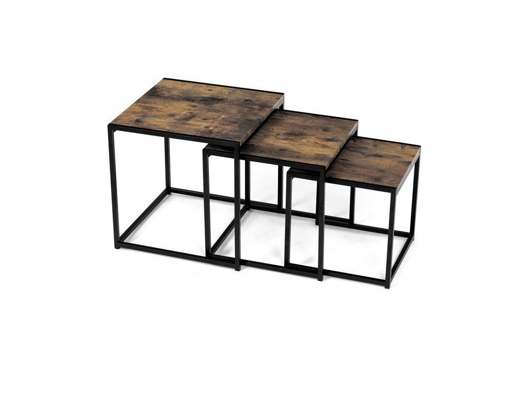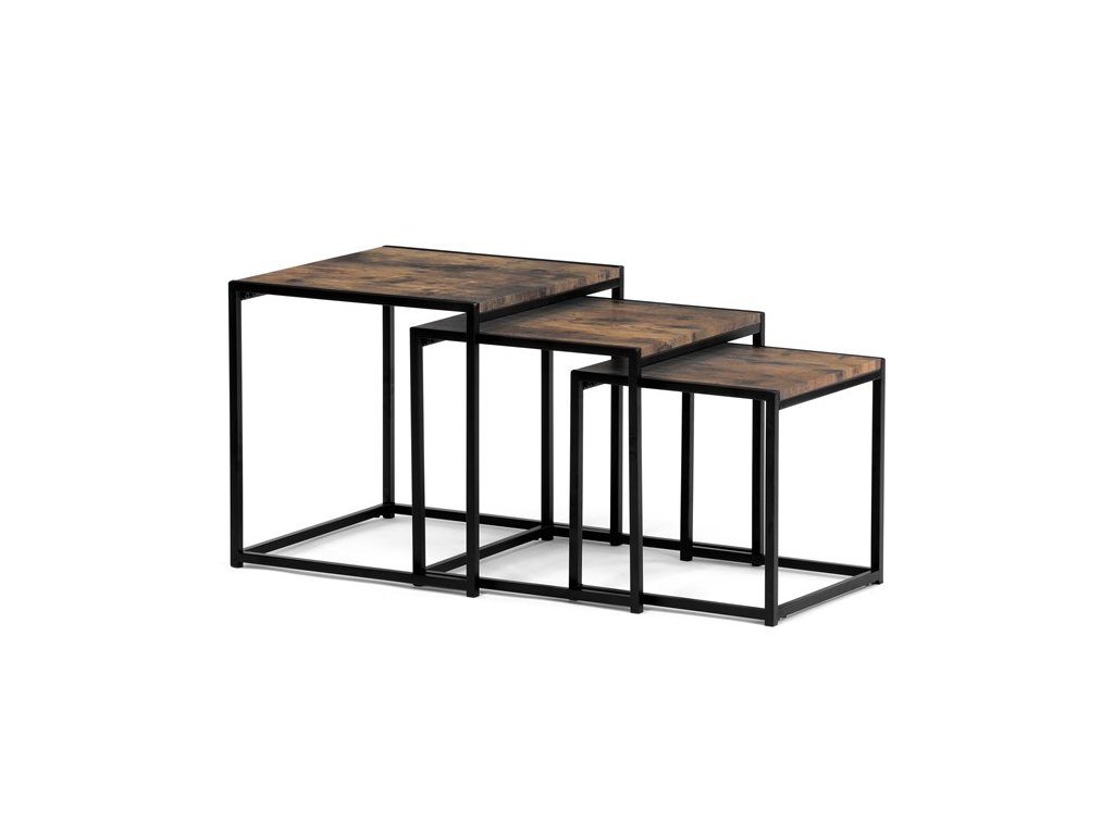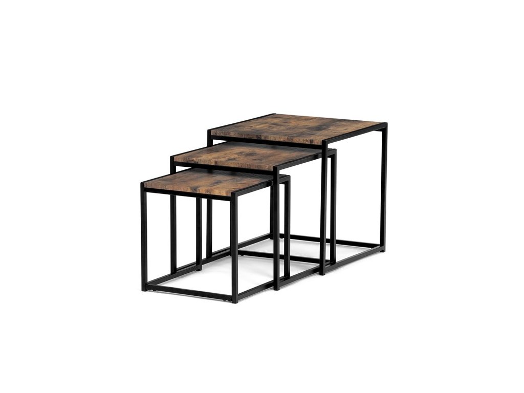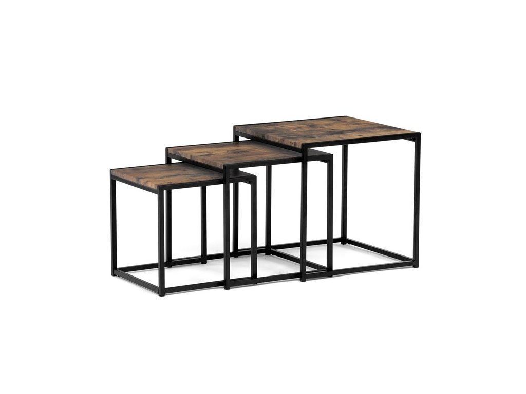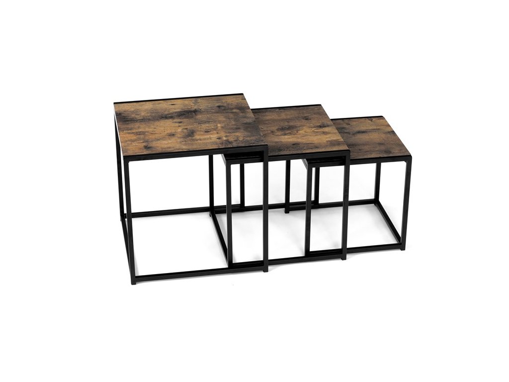 Set troch odkladacích stolíkov AF-3003 OAK kombinuje pevnú MDF dosku s dekoratívnym povrchom v odtieni divokého dubu a stabilnú kovovú podnož v čiernom laku. Stolíky sú navrhnuté tak, aby sa dali elegantne zasunúť jeden pod druhý, čo šetrí miesto a umožňuje variabilné využitie v interiéri. Minimalistický dizajn s tenkými kovovými rámami podčiarkuje moderný industriálny štýl a prírodný dekor dosiek prináša do priestoru teplý a prirodzený vzhľad. Každý stolík je vhodný na odkladanie drobných predmetov, kvetín alebo ako doplnok k sedacej súprave. Rozmery jednotlivých stolíkov umožňujú jednoduchú manipuláciu a ich kvalitné spracovanie zaručuje dlhú životnosť.