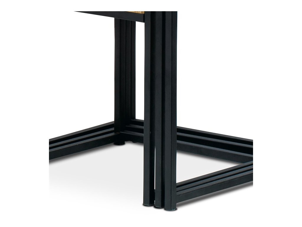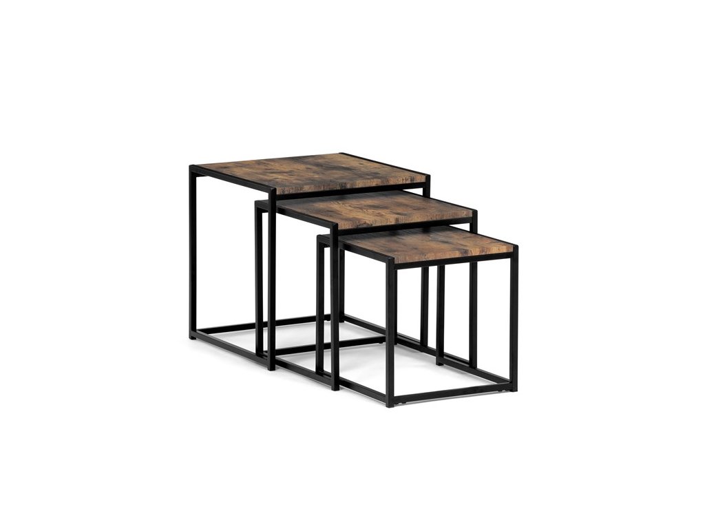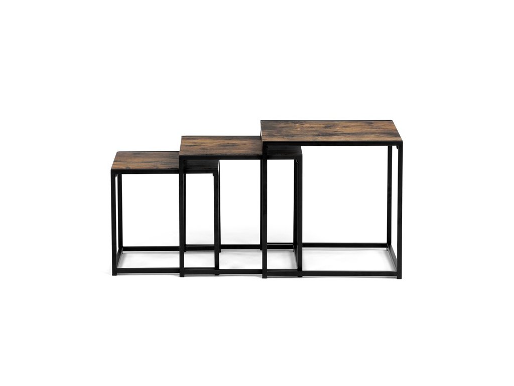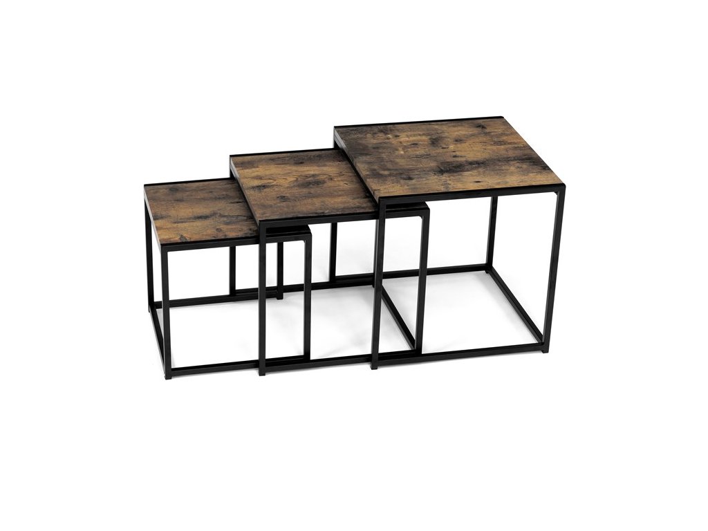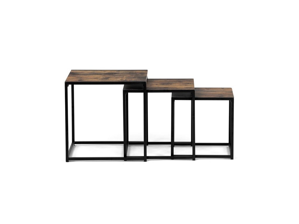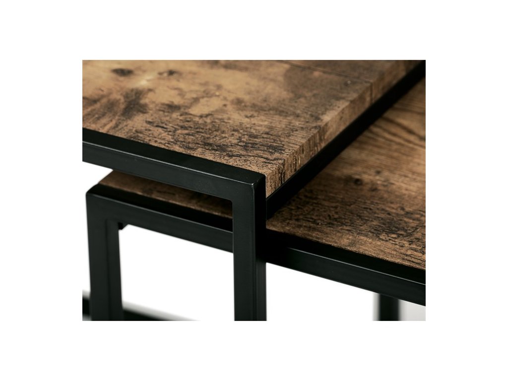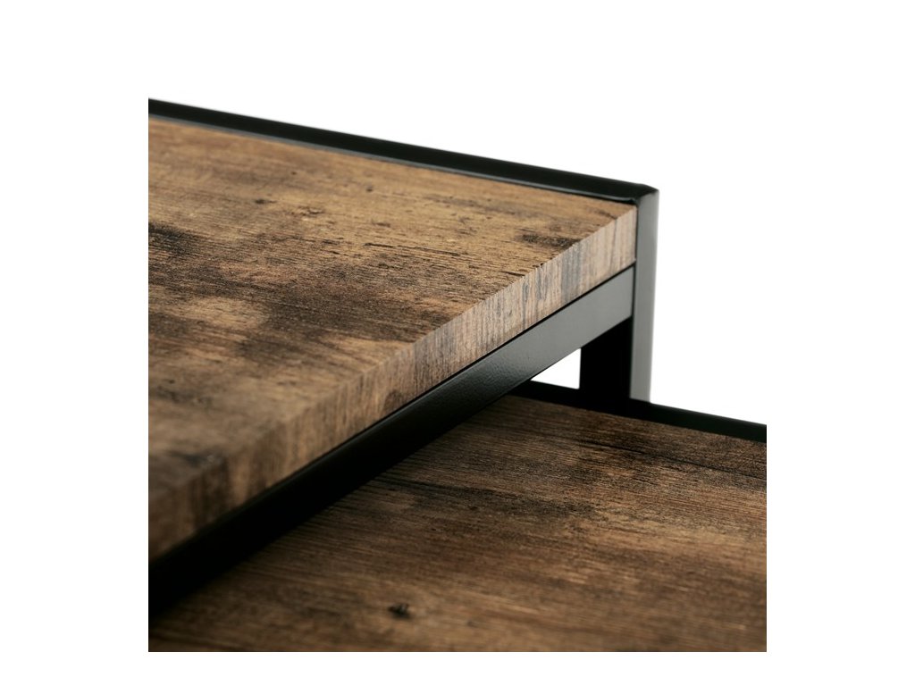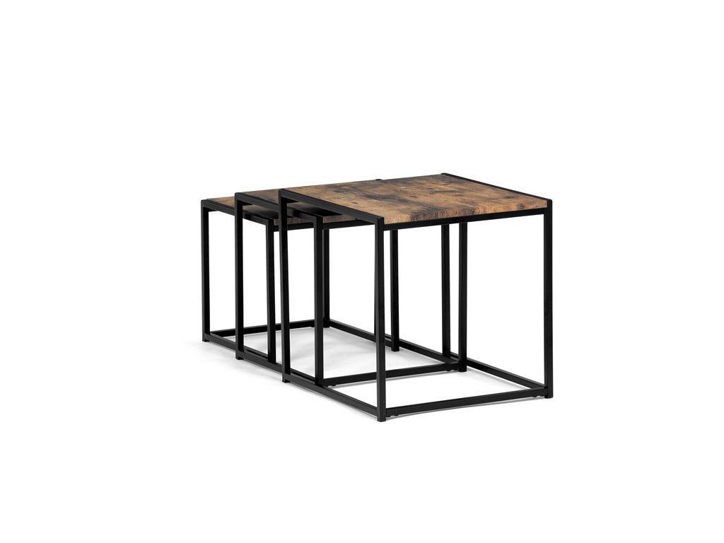 Set troch odkladacích stolíkov AF-3003 OAK kombinuje pevnú MDF dosku s dekoratívnym povrchom v odtieni divokého dubu a stabilnú kovovú podnož v čiernom laku. Stolíky sú navrhnuté tak, aby sa dali elegantne zasunúť jeden pod druhý, čo šetrí miesto a umožňuje variabilné využitie v interiéri. Minimalistický dizajn s tenkými kovovými rámami podčiarkuje moderný industriálny štýl a prírodný dekor dosiek prináša do priestoru teplý a prirodzený vzhľad. Každý stolík je vhodný na odkladanie drobných predmetov, kvetín alebo ako doplnok k sedacej súprave. Rozmery jednotlivých stolíkov umožňujú jednoduchú manipuláciu a ich kvalitné spracovanie zaručuje dlhú životnosť.