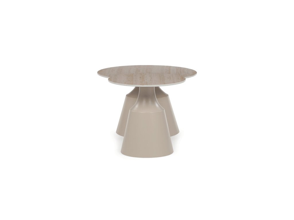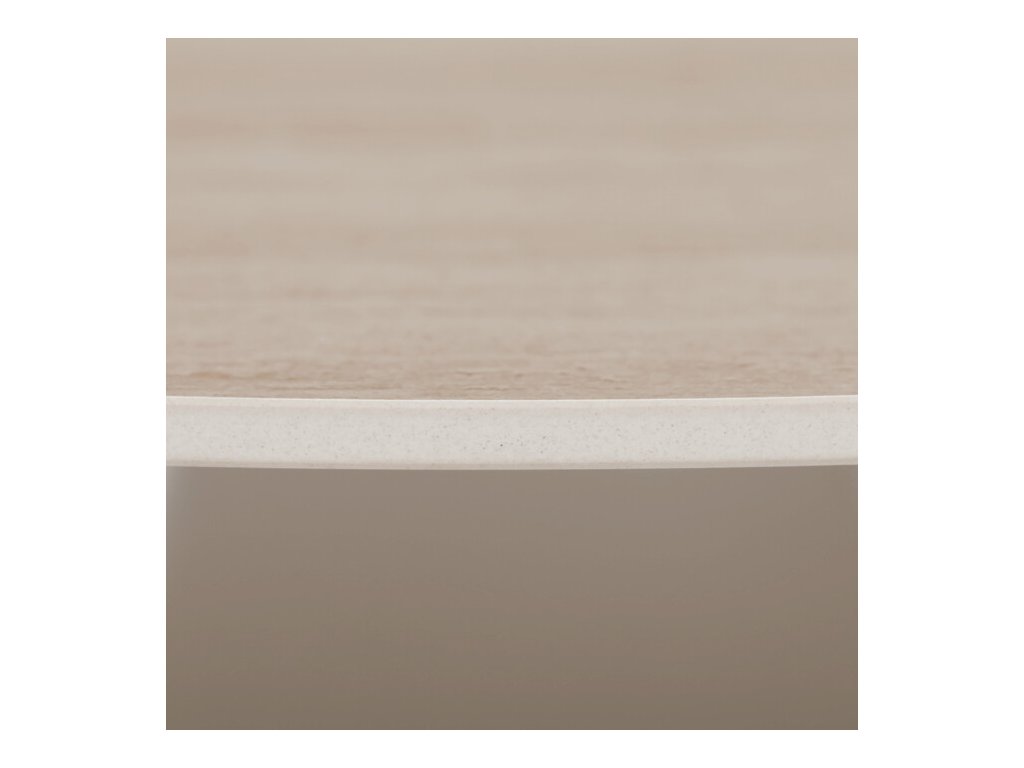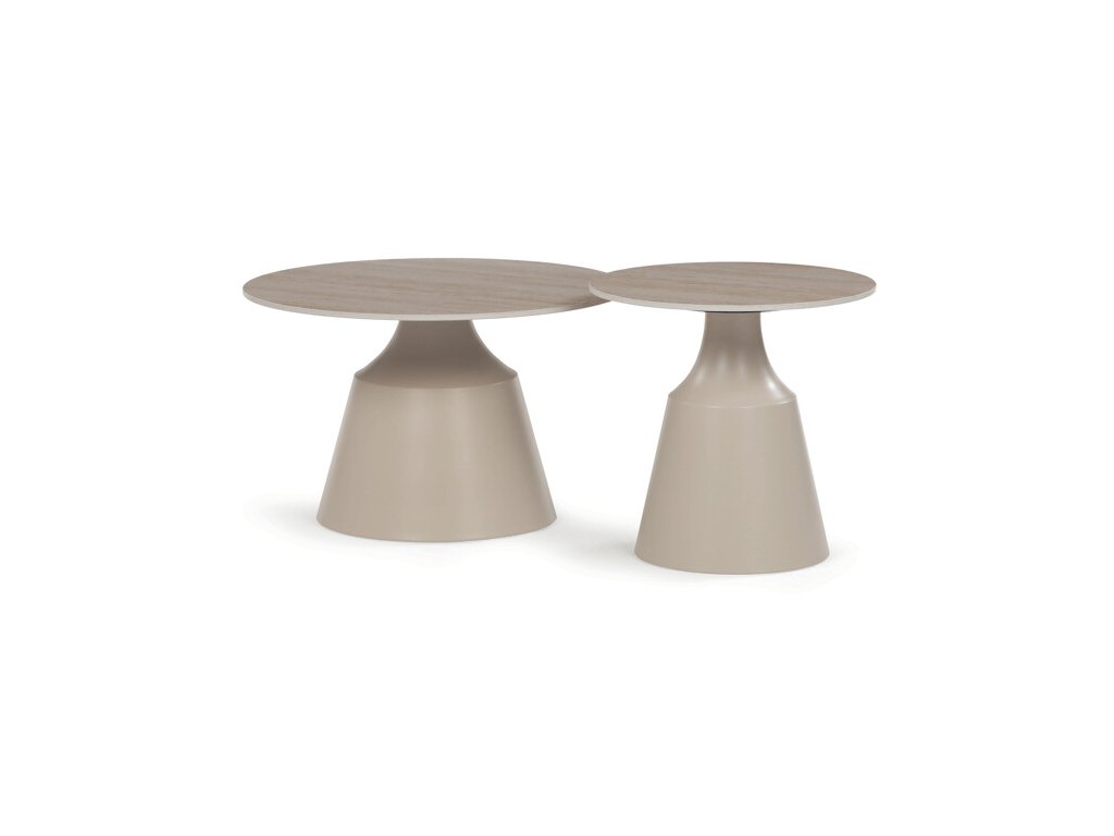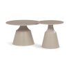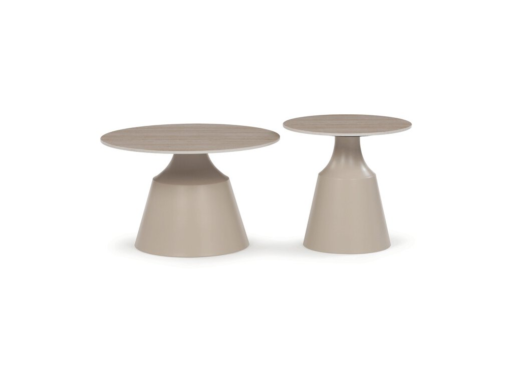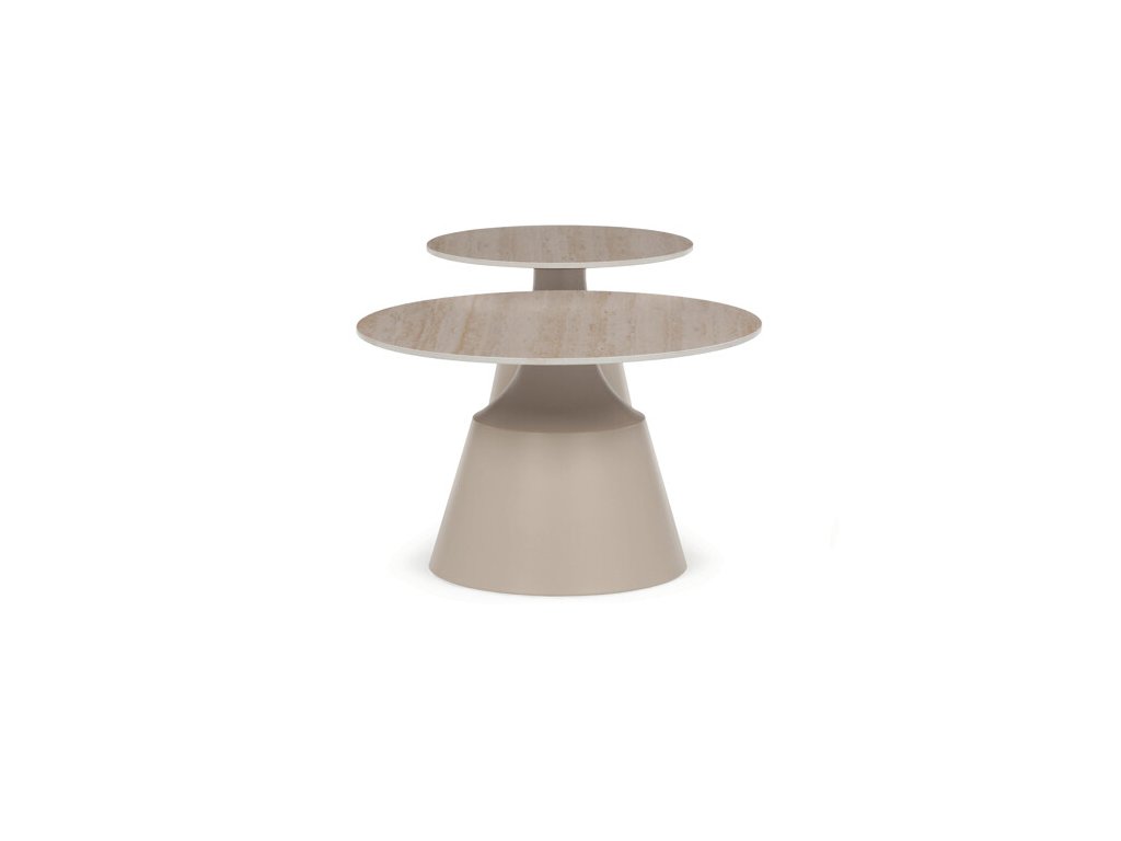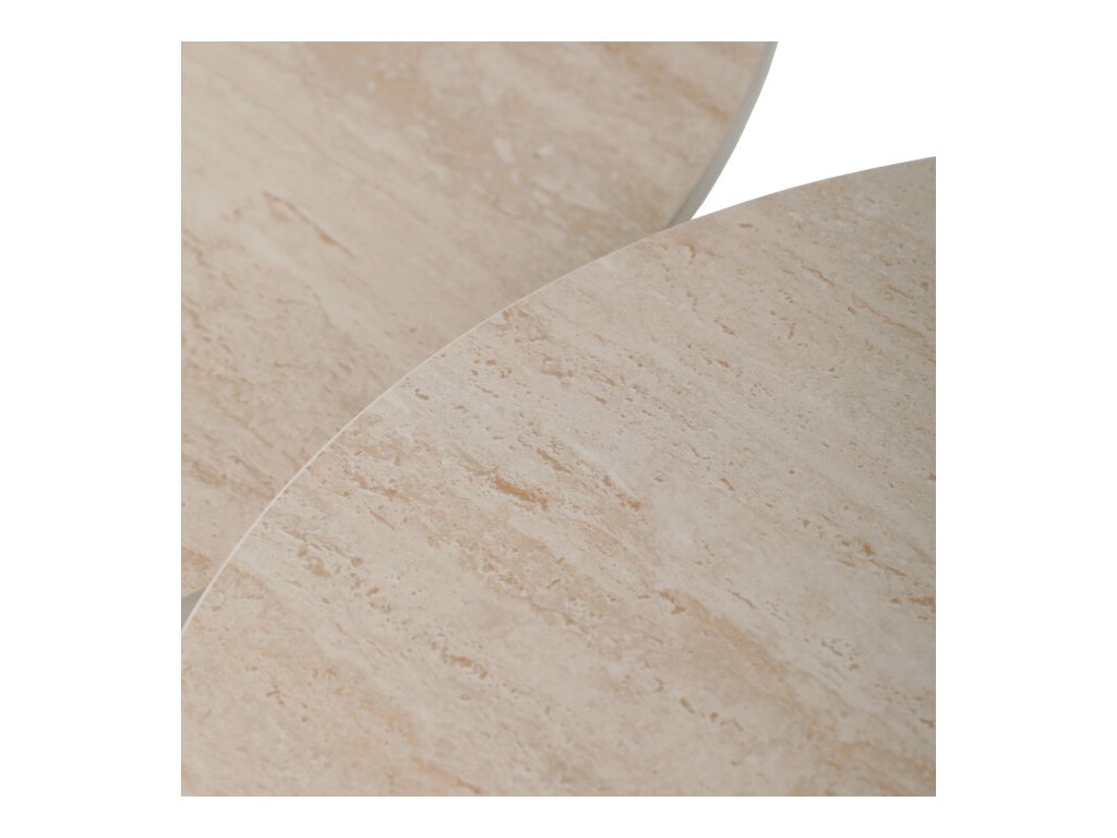 Sada dvoch konferenčných stolov v béžovom odtieni kombinuje keramické dosky s matnou povrchovou úpravou a stabilné kovové podnože, ktoré zabezpečujú pevnosť a dlhú životnosť. Väčší stôl má priemer 70 cm a výšku 43,5 cm, menší potom priemer 50 cm a výšku 48,5 cm, čo umožňuje variabilné usporiadanie v priestore. Keramická doska je odolná voči poškriabaniu a ľahko sa udržiava, čo prispieva k praktickému využitiu v moderných interiéroch. Kovová podnož je navrhnutá pre stabilitu a bezpečné umiestnenie na rôznych typoch podláh. Dizajn stolov s jemným travertínovým vzorom dodáva priestoru prírodný a zároveň súčasný vzhľad.