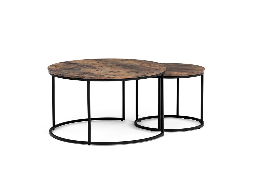 Set 2 ks konferenčných, ale aj prístavných alebo odkladacích stolov prinesie do vášho domova nielen praktickosť, variabilitu, ale aj industriálny šarm. Stolíky môžete rozmiestniť jednotlivo po interiéri, kde Vám vytvoria zaujímavé odkladacie prvky v rôznych výškových hladinách. Alebo spoločne povytiahnuté, kde vytvoríte veľkú odkladaciu plochu v tvare čísla 8. Veľkou výhodou je možnosť zasunutia stolíkov do seba, čo oceníte pri upratovaní, skladovaní alebo pri potrebe väčšieho priestoru. A iste zaujmú nielen už uvedenú praktickosťou, ale aj svojim stroho čistým a nadčasovým designem. Okrúhle dosky z MDF v dekore divoký dub harmonicky dopĺňa kovová konštrukcia po ich obvode v čiernom matnom práškovom nástreku. Tá tvorí aj nohy a celkovo stolíky spevňuje. Na spodnej lište sú umiestnené čierne plastové klzáky, ktoré zabraňujú poškodeniu povrchu podlahy pri presunoch stolíkov. Doska s hrúbkou 1,5 cm má priemer veľmi príjemných 80 cm, menší 50 cm, výška stolov je 46 a 41 cm4. Konštrukcia je štvorcového prierezu. Nosnosť jednotlivého stolíka je do 30 kg.