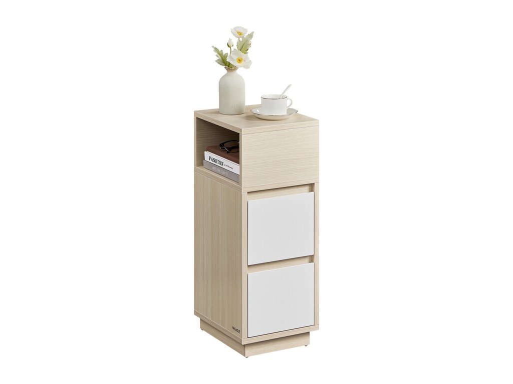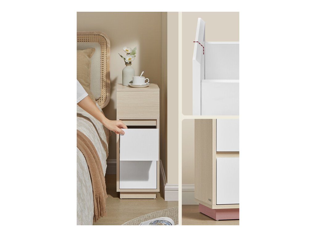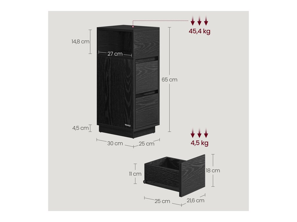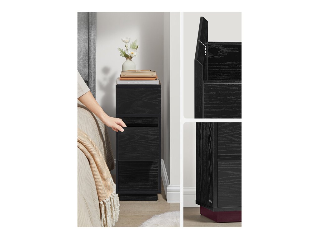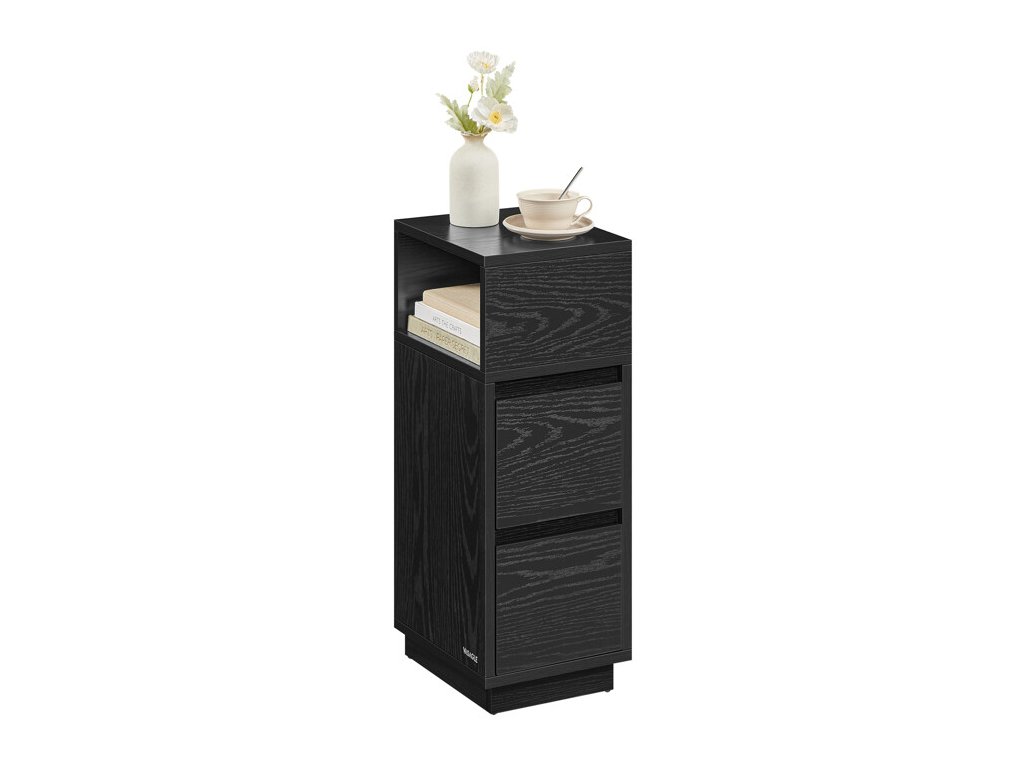 Nočný stolík v čiernom prevedení kombinuje pevnú MDF dosku s praktickým úložným priestorom, ktorý zahŕňa otvorenú priehradku a dve zásuvky. Kompaktné rozmery 25 × 30 × 65 cm umožňujú jednoduché umiestnenie vedľa postele aj v menších miestnostiach. Povrchová úprava s výraznou štruktúrou dreva dodáva stolíku moderný vzhľad a zároveň uľahčuje údržbu. Stabilná základňa zabezpečuje bezpečné postavenie a odolnosť pri každodennom používaní. Tento stolík je vhodný na uloženie kníh, drobných predmetov aj nočných potrieb.