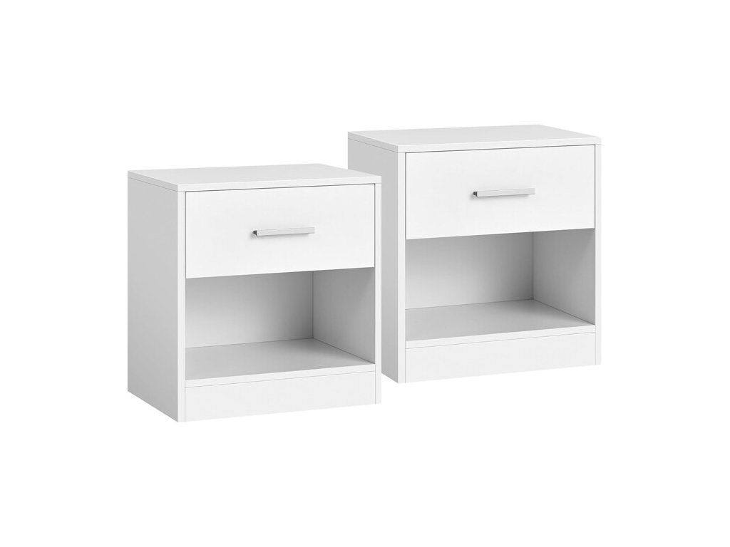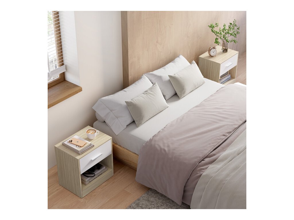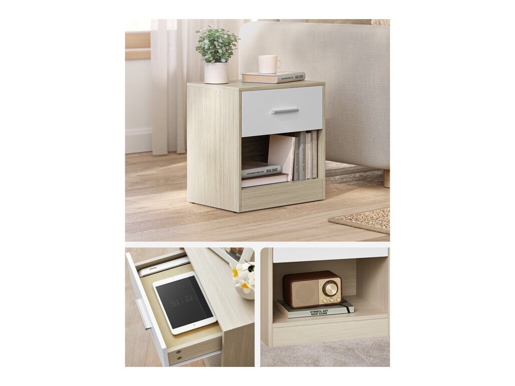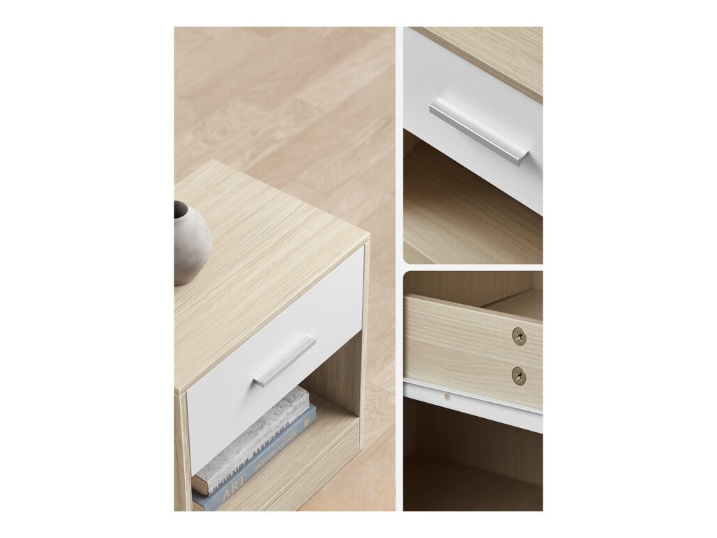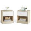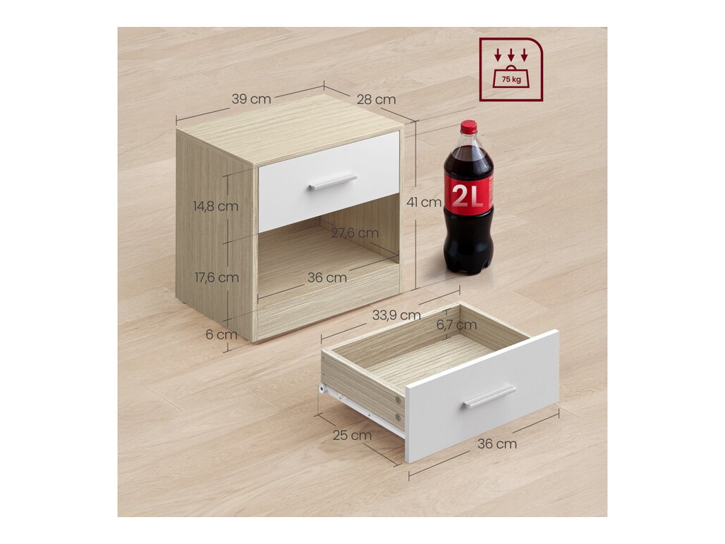 Sada dvoch nočných stolíkov v prírodnej béžovej farbe s bielymi čelami zásuviek ponúka praktické riešenie na usporiadanie priestoru vedľa postele. Sú vyrobené z MDF s matnou povrchovou úpravou v dekore bieleného dubu, ktorá zabezpečuje jednoduchú údržbu a odolnosť voči bežnému opotrebovaniu. Každý stolík má jednu zásuvku s jednoduchou úchytkou a otvorený úložný priestor pod ňou, vhodný na uloženie kníh alebo drobných predmetov. Kompaktné rozmery 39 × 27,6 × 41 cm umožňujú ľahké umiestnenie aj do menších priestorov. Stabilné prevedenie MDF materiálu zaručuje dlhú životnosť a pevnosť stolíka.