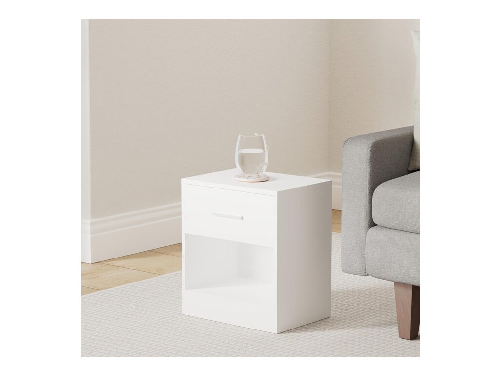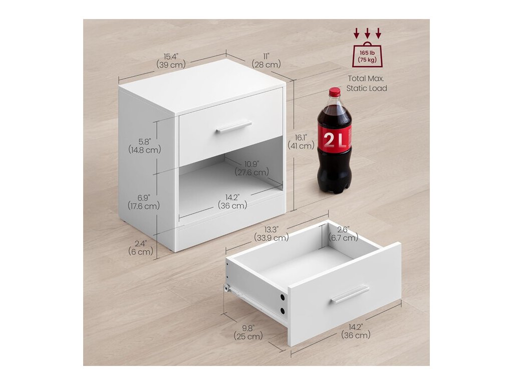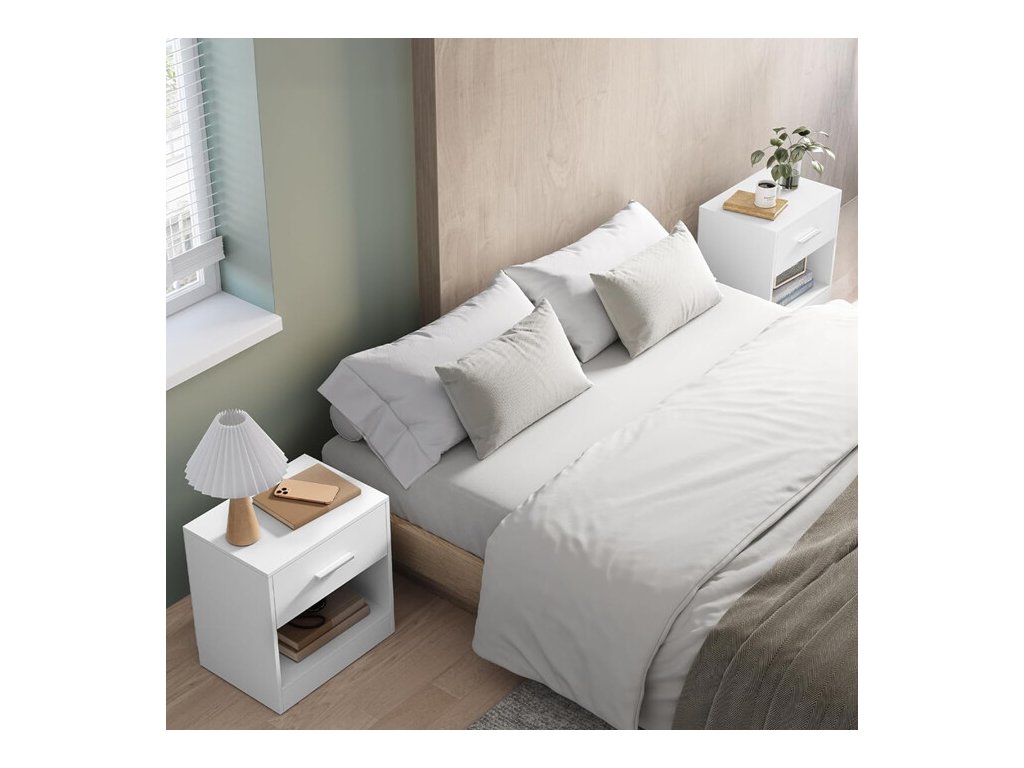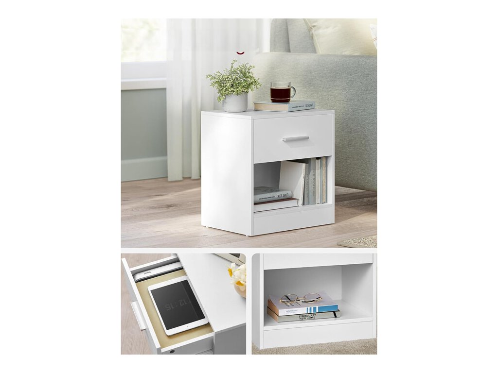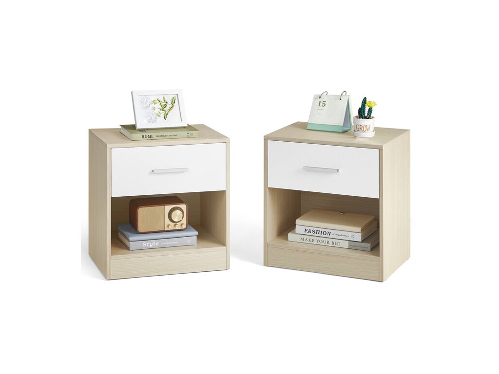 Sada dvoch nočných stolíkov v prírodnej béžovej farbe s bielymi čelami zásuviek ponúka praktické riešenie na usporiadanie priestoru vedľa postele. Sú vyrobené z MDF s matnou povrchovou úpravou v dekore bieleného dubu, ktorá zabezpečuje jednoduchú údržbu a odolnosť voči bežnému opotrebovaniu. Každý stolík má jednu zásuvku s jednoduchou úchytkou a otvorený úložný priestor pod ňou, vhodný na uloženie kníh alebo drobných predmetov. Kompaktné rozmery 39 × 27,6 × 41 cm umožňujú ľahké umiestnenie aj do menších priestorov. Stabilné prevedenie MDF materiálu zaručuje dlhú životnosť a pevnosť stolíka.