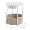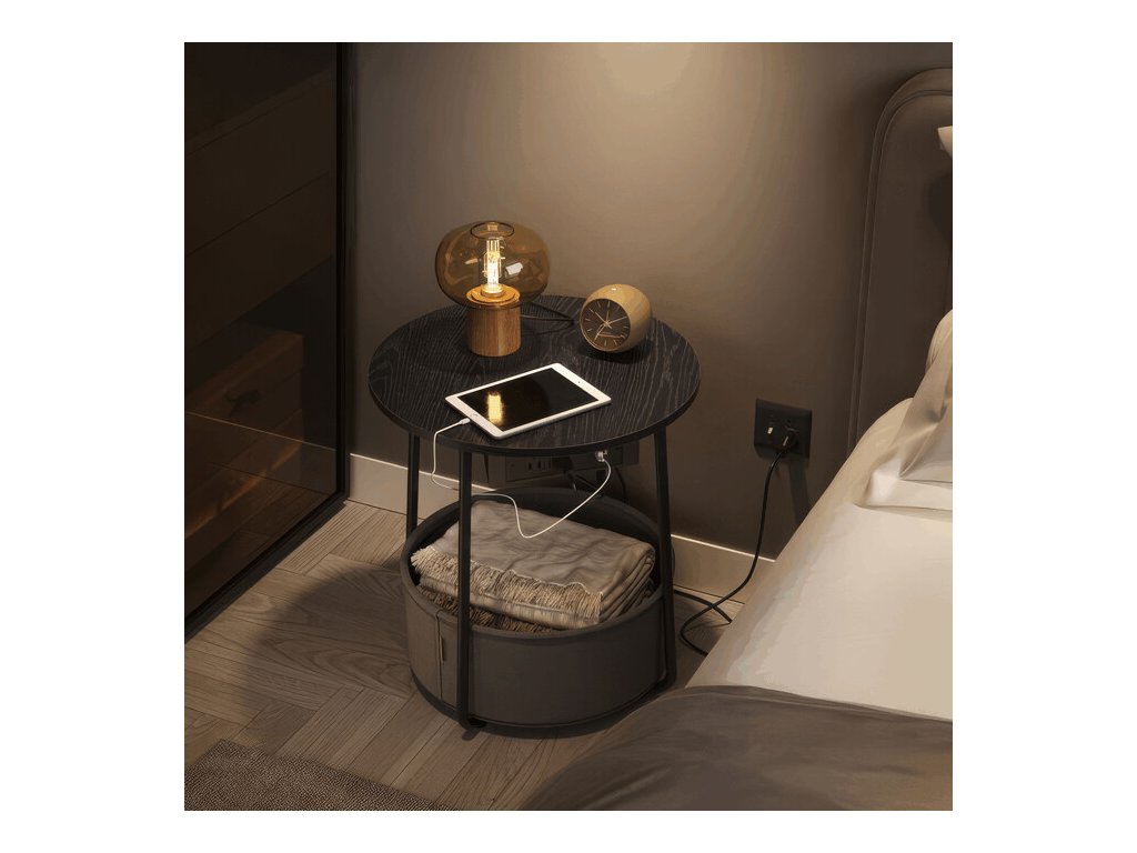Odkladací stolík značky Autronic kombinuje praktický dizajn s modernými funkciami. Kruhova doska s priemerom 45 cm je vyrobená z MDF s čiernym dekorom, ktorý ľahko zapadne do rôznych interiérov. Stabilné kovové nohy zabezpečujú pevnú oporu, zatiaľ čo textilný kôš pod doskou ponúka úložný priestor na drobnosti. Súčasťou stolíka je elektrická zásuvka s dvoma štandardnými výstupmi a dvoma USB portami, ktoré umožňujú pohodlné nabíjanie elektroniky priamo pri stolíku. Napájací kábel je pripevnený k rámu stolíka, čo uľahčuje organizáciu priestoru a zabraňuje zamotaniu. Výška stolíka je 50 cm, čo ho robí vhodným ako prístavný alebo odkladací stolík v obývacej izbe či pracovnom priestore.