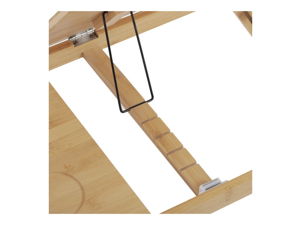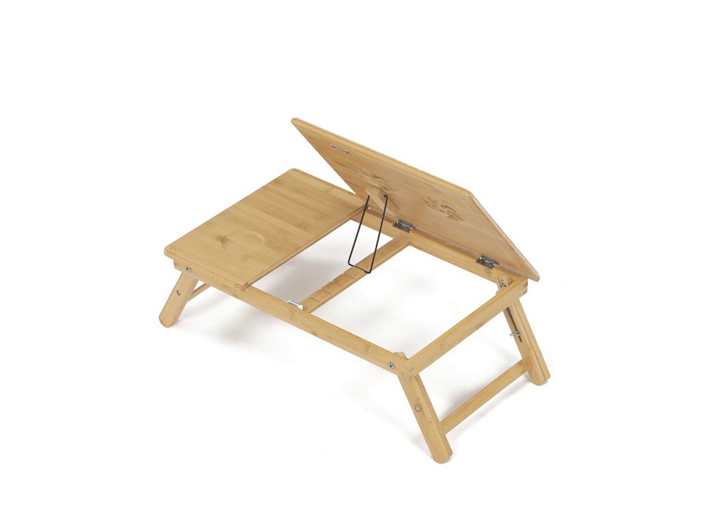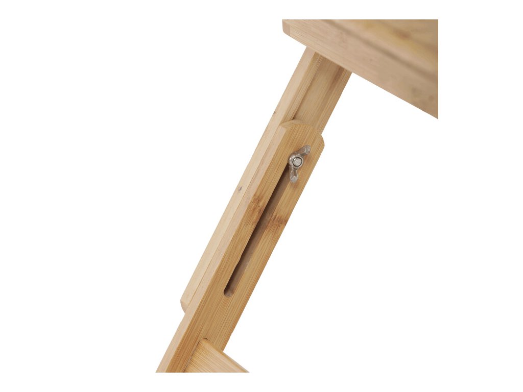 Skladací stolík na notebook z masívneho bambusu v prírodnom odtieni ponúka praktické a estetické riešenie pre prácu aj oddych. Doska stolíka je rozdelená na dve časti, pričom hlavná časť je nastaviteľná do niekoľkých uhlov a vybavená ventilačnými otvormi pre lepšie chladenie zariadenia. Vedľajšia plocha slúži ako odkladací priestor napríklad na myš alebo šálku. Pevné nohy z masívneho bambusu sú vybavené protišmykovými koncovkami a umožňujú jednoduché skladanie pre úsporu miesta pri skladovaní či preprave. Vďaka kvalitnému prírodnému materiálu sa stolík ľahko udržiava a je navrhnutý pre dlhú životnosť.