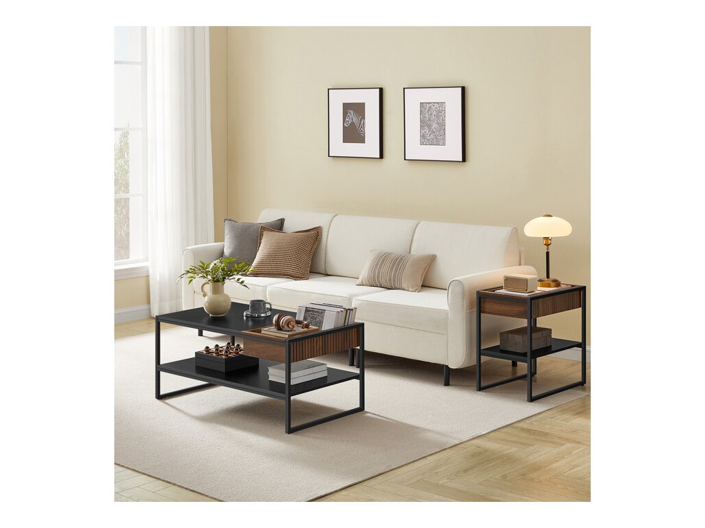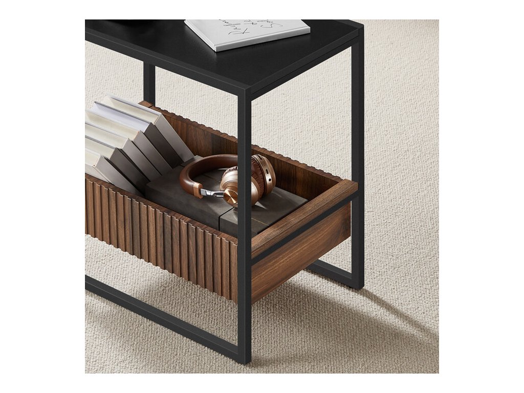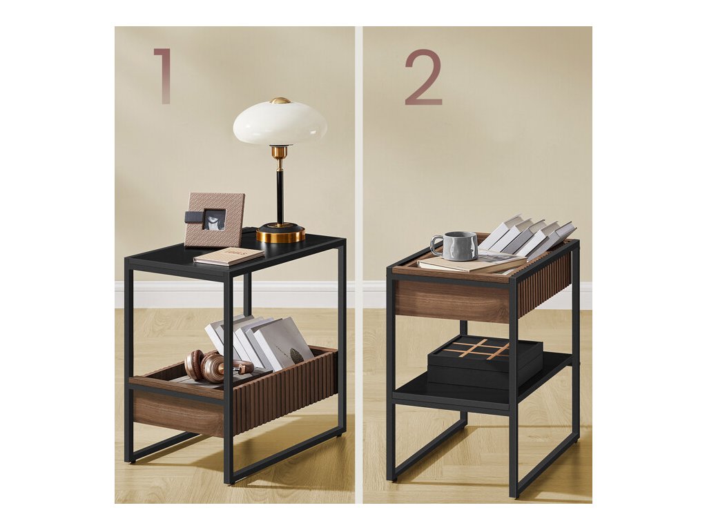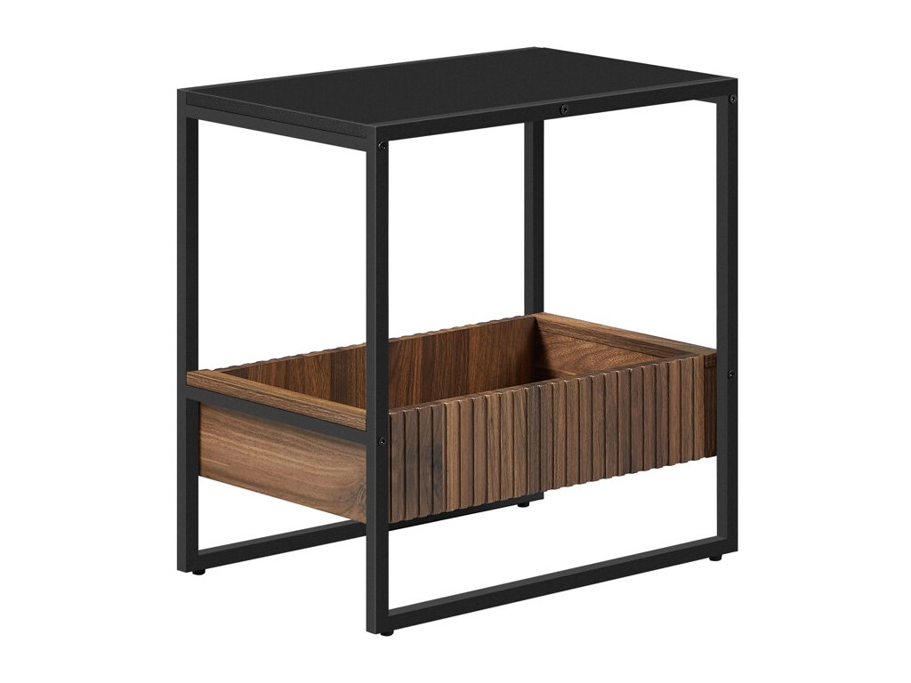 Odkladací stolík s rozmermi 55x35x56 cm kombinuje pevnú kovovú konštrukciu v čiernej matnej úprave s praktickou odkladacou plochou z MDF dosky v rovnakom odtieni. Súčasťou je úložný priestor s prírodnou drevenou zásuvkou v dekore orech, ktorá ponúka dostatok miesta na uloženie drobných predmetov. Rektifikačné nožičky umožňujú vyrovnanie stolíka na nerovnom povrchu, čím zabezpečujú stabilitu a bezpečné používanie. Minimalistický dizajn s kontrastom čiernej a prírodného dreva sa hodí do moderných aj industriálne ladených interiérov.