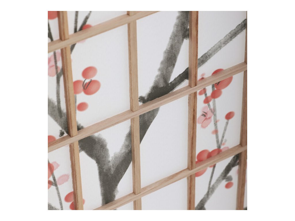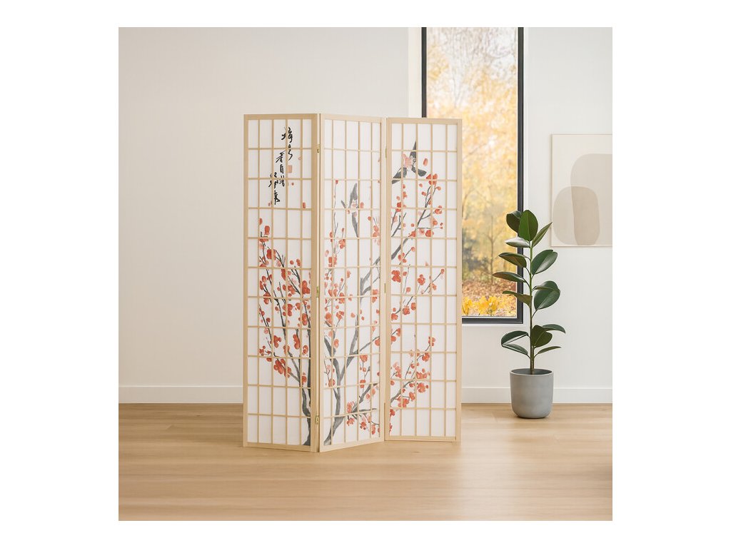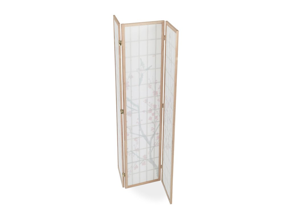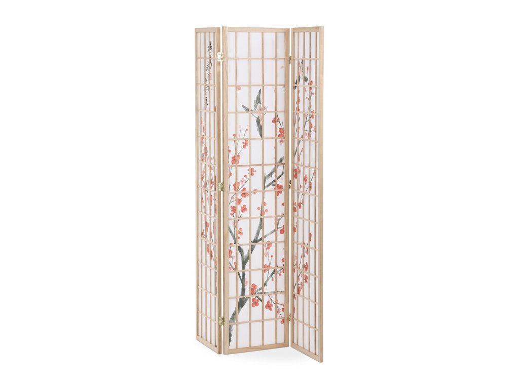 Trojdielny paraván z masívneho smrekového dreva v prírodnom odtieni ponúka ľahkú a vzdušnú priečku s bielou netkanou textíliou, ktorá je zdobená jemným motívom vetiev s kvetmi a vtákmi v čiernych a červených tónoch. Pevné drevené rámy zabezpečujú stabilitu a zároveň umožňujú jednoduché skladanie a presúvanie. Paraván je vhodný na optické oddelenie priestoru v interiéri, pričom jeho prírodná farebnosť a decentný dekor vytvárajú pokojné prostredie. Vďaka ľahkému materiálu sa ľahko udržiava a je ideálny na použitie v obývacích izbách, spálňach alebo kanceláriách.