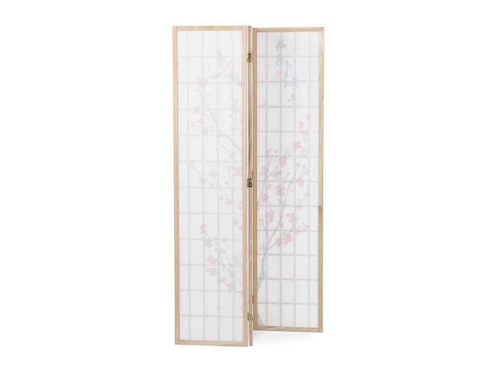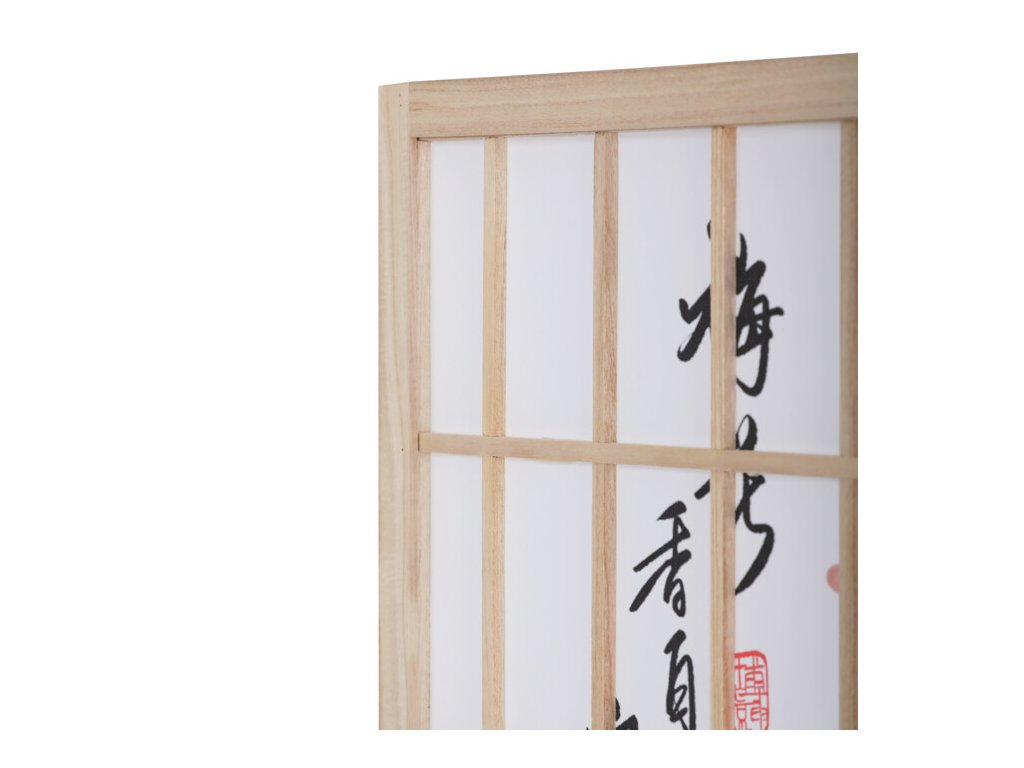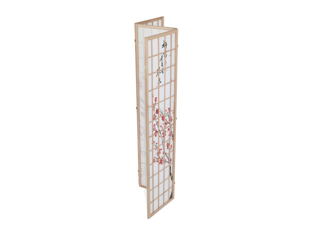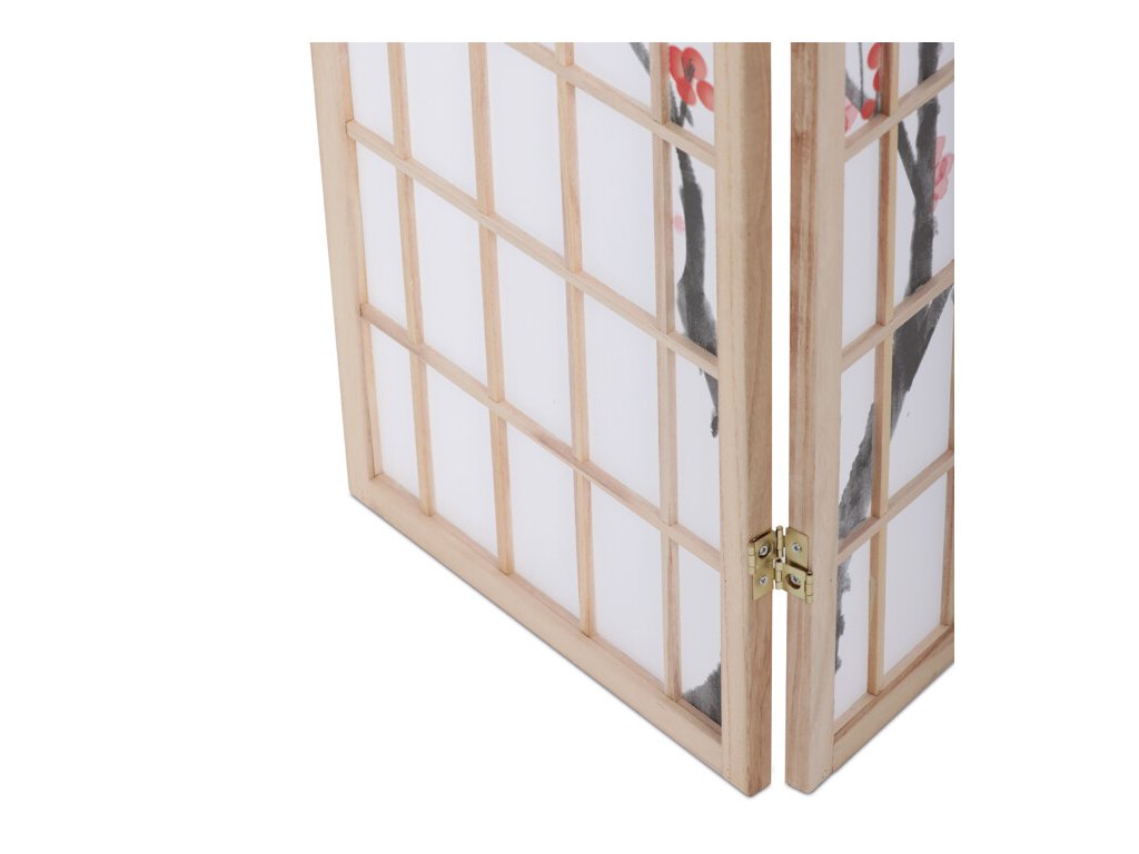 Trojdielny paraván z masívneho smrekového dreva v prírodnom odtieni ponúka ľahkú a vzdušnú priečku s bielou netkanou textíliou, ktorá je zdobená jemným motívom vetiev s kvetmi a vtákmi v čiernych a červených tónoch. Pevné drevené rámy zabezpečujú stabilitu a zároveň umožňujú jednoduché skladanie a presúvanie. Paraván je vhodný na optické oddelenie priestoru v interiéri, pričom jeho prírodná farebnosť a decentný dekor vytvárajú pokojné prostredie. Vďaka ľahkému materiálu sa ľahko udržiava a je ideálny na použitie v obývacích izbách, spálňach alebo kanceláriách.