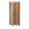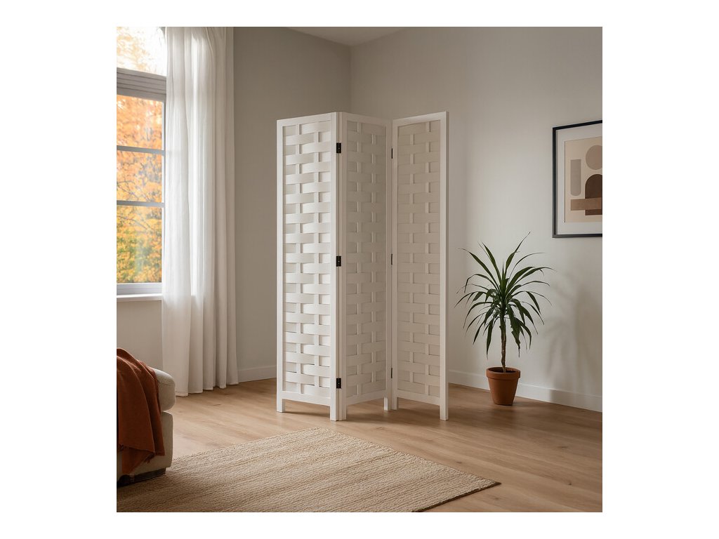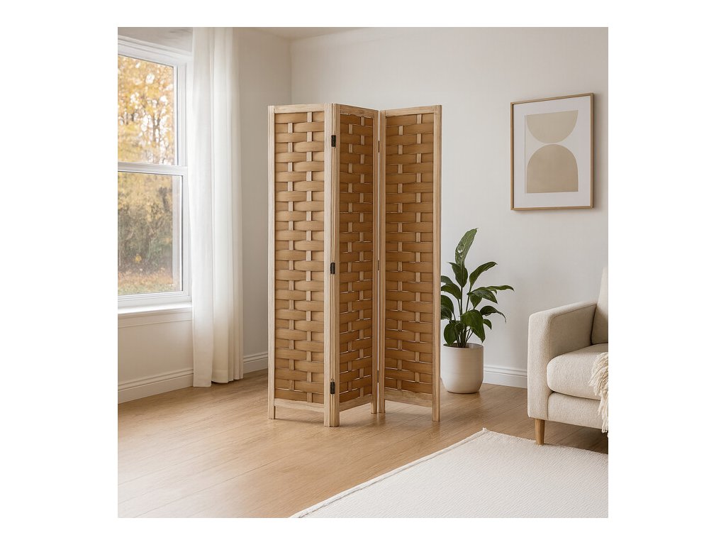 Trojdielny paraván vyrobený z masívneho smrekového dreva v prírodnom odtieni ponúka praktické riešenie na rozdelenie priestoru alebo vytvorenie súkromia. Jeho pevné rámy dopĺňajú prepletené PVC pásiky, ktoré vytvárajú zaujímavý vzor a zároveň prepúšťajú svetlo. Vďaka skladacej konštrukcii s kovovými pántmi je možné paraván ľahko premiestniť a prispôsobiť podľa potreby. Prírodná povrchová úprava zvýrazňuje textúru dreva a umožňuje jednoduchú údržbu. Rozmery jednotlivých dielov sú navrhnuté tak, aby paraván stabilne stál a zároveň bol dostatočne ľahký na manipuláciu. Rozmer jedného dielu 40x171cm.