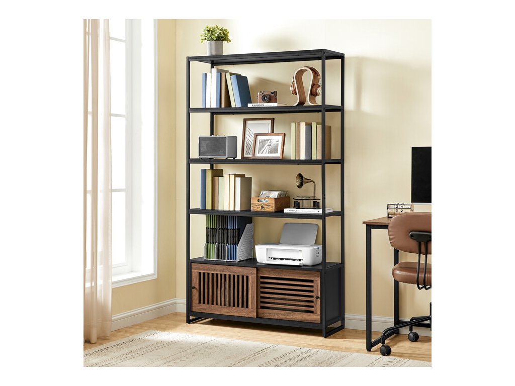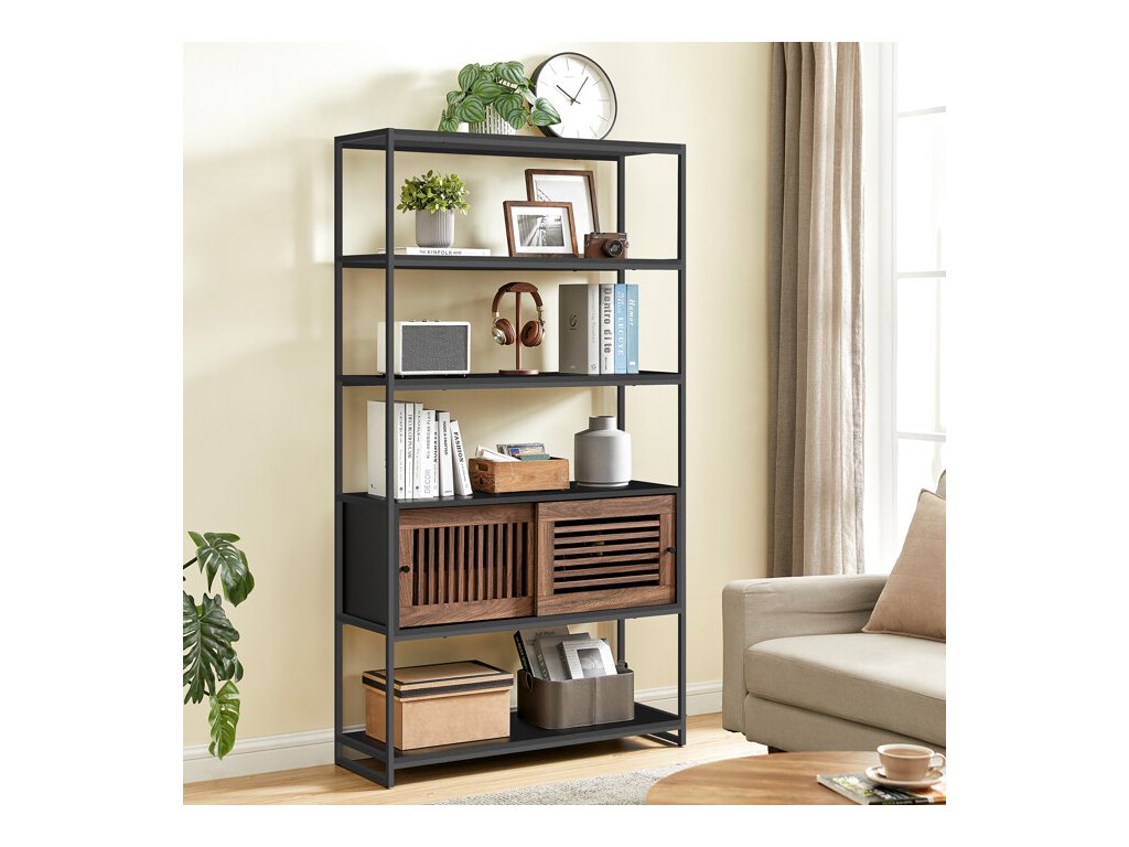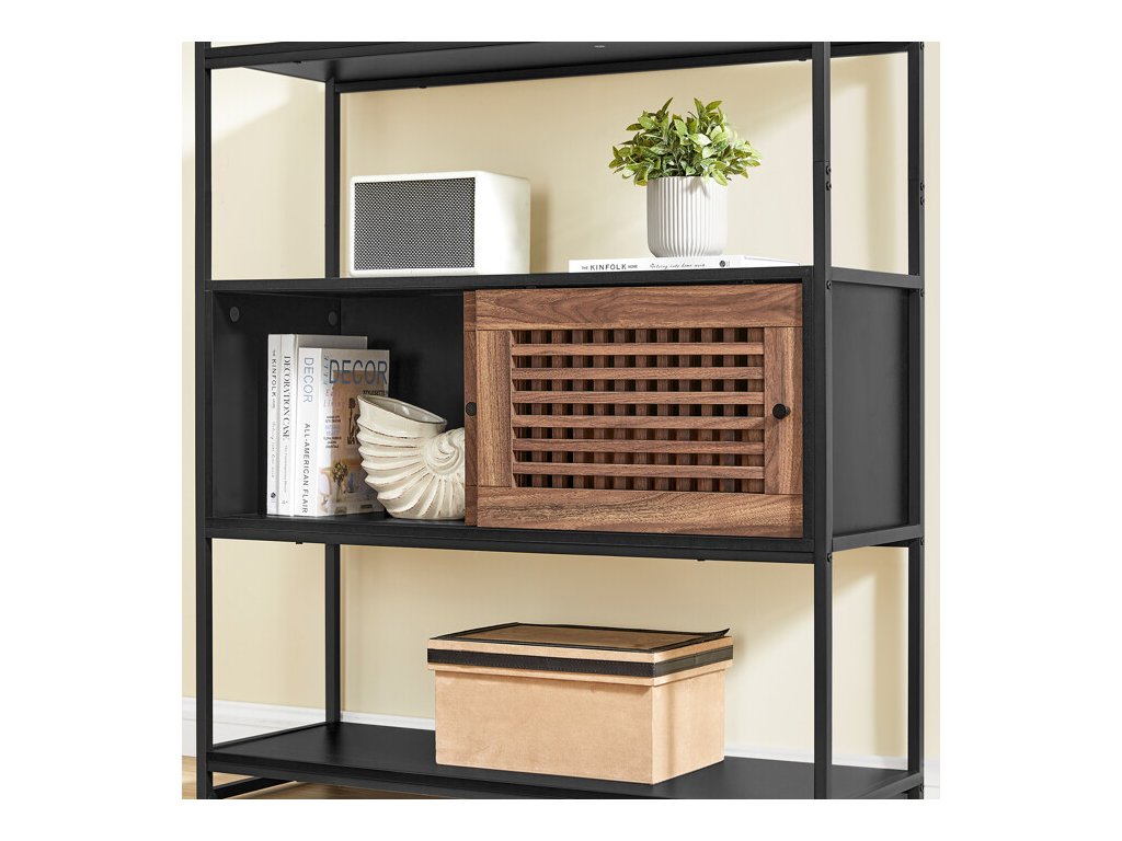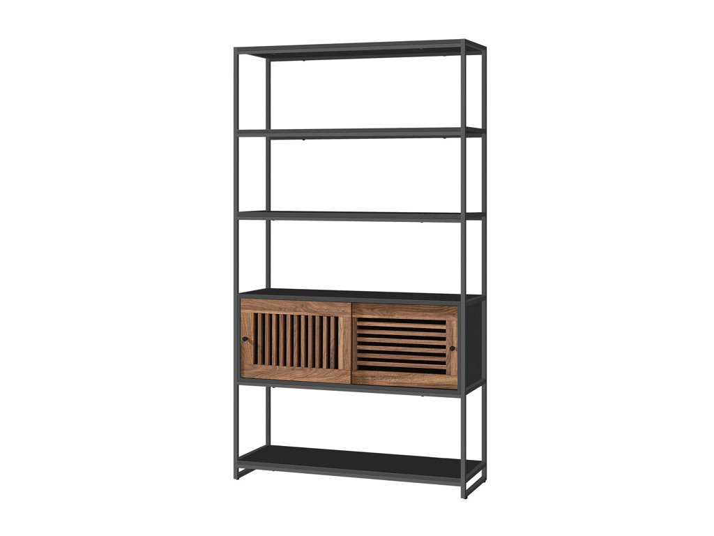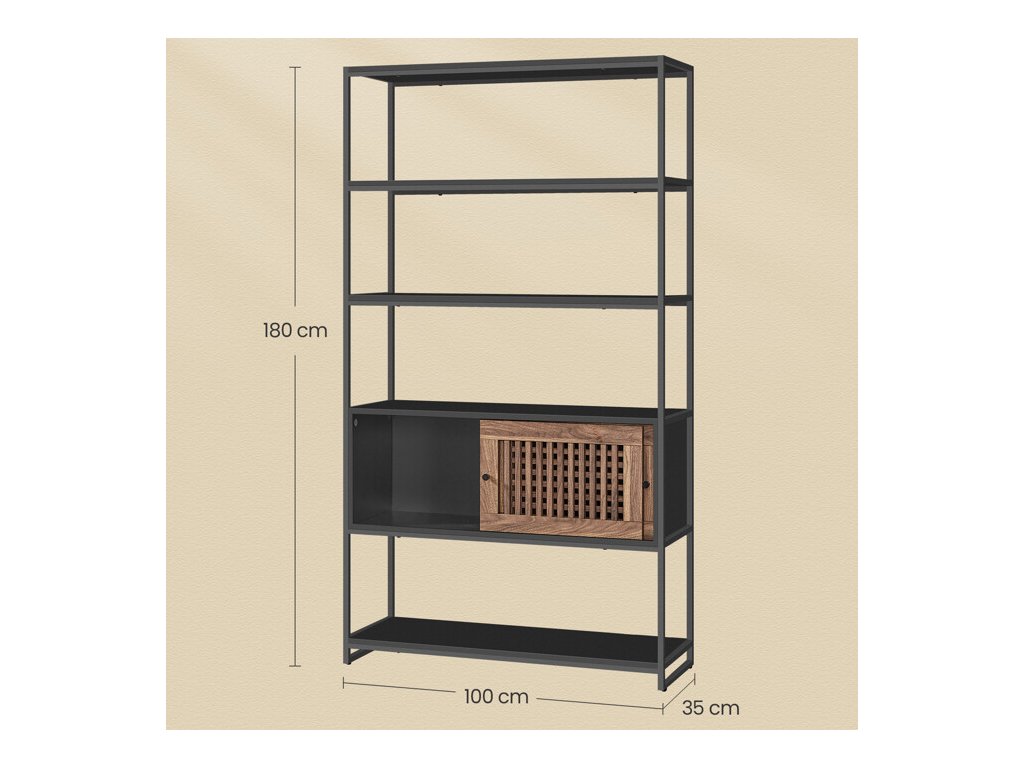 Regál s rozmermi 100x35x180 cm kombinuje pevný kovový rám v čiernej farbe s policami z MDF dosiek v odtieni Old wood, ktoré dodávajú nábytku prírodný vzhľad. Kovové nosné vzpery zabezpečujú stabilitu a dlhú životnosť celej konštrukcie. Štyri otvorené police ponúkajú dostatok priestoru na vystavenie dekorácií alebo uloženie kníh, zatiaľ čo spodná časť je vybavená uzatvárateľnou skrinkou s posuvnými dvierkami s dekoratívnym lamelovým vzorom. Dizajn regálu je moderný a zároveň funkčný, vhodný do obývacích izieb, pracovných priestorov aj komerčných interiérov.