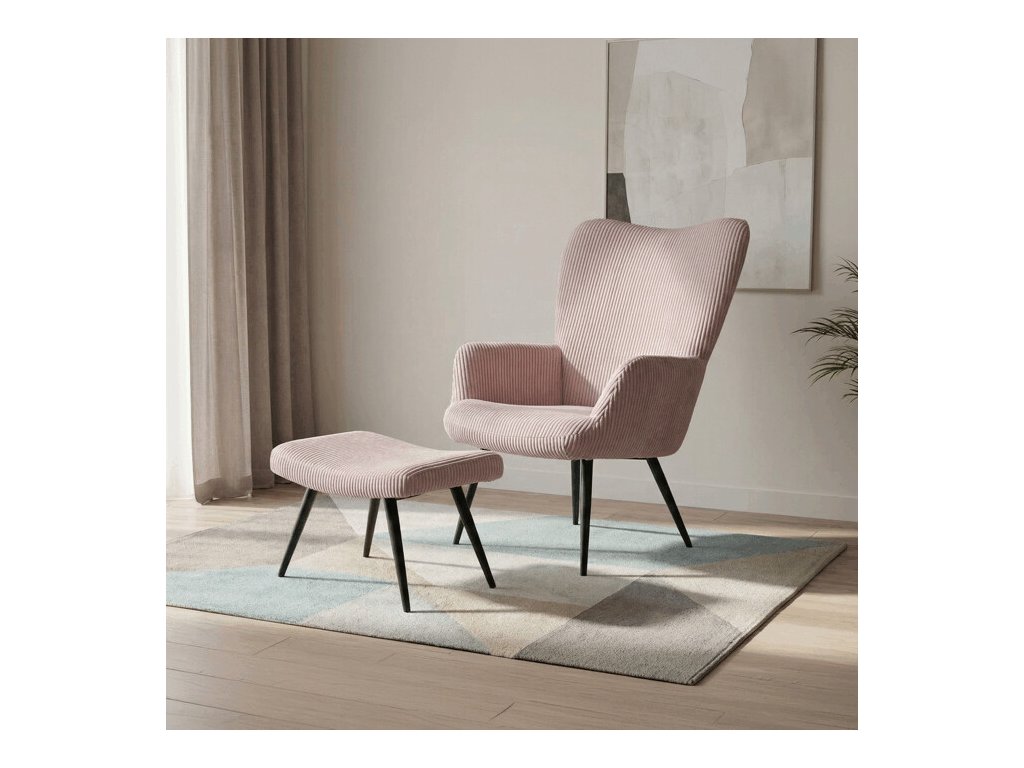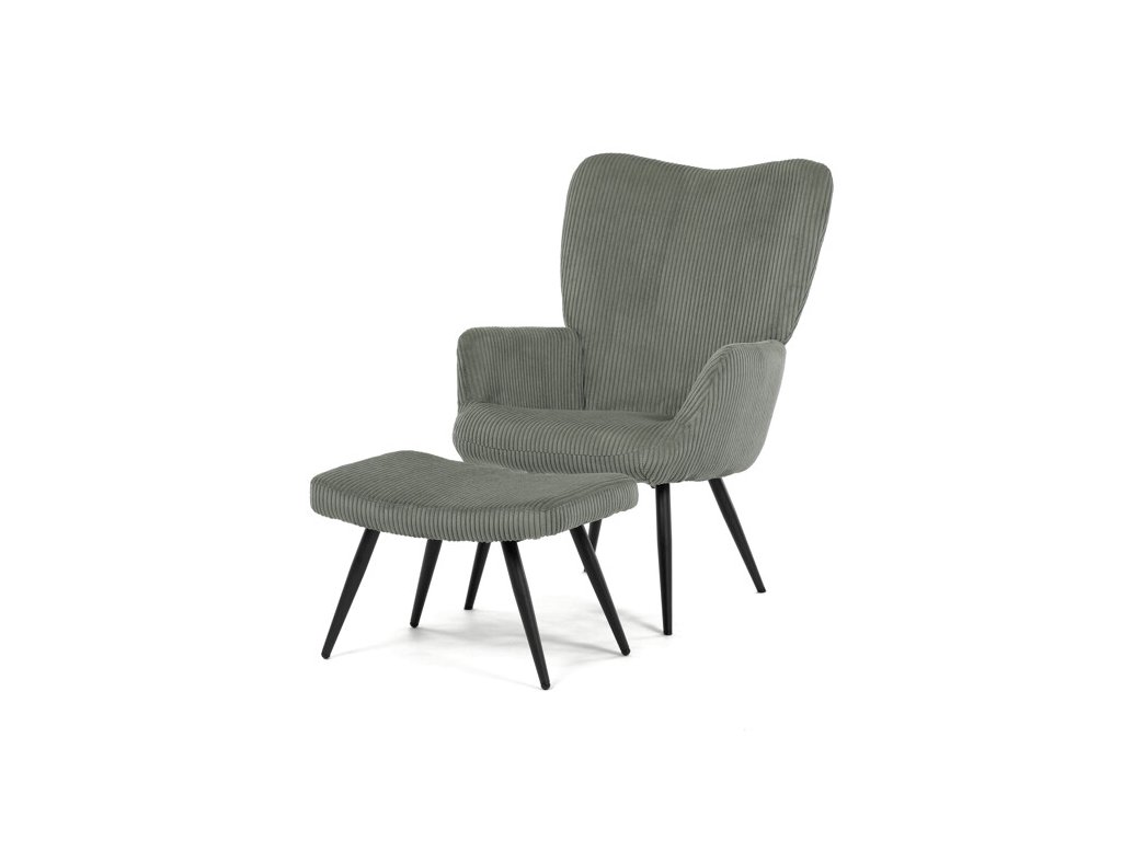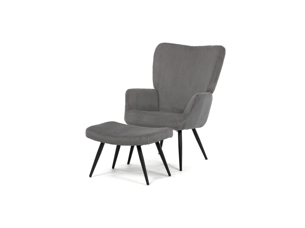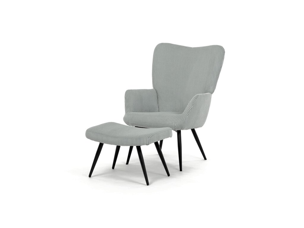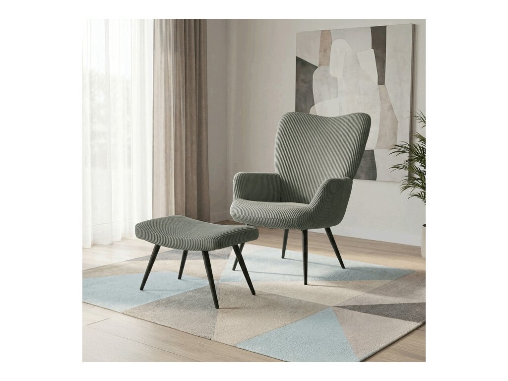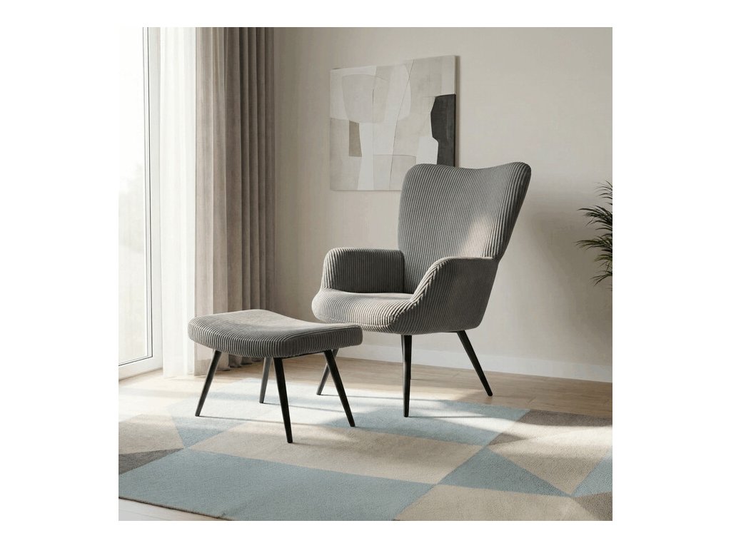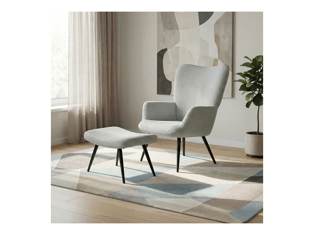 Relaxačné kreslo s podnožkou v modrom manšestru ponúka pohodlné sedenie vďaka mäkkému čalúneniu a ergonomicky tvarovaným podrúčkam. Pevné čierne kovové nohy zabezpečujú stabilitu a dlhú životnosť. Manšestrová látka dodáva kreslu príjemnú textúru a vizuálnu hĺbku, ktorá sa hodí do moderných aj klasických interiérov. Súčasťou je praktický taburet na pohodlné oprenie nôh, ktorý zdieľa rovnaký dizajn a materiál. Kreslo nie je otočné ani rozkladacie, čo podčiarkuje jeho jednoduchosť a funkčnosť.