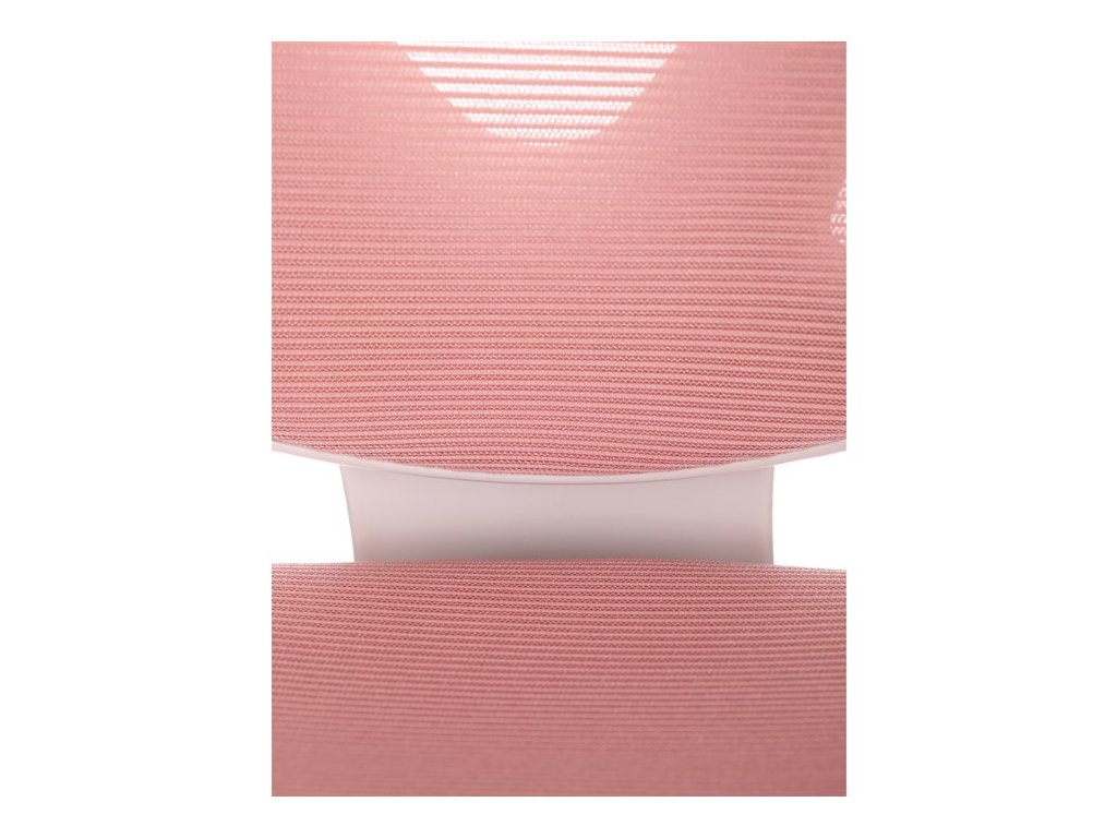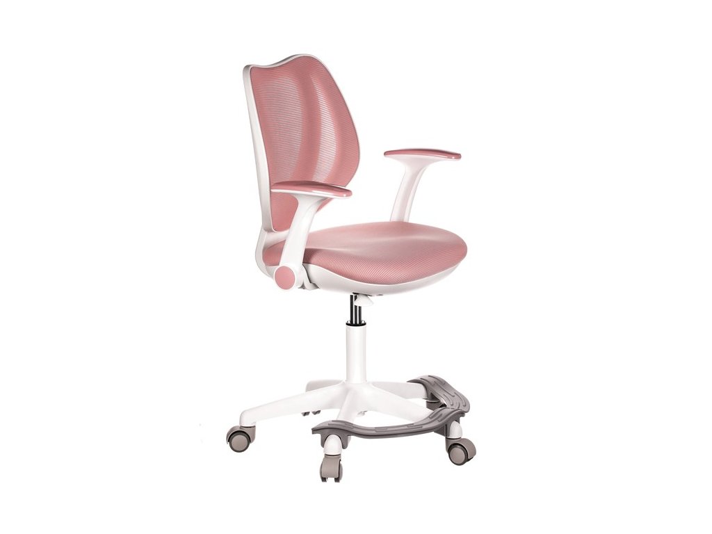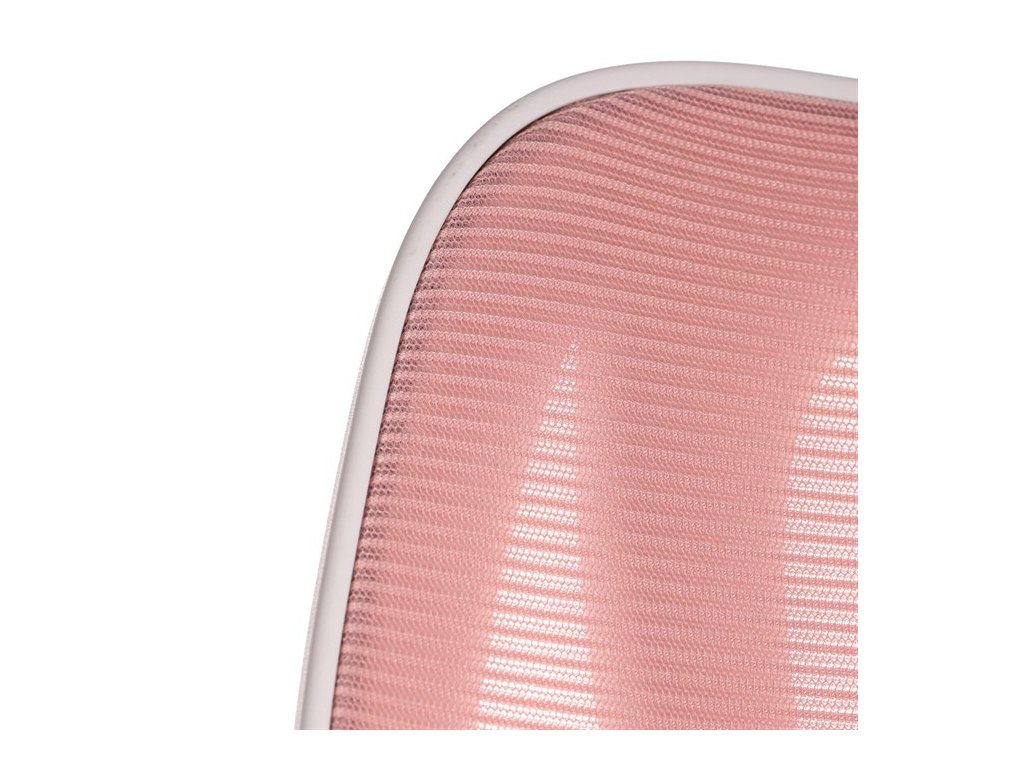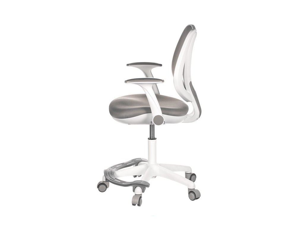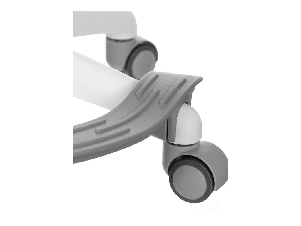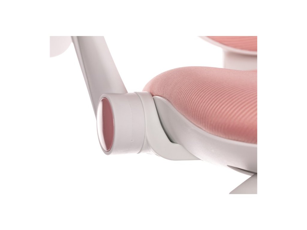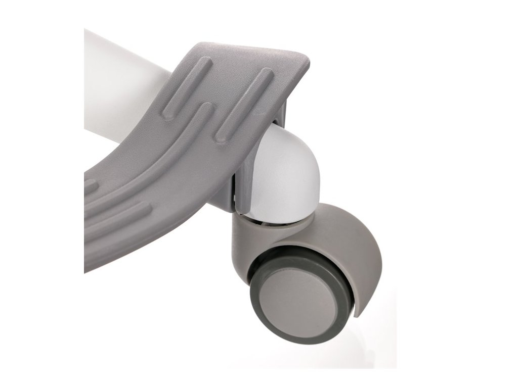 Detská stolička v príjemných pastelových farbách spolu s bielou kostrou ponúka jednoduchý a elegantný design. Stolička má pevné operadlo potiahnuté priedušným sieťovaným materiálom. Sedák v rovnakom poťahu poskytuje dostatok pohodlia vďaka svojmu zmäkčeniu. Pre pocit pohodlia slúžia pevné podrúčky, ktoré sú na svojej vrchnej časti opatrené lesklým plastovým povrchom vo farbe poťahového materiálu. Dôležitá je tiež integrovaná opora nôh, ktorá prispieva k pohodlnému sedeniu. Stolička je vybavená špeciálnymi funkčnými kolieskami, ktoré sa pri zaťažení automaticky zablokujú, čo zabraňuje nechceným pohybom stoličky.