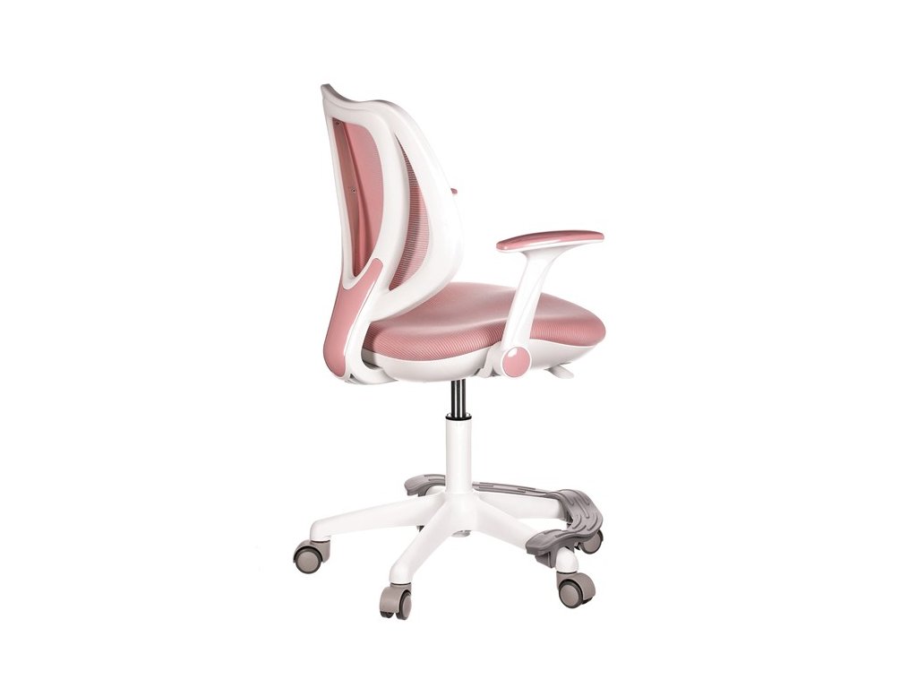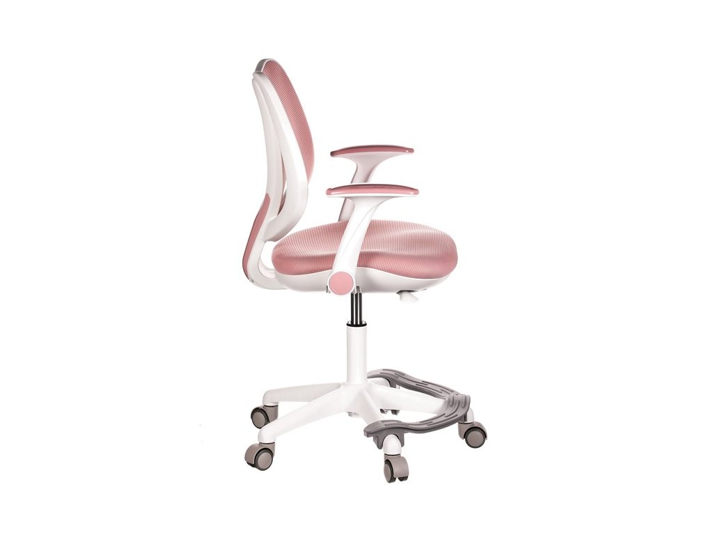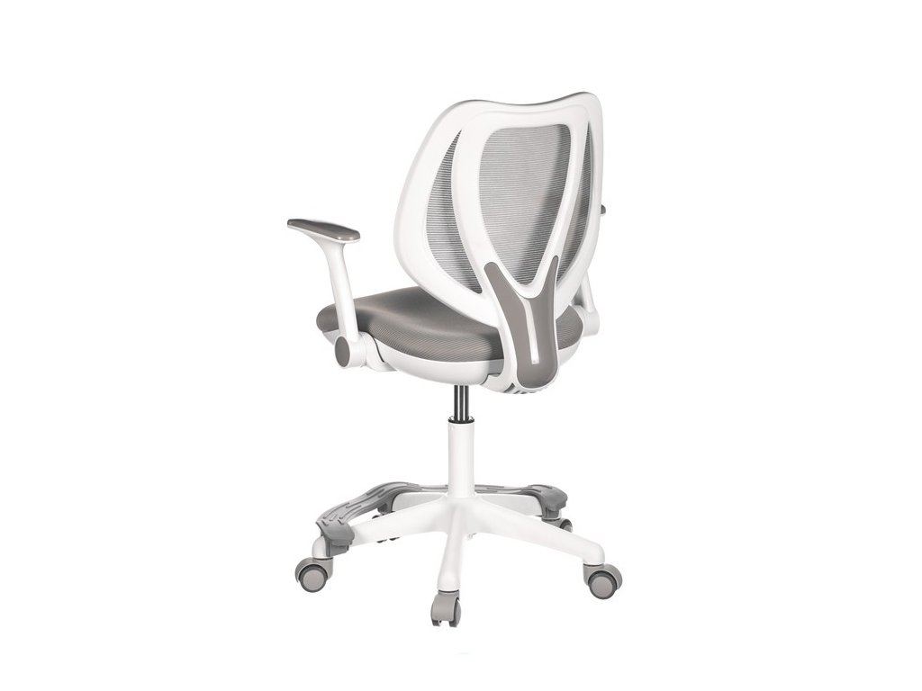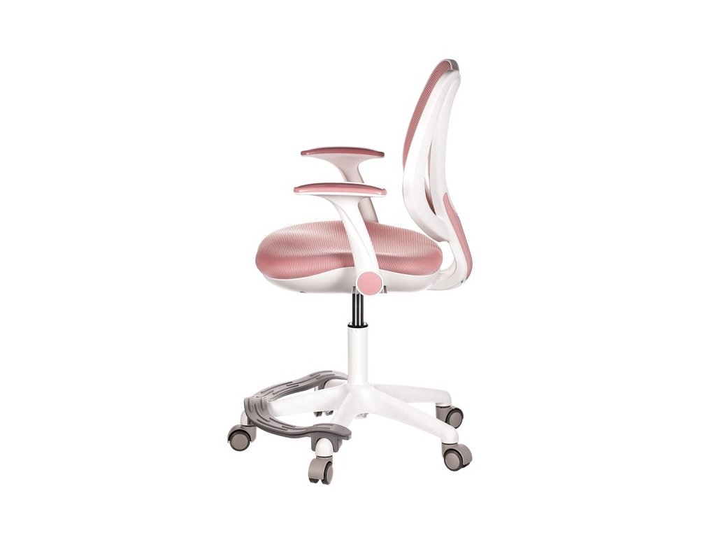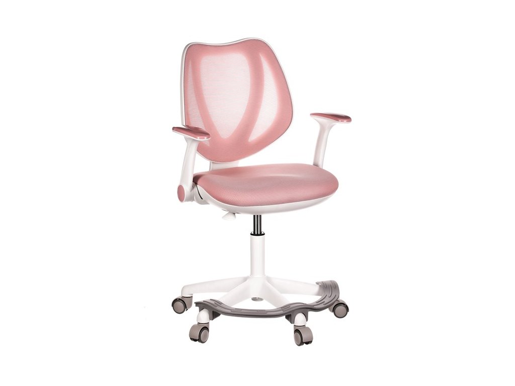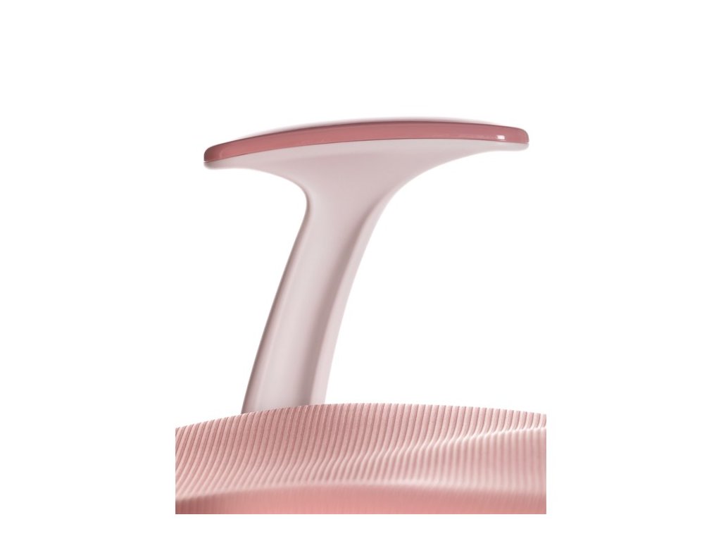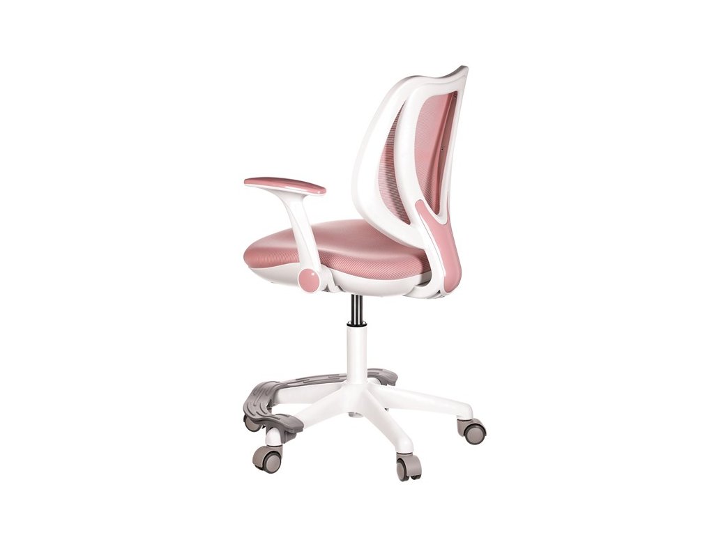 Detská stolička v príjemných pastelových farbách spolu s bielou kostrou ponúka jednoduchý a elegantný design. Stolička má pevné operadlo potiahnuté priedušným sieťovaným materiálom. Sedák v rovnakom poťahu poskytuje dostatok pohodlia vďaka svojmu zmäkčeniu. Pre pocit pohodlia slúžia pevné podrúčky, ktoré sú na svojej vrchnej časti opatrené lesklým plastovým povrchom vo farbe poťahového materiálu. Dôležitá je tiež integrovaná opora nôh, ktorá prispieva k pohodlnému sedeniu. Stolička je vybavená špeciálnymi funkčnými kolieskami, ktoré sa pri zaťažení automaticky zablokujú, čo zabraňuje nechceným pohybom stoličky.