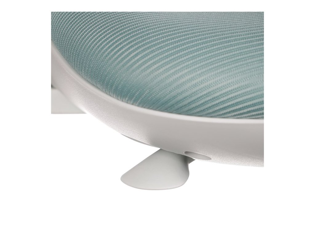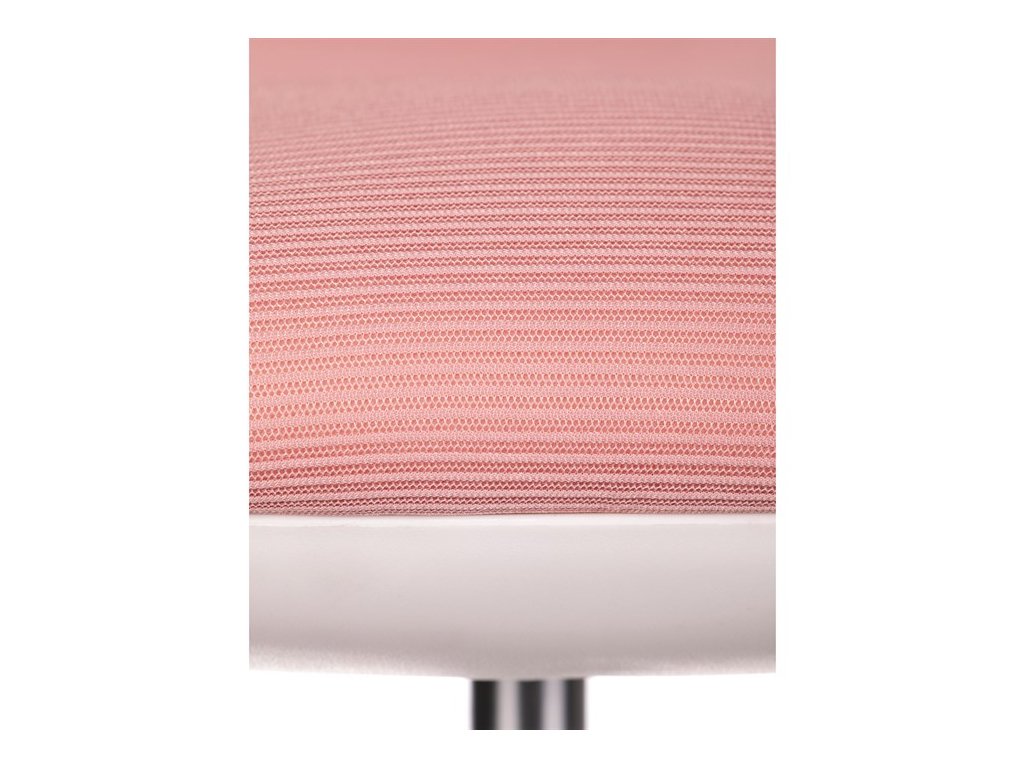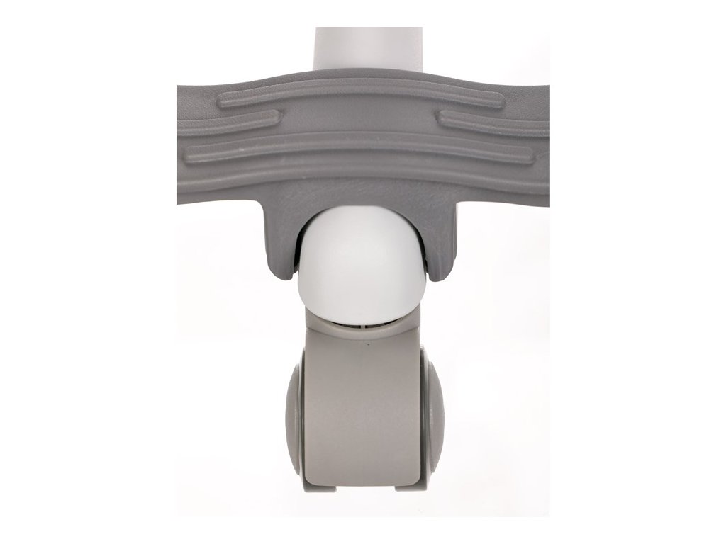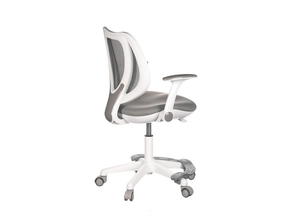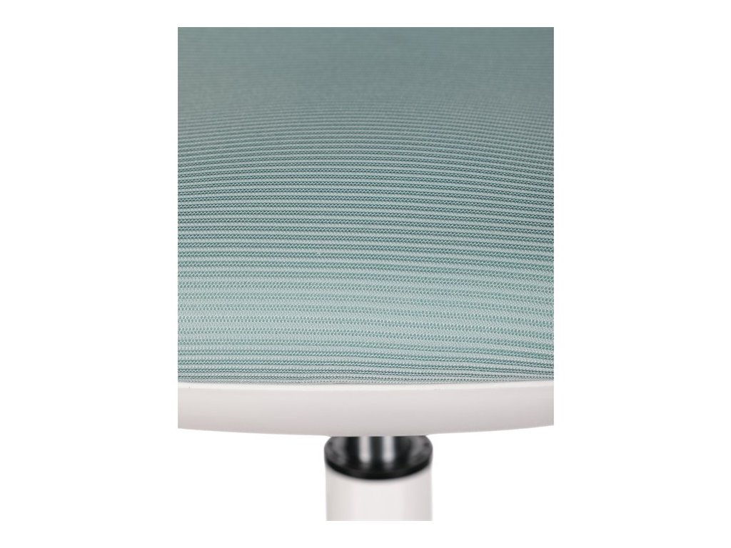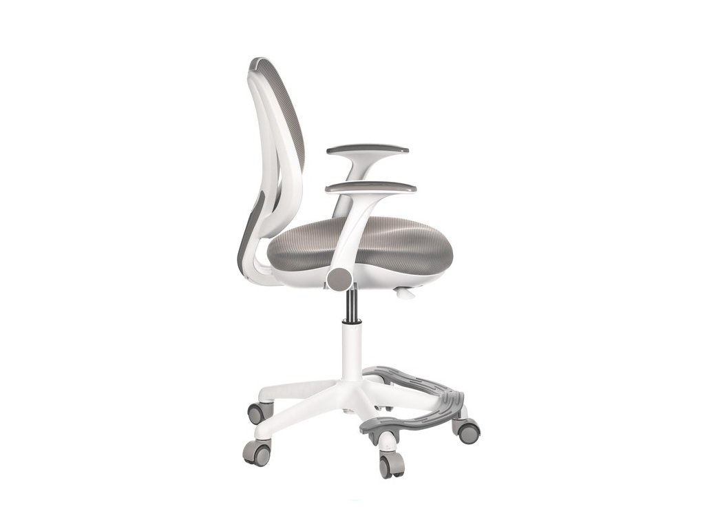 Detská stolička v príjemných pastelových farbách spolu s bielou kostrou ponúka jednoduchý a elegantný design. Stolička má pevné operadlo potiahnuté priedušným sieťovaným materiálom. Sedák v rovnakom poťahu poskytuje dostatok pohodlia vďaka svojmu zmäkčeniu. Pre pocit pohodlia slúžia pevné podrúčky, ktoré sú na svojej vrchnej časti opatrené lesklým plastovým povrchom vo farbe poťahového materiálu. Dôležitá je tiež integrovaná opora nôh, ktorá prispieva k pohodlnému sedeniu. Stolička je vybavená špeciálnymi funkčnými kolieskami, ktoré sa pri zaťažení automaticky zablokujú, čo zabraňuje nechceným pohybom stoličky.