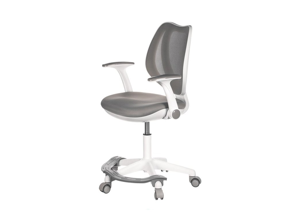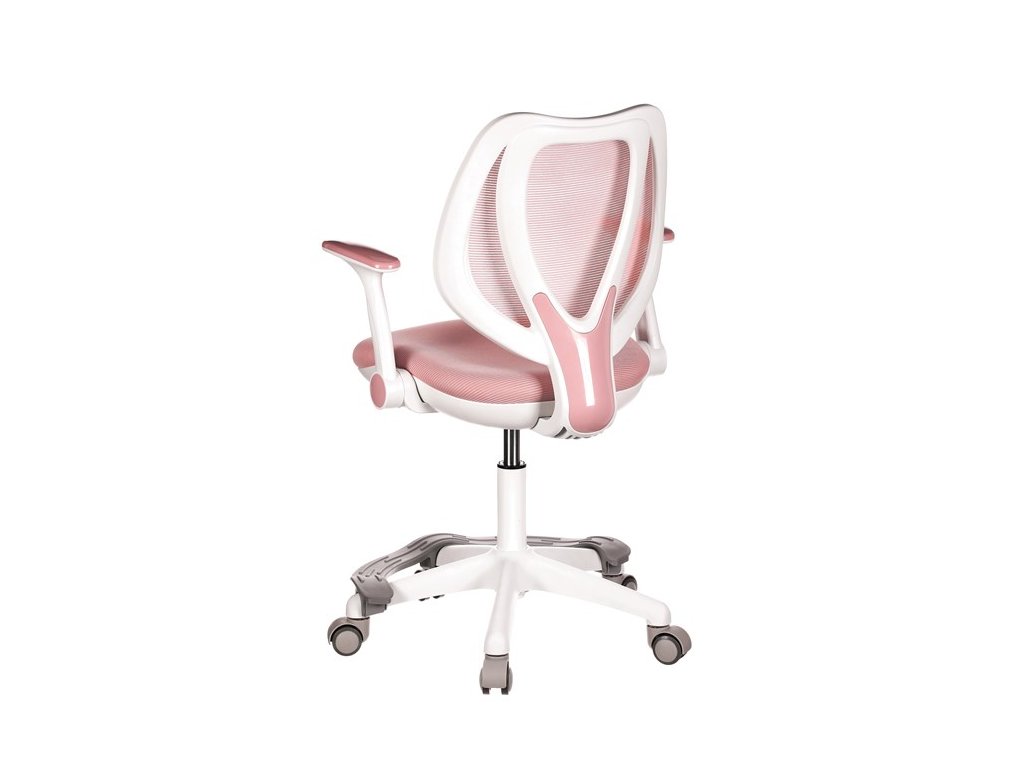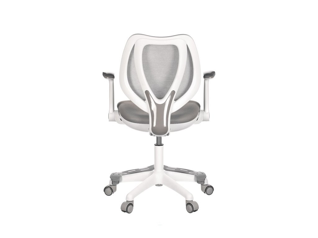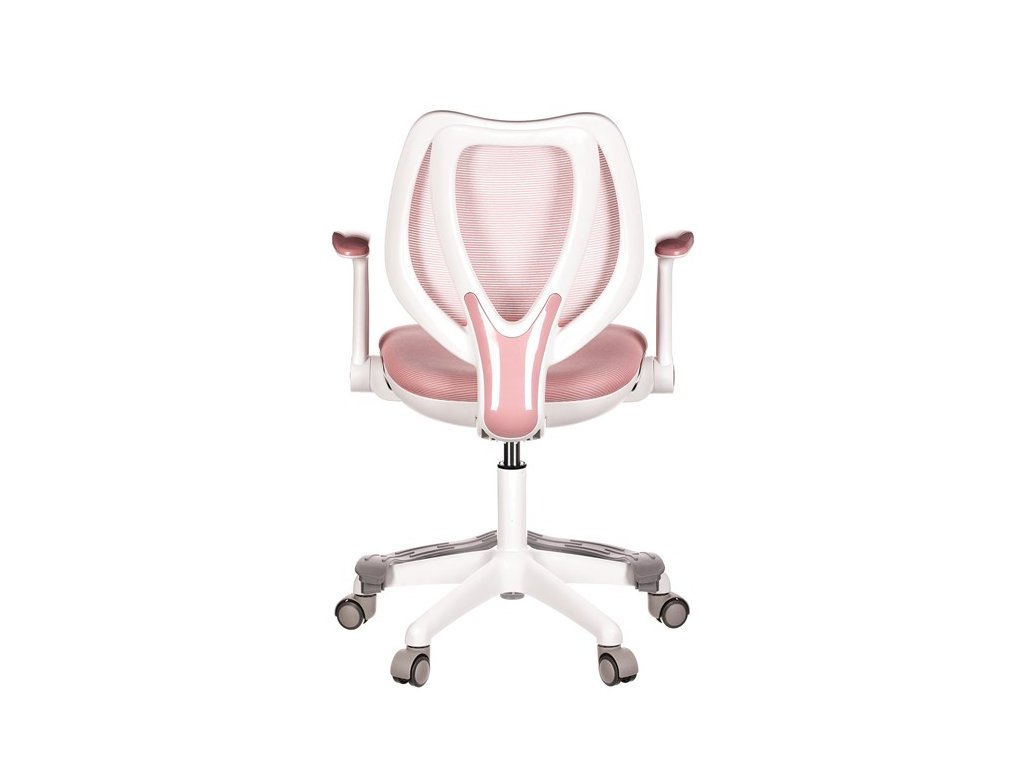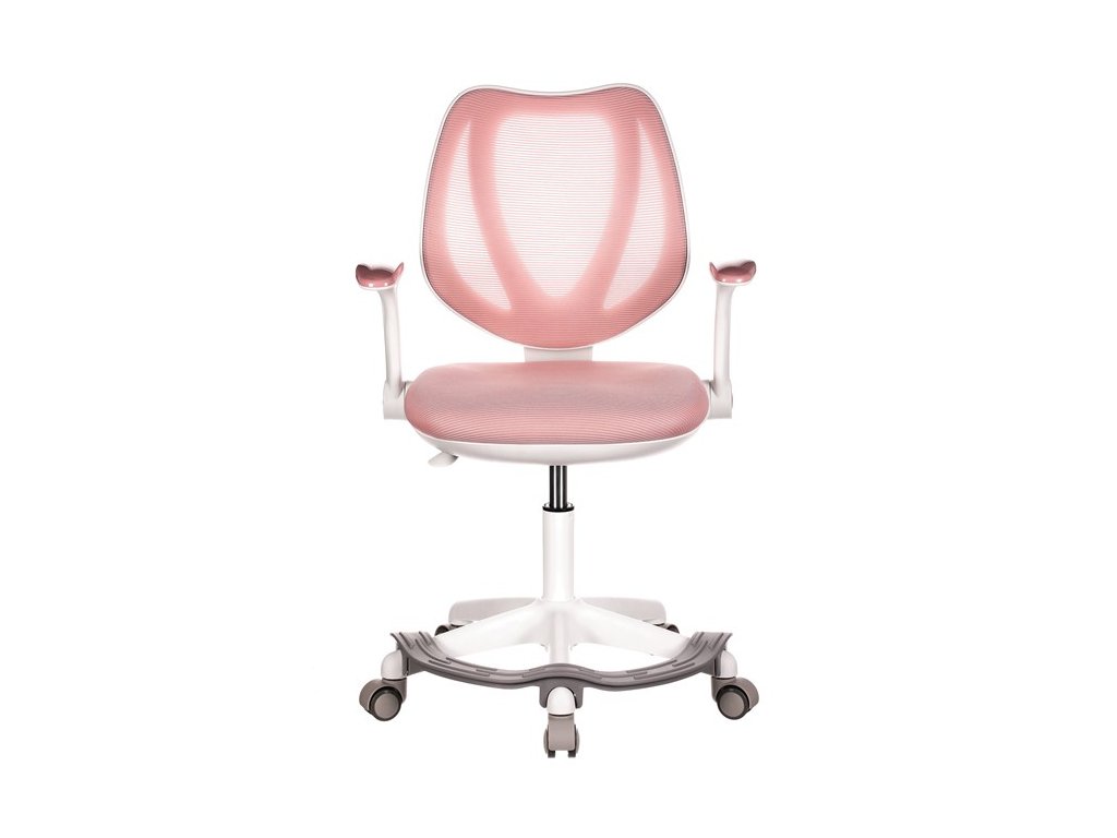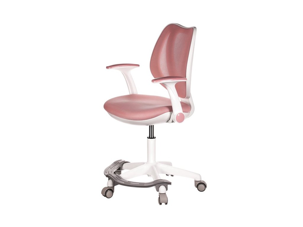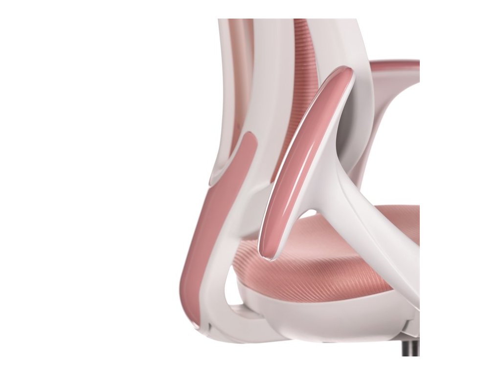 Detská stolička v príjemných pastelových farbách spolu s bielou kostrou ponúka jednoduchý a elegantný design. Stolička má pevné operadlo potiahnuté priedušným sieťovaným materiálom. Sedák v rovnakom poťahu poskytuje dostatok pohodlia vďaka svojmu zmäkčeniu. Pre pocit pohodlia slúžia pevné podrúčky, ktoré sú na svojej vrchnej časti opatrené lesklým plastovým povrchom vo farbe poťahového materiálu. Dôležitá je tiež integrovaná opora nôh, ktorá prispieva k pohodlnému sedeniu. Stolička je vybavená špeciálnymi funkčnými kolieskami, ktoré sa pri zaťažení automaticky zablokujú, čo zabraňuje nechceným pohybom stoličky.
