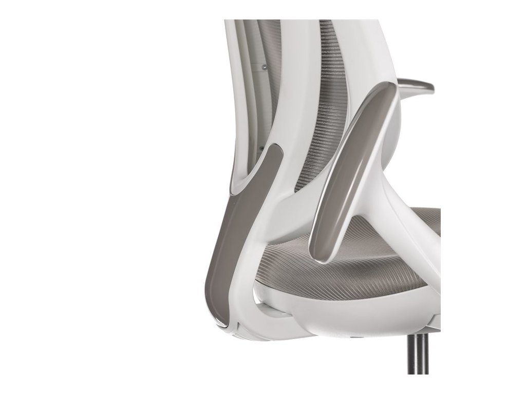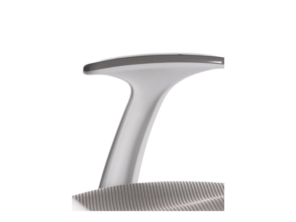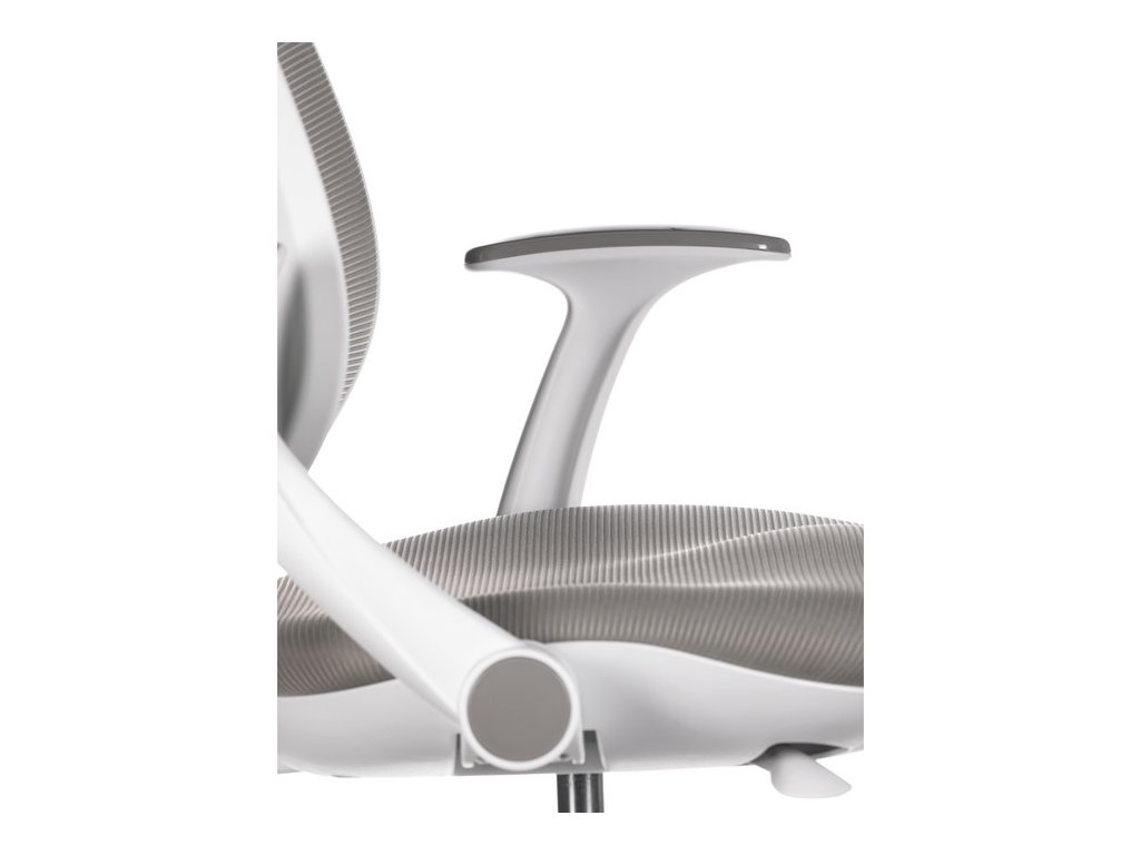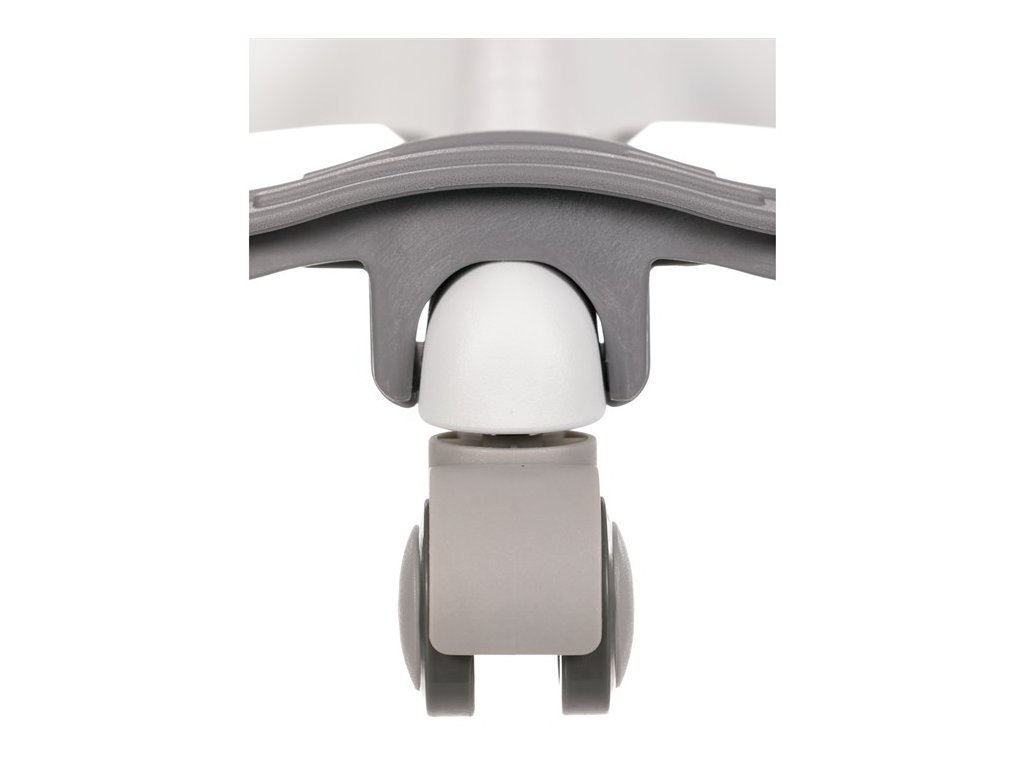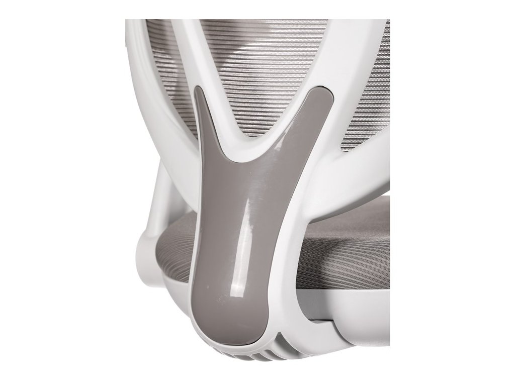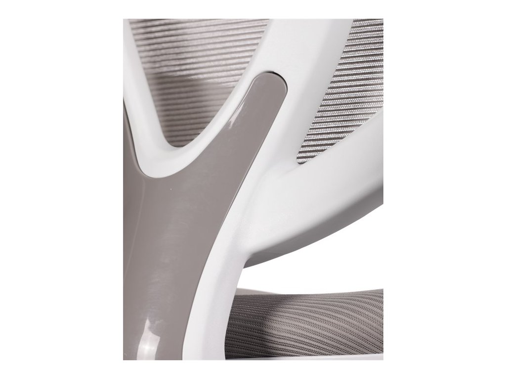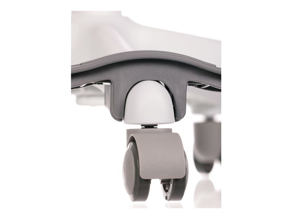 Detská stolička v príjemných pastelových farbách spolu s bielou kostrou ponúka jednoduchý a elegantný design. Stolička má pevné operadlo potiahnuté priedušným sieťovaným materiálom. Sedák v rovnakom poťahu poskytuje dostatok pohodlia vďaka svojmu zmäkčeniu. Pre pocit pohodlia slúžia pevné podrúčky, ktoré sú na svojej vrchnej časti opatrené lesklým plastovým povrchom vo farbe poťahového materiálu. Dôležitá je tiež integrovaná opora nôh, ktorá prispieva k pohodlnému sedeniu. Stolička je vybavená špeciálnymi funkčnými kolieskami, ktoré sa pri zaťažení automaticky zablokujú, čo zabraňuje nechceným pohybom stoličky.