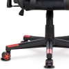 Herné kreslo E-racer v čiernej farbe kombinuje zamatovú látku s ekokožou, čo zabezpečuje príjemný dotyk a jednoduchú údržbu. Pevná plastová podnož je vybavená piatimi kolieskami pre ľahkú mobilitu a stabilitu. Kreslo disponuje hojdacím mechanizmom umožňujúcim nastavenie operadla až do polohy 180°, čo prispieva k maximálnemu pohodliu počas dlhých herných sedení. Výškovo nastaviteľné sedadlo a jednosmerné 1D podrúčky umožňujú prispôsobenie podľa individuálnych potrieb používateľa. Celkový dizajn s výrazným červeným prešitím a ergonomickým tvarom operadla podporuje správne držanie tela a komfort pri práci aj hraní.