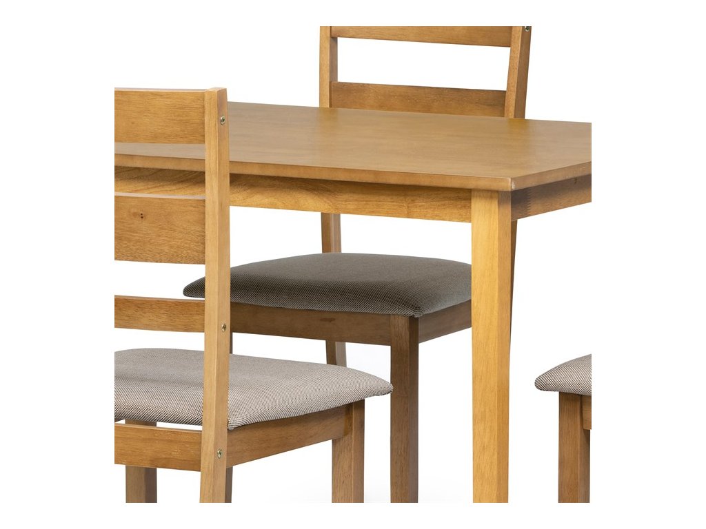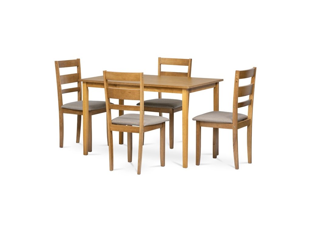 Jedálenský set 1+4 v dekore dub kombinuje pevnosť masívnych nôh s hladkým povrchom dosky z MDF s dyhou, čo zabezpečuje stabilitu aj elegantný vzhľad. Stôl s rozmermi 120x75x75 cm ponúka dostatok priestoru pre pohodlné stolovanie štyroch osôb, pričom masívne nohy dodávajú celku robustnú oporu. Stoličky sú taktiež vyrobené z masívu a doplnené čalúnenými sedákmi v neutrálnej látke, ktorá prispieva k pohodliu pri sedení. Prírodná farebnosť a jednoduchý dizajn ladia s rustikálnym aj moderným interiérom, zatiaľ čo kvalitné spracovanie materiálov je navrhnuté pre dlhú životnosť. Jedálenský set neobsahuje rozkladací mechanizmus, čo podčiarkuje jeho kompaktný a funkčný charakter.