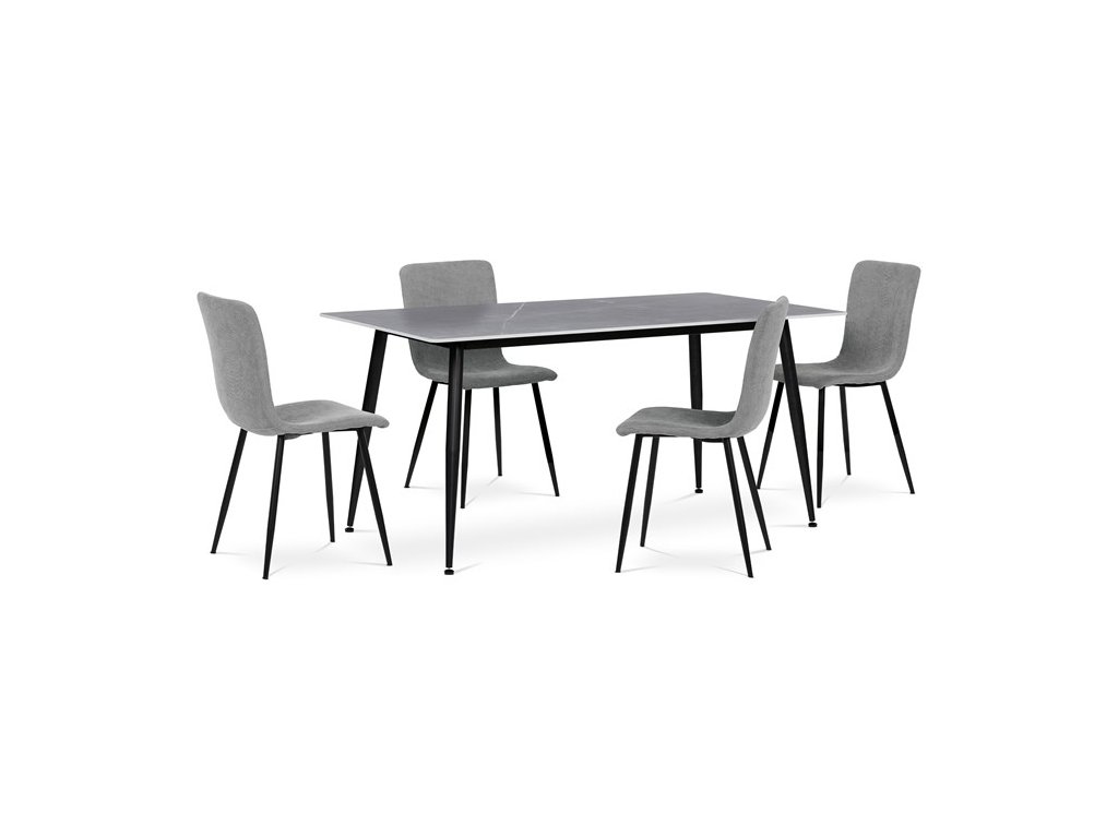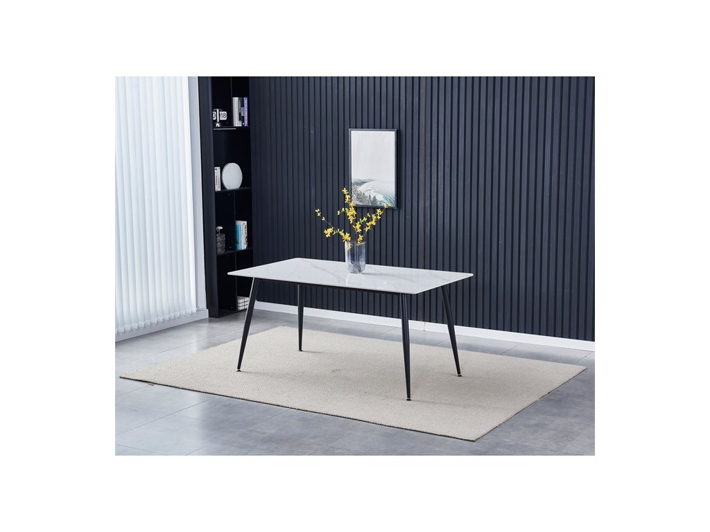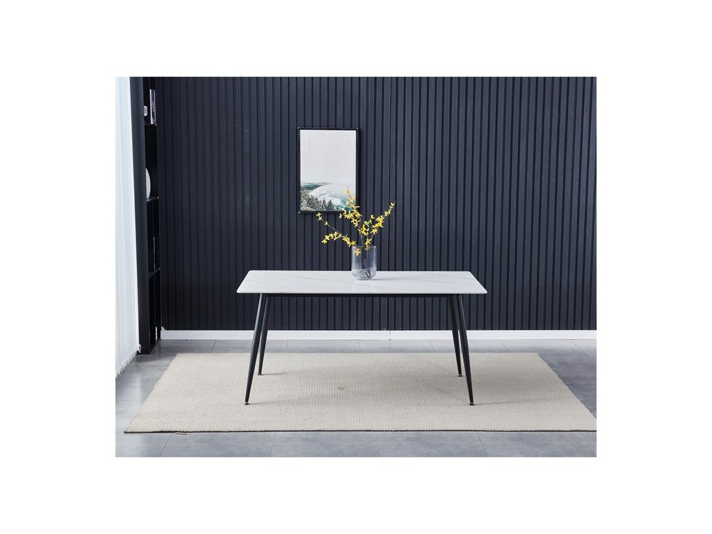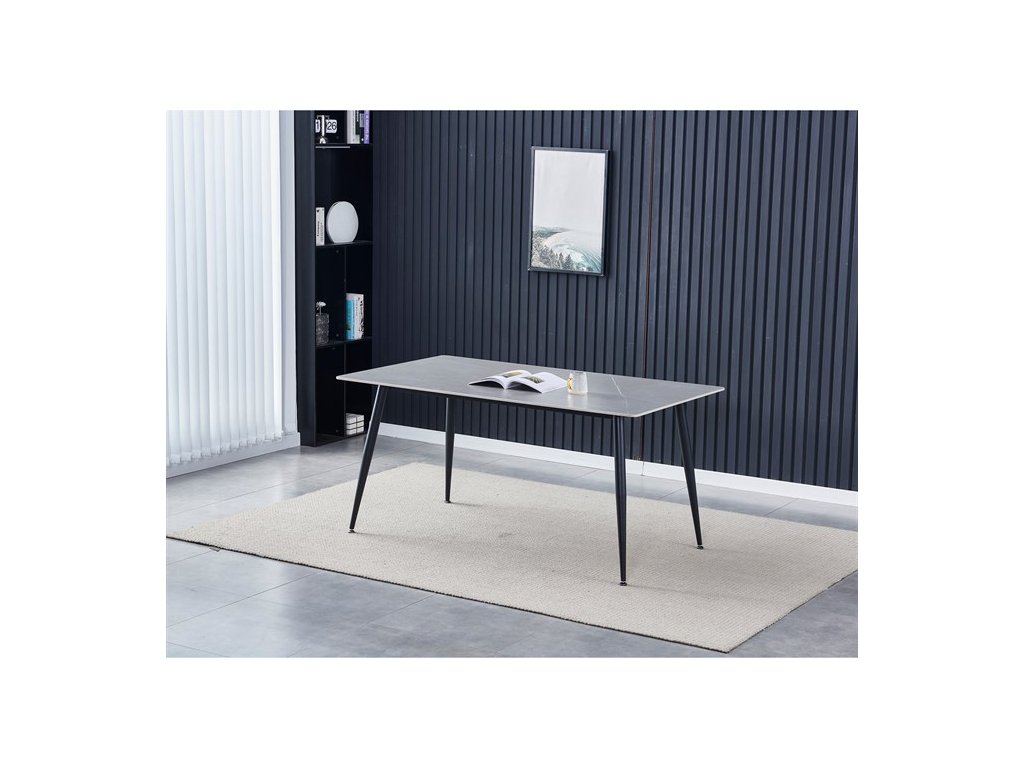 Jedálenský stôl s rozmermi 160x90x76 cm spája moderný dizajn s praktickými vlastnosťami. Doska je vyrobená zo slinutej keramiky v imitácii matného mramoru, ktorá ponúka pevný a odolný povrch ľahko udržiavateľný v čistote. Čierne kovové nohy sú tvarované do mierne zúžených stĺpikov, ktoré zabezpečujú stabilitu a pevnosť celej konštrukcie. Matná povrchová úprava dosky podčiarkuje elegantný vzhľad a zároveň minimalizuje odlesky. Stôl je vhodný na každodenné použitie v jedálňach aj moderne zariadených interiéroch.