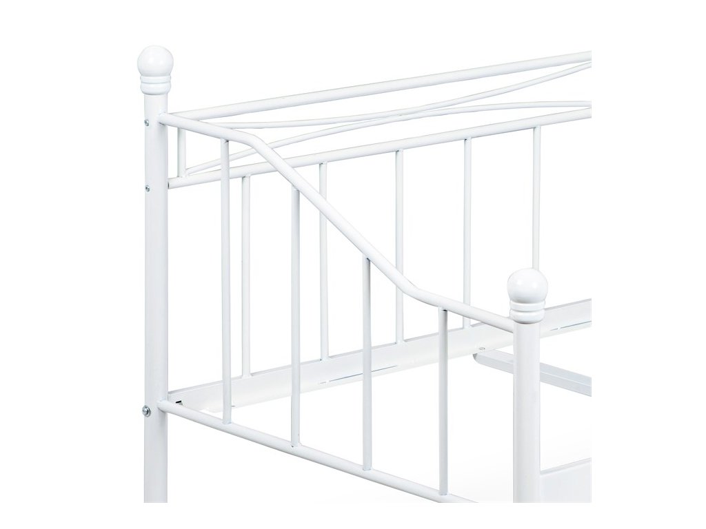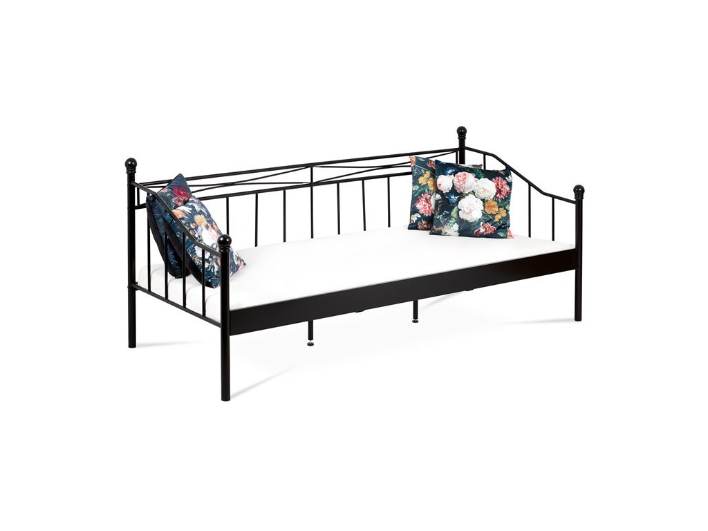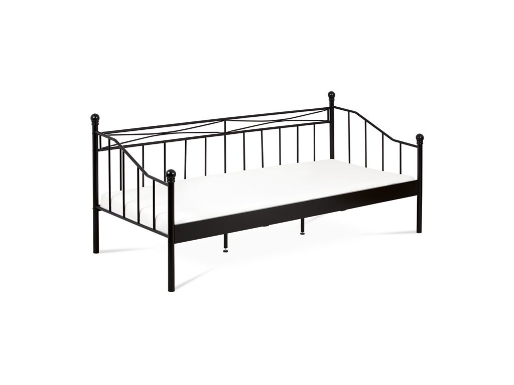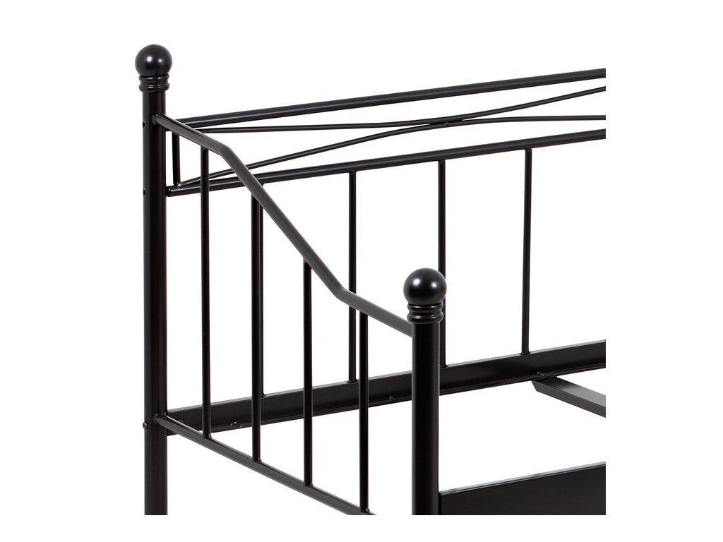 Jednolôžková posteľ s rozmermi 90x200 cm je vyrobená z pevného kovu s matnou čiernou povrchovou úpravou, ktorá zabezpečuje odolnosť proti poškriabaniu a jednoduchú údržbu. Dizajn rámu kombinuje jednoduché rovné aj mierne zakrivené línie s decentnými ozdobnými prvkami na čelách, čo dodáva posteli nadčasový vzhľad vhodný do rôznych interiérov. Konštrukcia je doplnená o strednú podpornú nohu pre zvýšenie stability a rovnomerné rozloženie váhy matraca. Posteľ je určená pre matrace s rozmerom 90x200 cm a jej pevná kovová základňa je navrhnutá pre dlhú životnosť a spoľahlivosť. Vďaka svojmu minimalistickému štýlu a kvalitnému spracovaniu predstavuje praktickú voľbu pre spálne, študentské izby či hosťovské miestnosti.