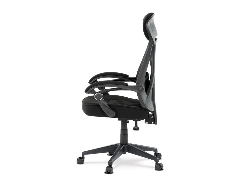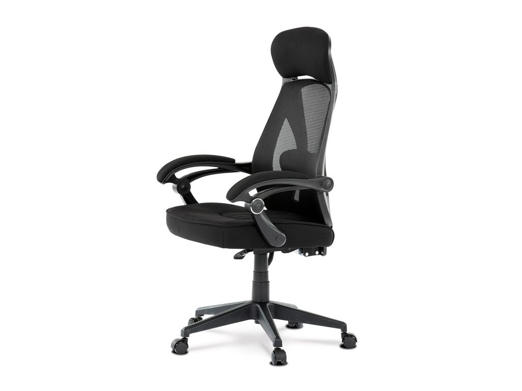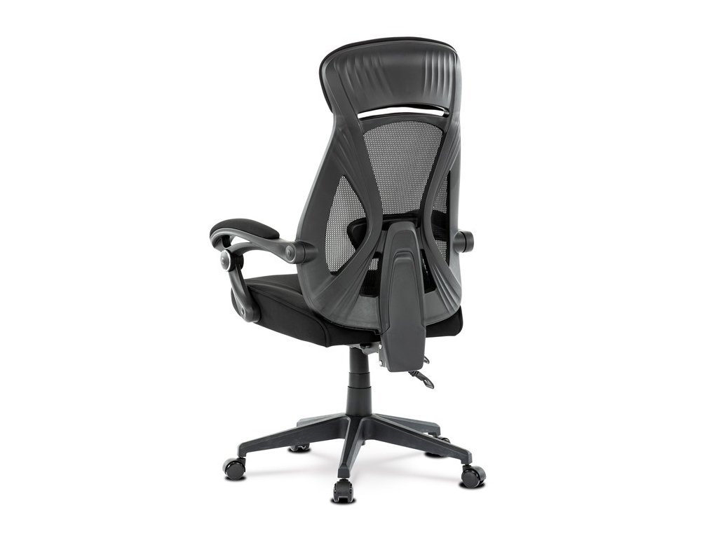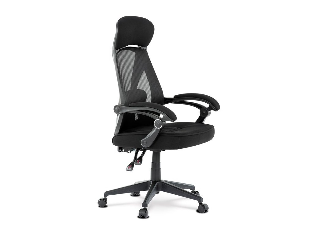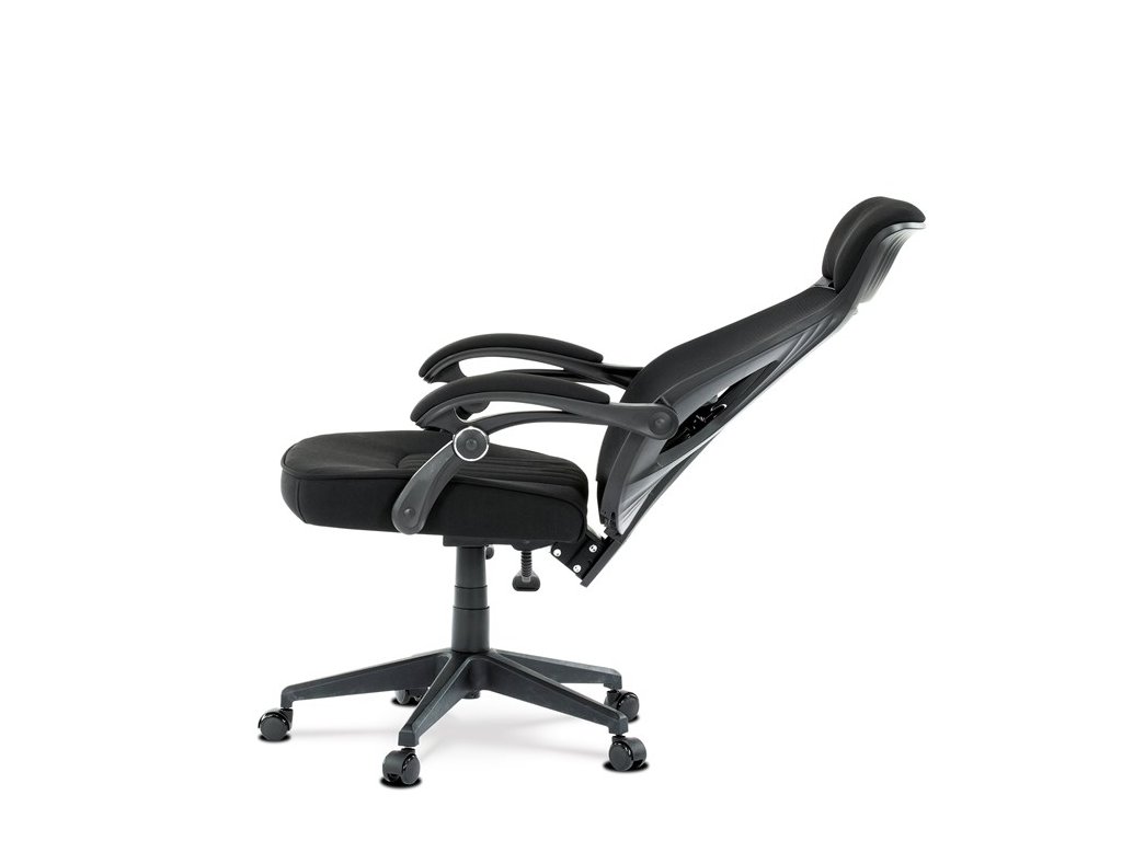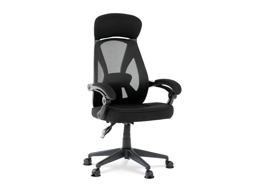 Kancelárska stolička KA-Y309 BK kombinuje čiernu látku a priedušnú čiernu sieťovinu MESH, ktorá zabezpečuje optimálnu ventiláciu počas sedenia. Pevné čalúnené podrúčky dopĺňajú ergonomicky tvarovaný sedák s extra veľkosťou pre pohodlné sedenie aj dlhšiu dobu. Hojdací mechanizmus s možnosťou aretácie umožňuje nastavenie polohy operadla podľa individuálnych potrieb, zatiaľ čo posuvná bedrová opierka vertikálne podporuje správne držanie tela. Plastový kríž s piatimi ramenami je vybavený kolieskami pre ľahký pohyb po kancelárskom priestore. Výškovo nastaviteľná stolička je vhodná pre široké spektrum používateľov, ktorí ocenia kombináciu funkčnosti a komfortu.