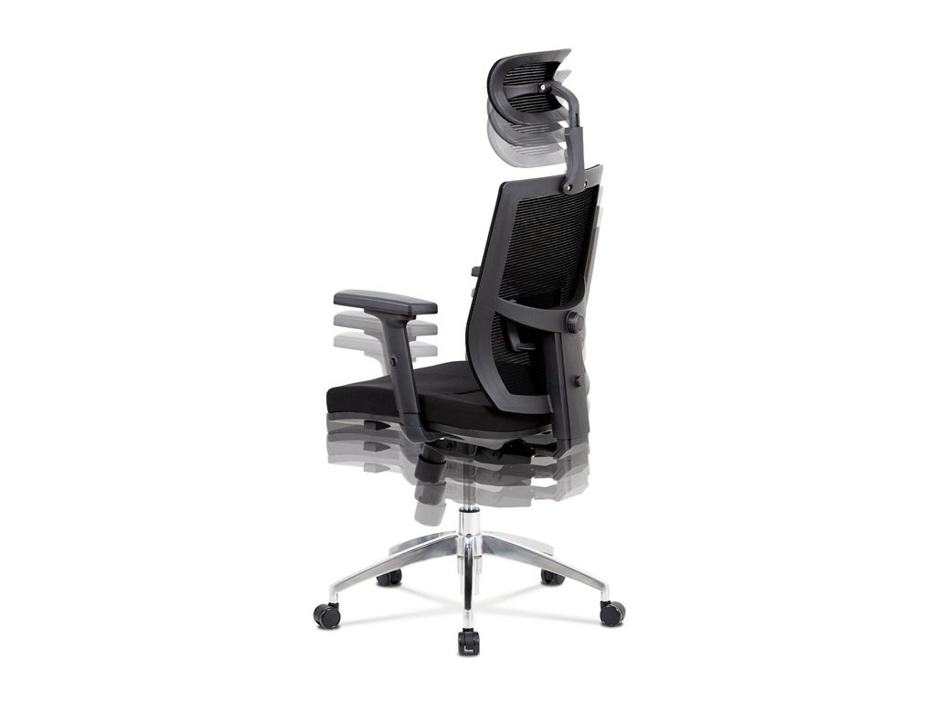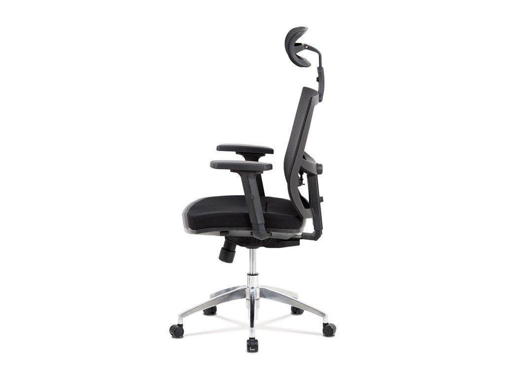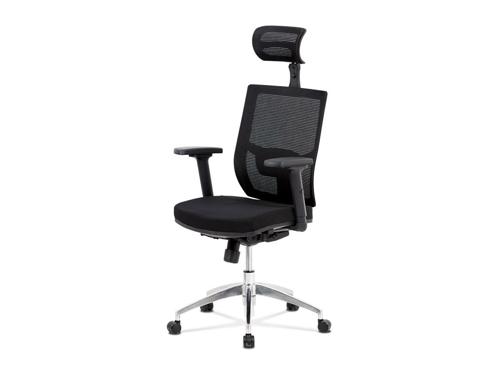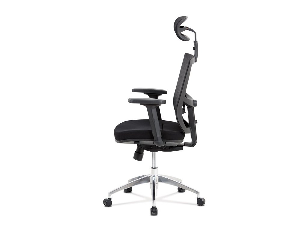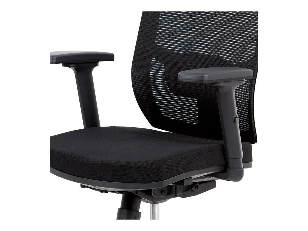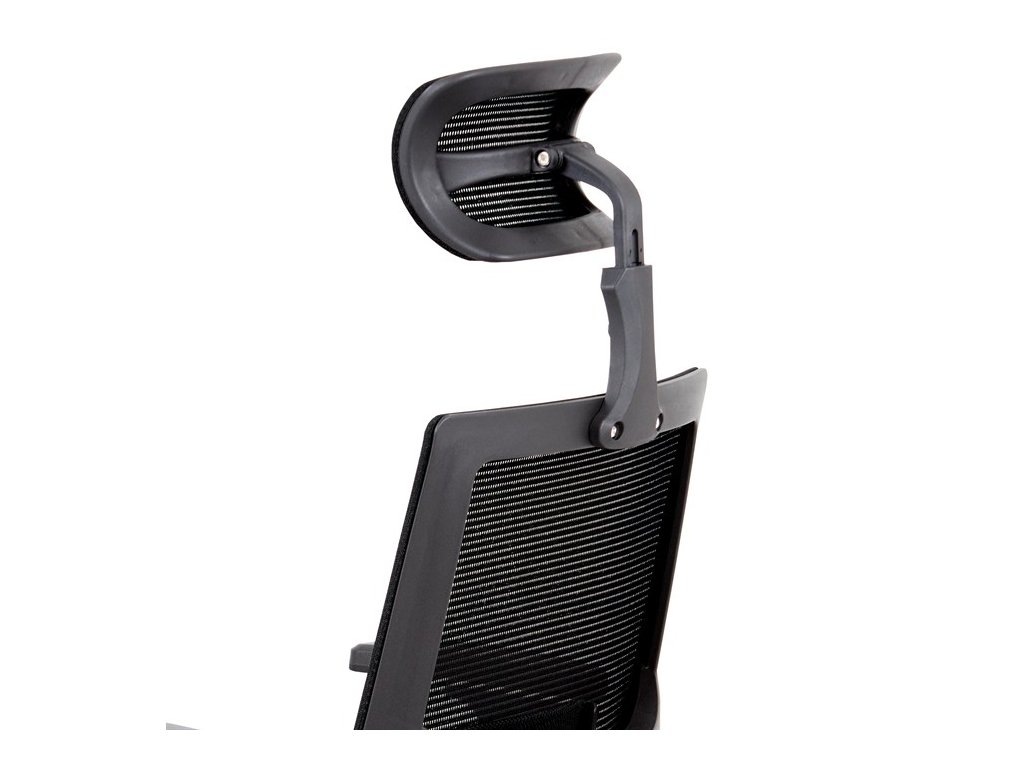 Kancelárska stolička s operadlom z čiernej sieťoviny MESH a čiernym látkovým sedákom. Stolička je výškovo nastaviteľná, vybavená synchrónnym mechanizmom. Plastové podrúčky sú polohovacie a výškovo nastaviteľné (2D). Výškovo nastaviteľné je aj operadlo. Vďaka malej páčke môžete samostatne polohovať sedák dopredu alebo dozadu. Sieťovaná, výškovo nastaviteľná a polohovacia opierka hlavy a nastaviteľná bedrová opierka. Kríž z lešteného hliníka s kolieskami vhodnými na tvrdé typy podláh.