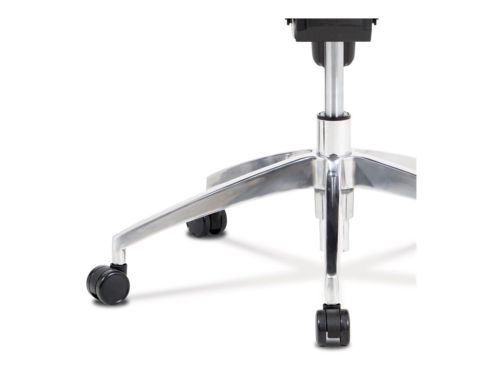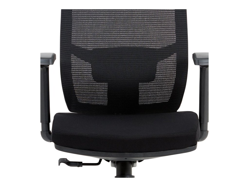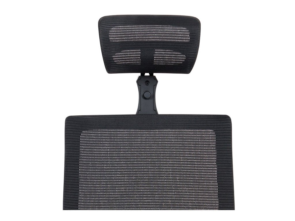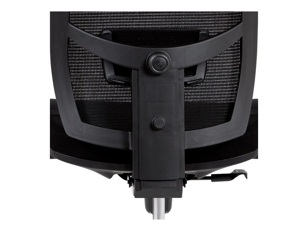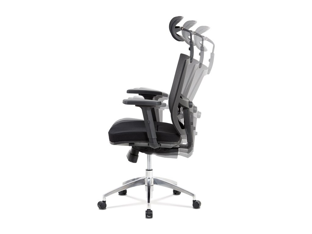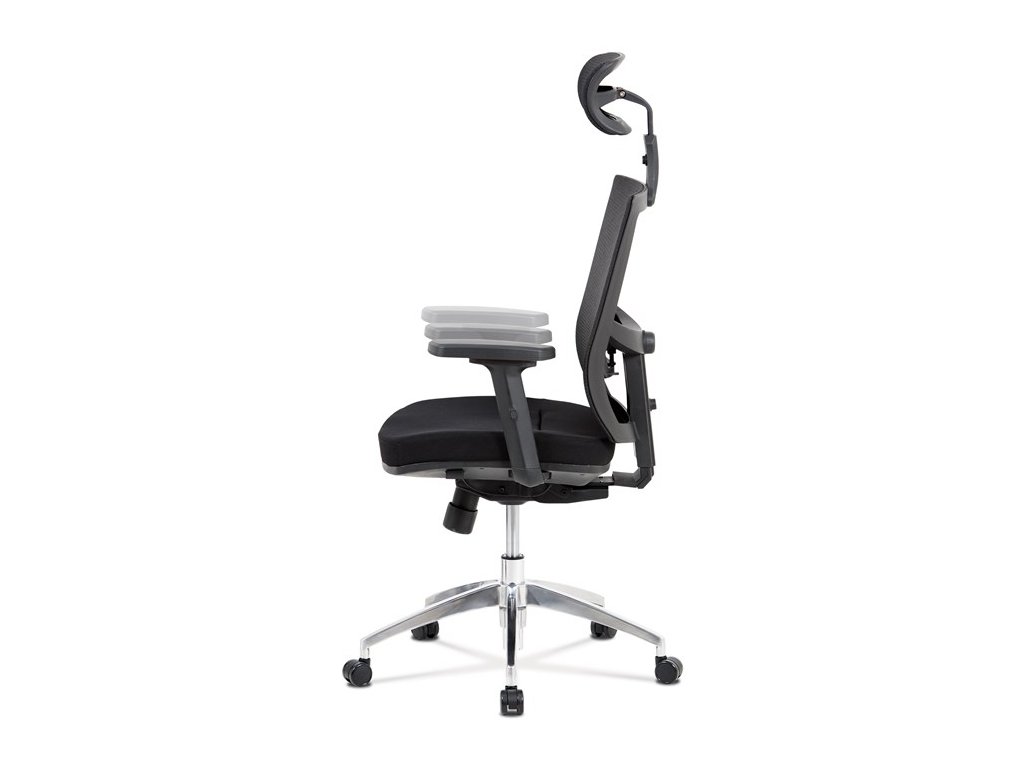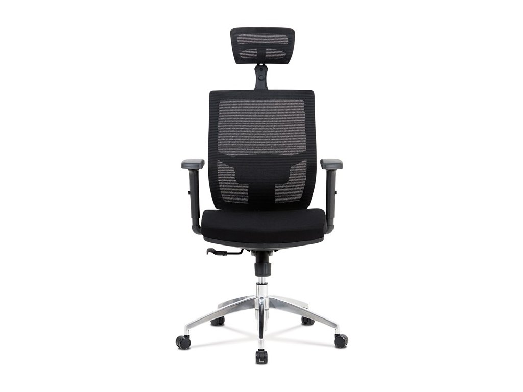 Kancelárska stolička s operadlom z čiernej sieťoviny MESH a čiernym látkovým sedákom. Stolička je výškovo nastaviteľná, vybavená synchrónnym mechanizmom. Plastové podrúčky sú polohovacie a výškovo nastaviteľné (2D). Výškovo nastaviteľné je aj operadlo. Vďaka malej páčke môžete samostatne polohovať sedák dopredu alebo dozadu. Sieťovaná, výškovo nastaviteľná a polohovacia opierka hlavy a nastaviteľná bedrová opierka. Kríž z lešteného hliníka s kolieskami vhodnými na tvrdé typy podláh.