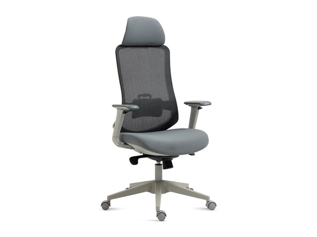 Kancelárska stolička s vysokým operadlom, čalúneným v priedušnom materiáli MESH, s nastaviteľnou bedrovou opierkou. Sedák je zmäkčený, s poťahom v šedej látke. Pre väčšie pohodlie je stolička vybavená synchrónnou mechanikou s polohovacou aretáciou, podhlavníkom a 4D podrúčkami z vrchnej časti z PU peny. Kríž z odolného plastu je opatrený kolieskami na tvrdé povrchy.