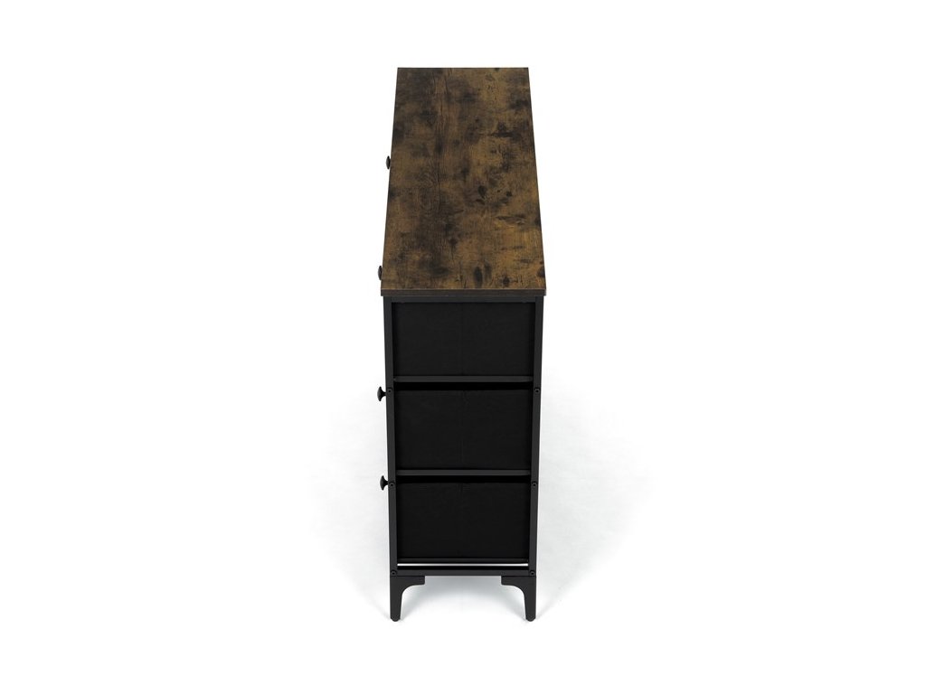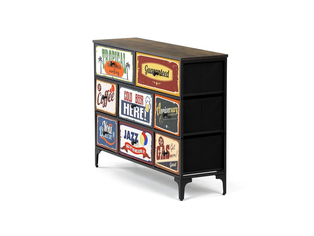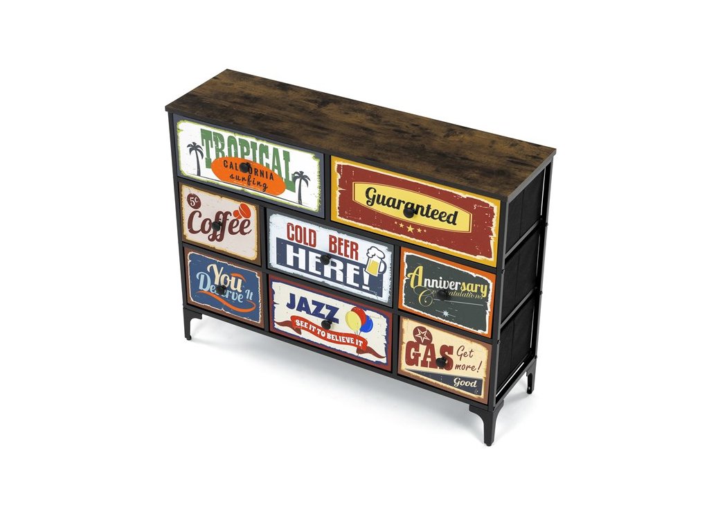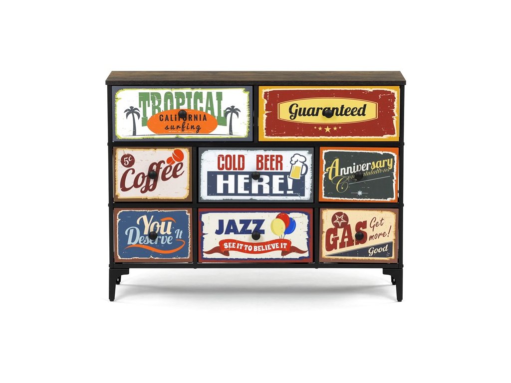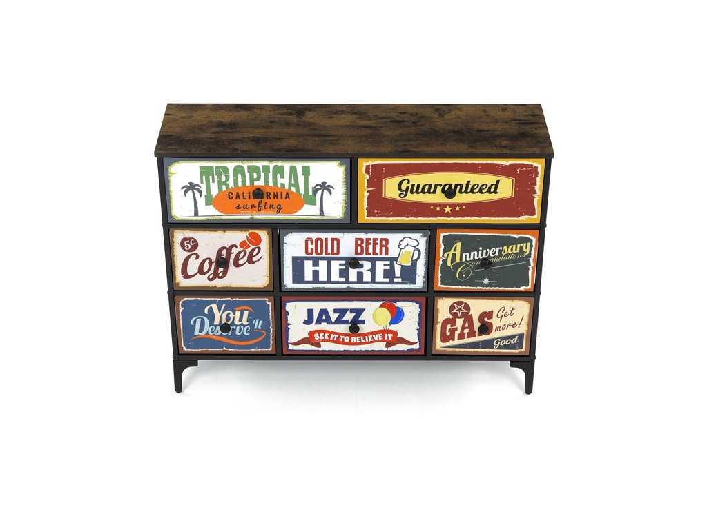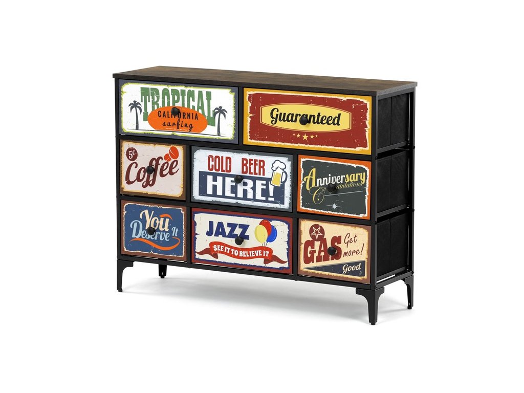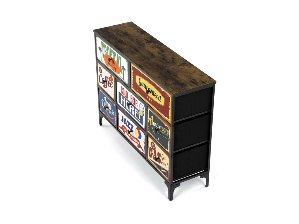 Retro komoda značky Autronic prinesie do vášho interiéru jedinečný štýl a originalitu. Textilné čelá zásuviek s výplňou HDF a vintage potlačou navodzujú atmosféru starých amerických barov a jazzových klubov. Kombinácia čiernej kovovej konštrukcie, dosky v dekore starého dreva a ozdobných nôh dodáva nábytku robustný, ale zároveň elegantný vzhľad. Korpus zásuviek je vyrobený z netkanej textílie s výplňou HDF, čo zaisťuje ich ľahkosť a jednoduchú manipuláciu. Ideálny doplnok do obývacej izby alebo štýlovej kaviarne, kde sa stane neprehliadnuteľným prvkom.