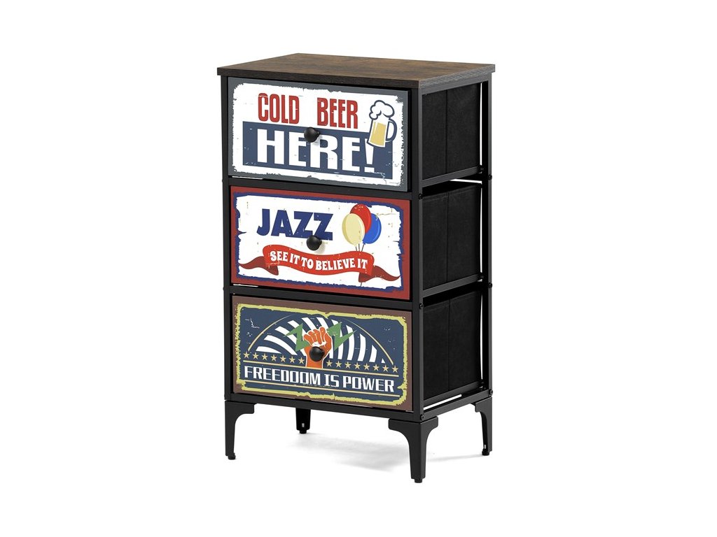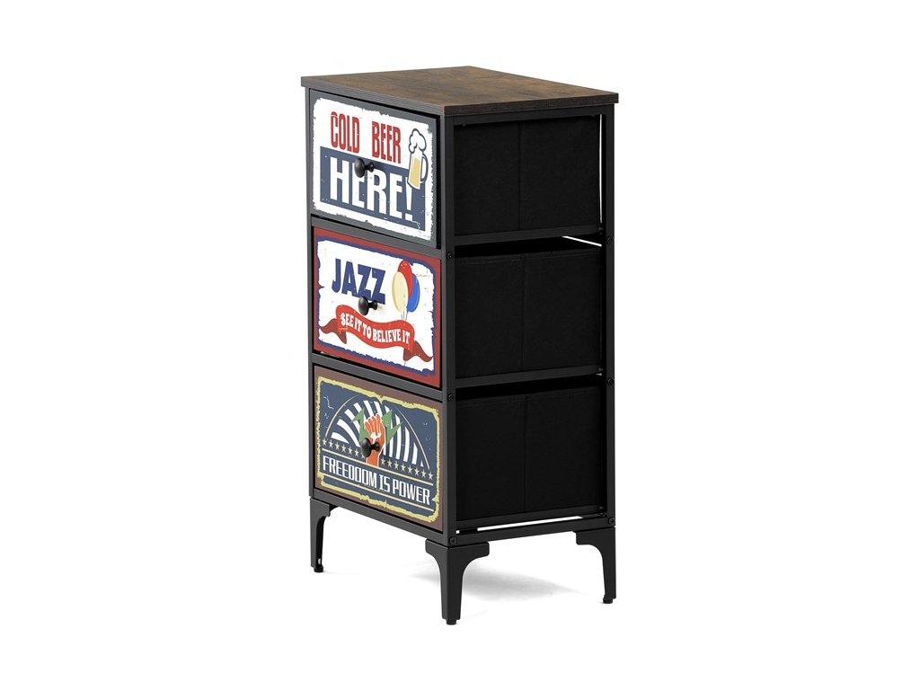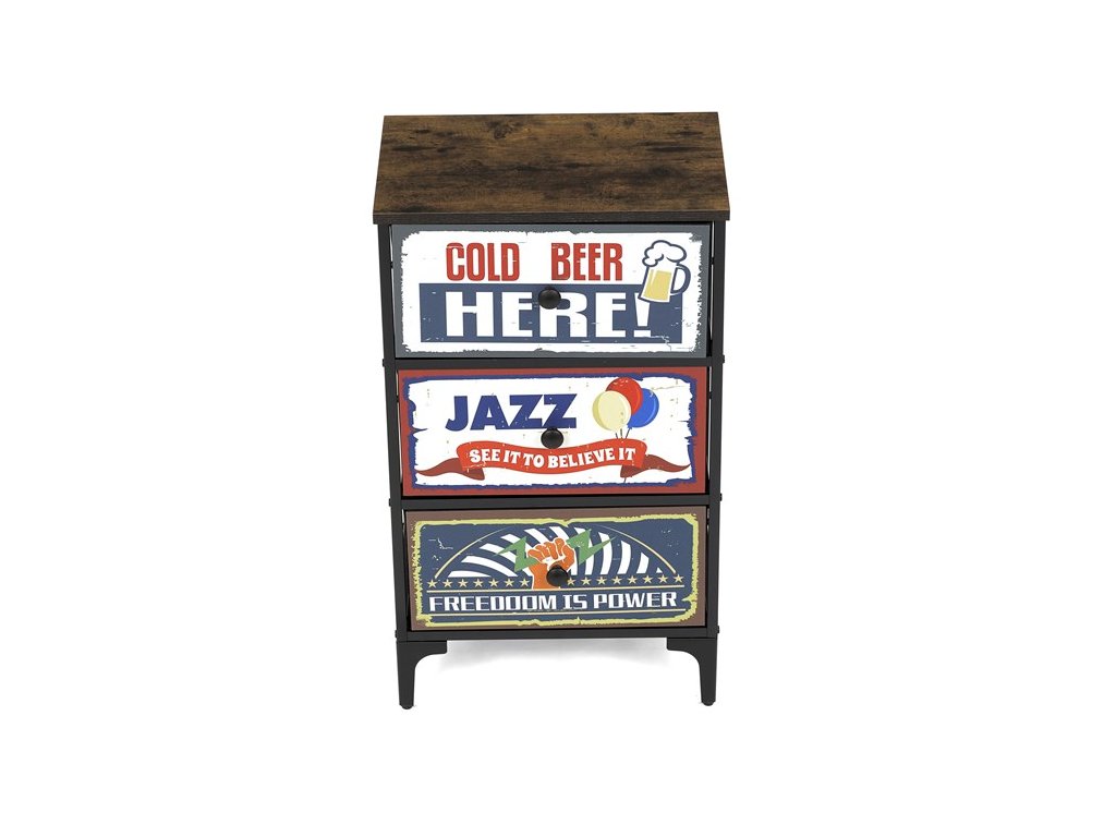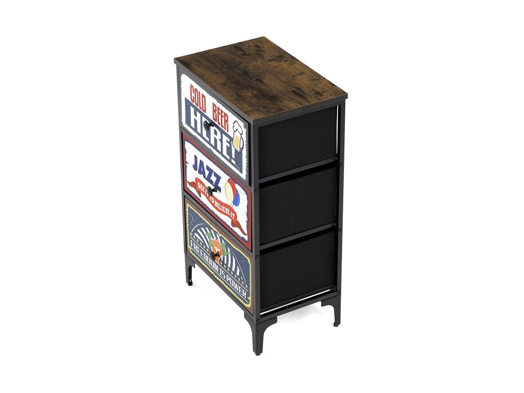 Retro komoda značky Autronic prinesie do vášho interiéru jedinečný štýl a originalitu. Textilné čelá zásuviek s výplňou HDF a vintage potlačou navodzujú atmosféru starých amerických barov a jazzových klubov. Kombinácia čiernej kovovej konštrukcie, dosky v dekore starého dreva a ozdobných nôh dodáva nábytku robustný, ale zároveň elegantný vzhľad. Korpus zásuviek je vyrobený z netkanej textílie s výplňou HDF, čo zaisťuje ich ľahkosť a jednoduchú manipuláciu. Ideálny doplnok do obývacej izby alebo štýlovej kaviarne, kde sa stane neprehliadnuteľným prvkom.